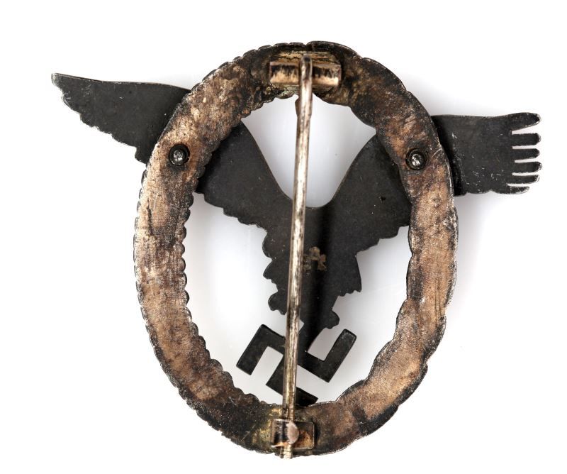 WWII German Luftwaffe qualification badge, maker marked "A" for Assmann. Needle pin back. Some toning, otherwise excellent. This lot has a reserve.