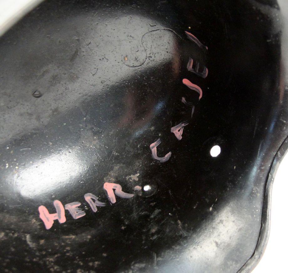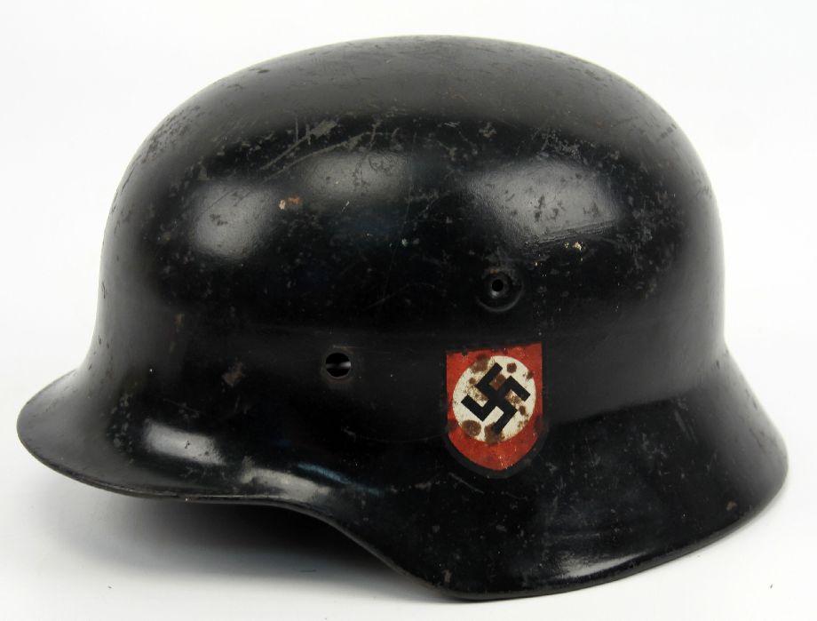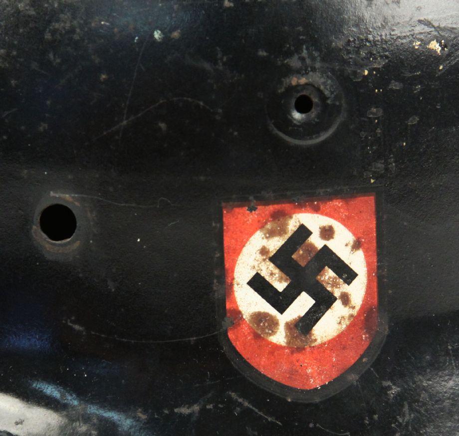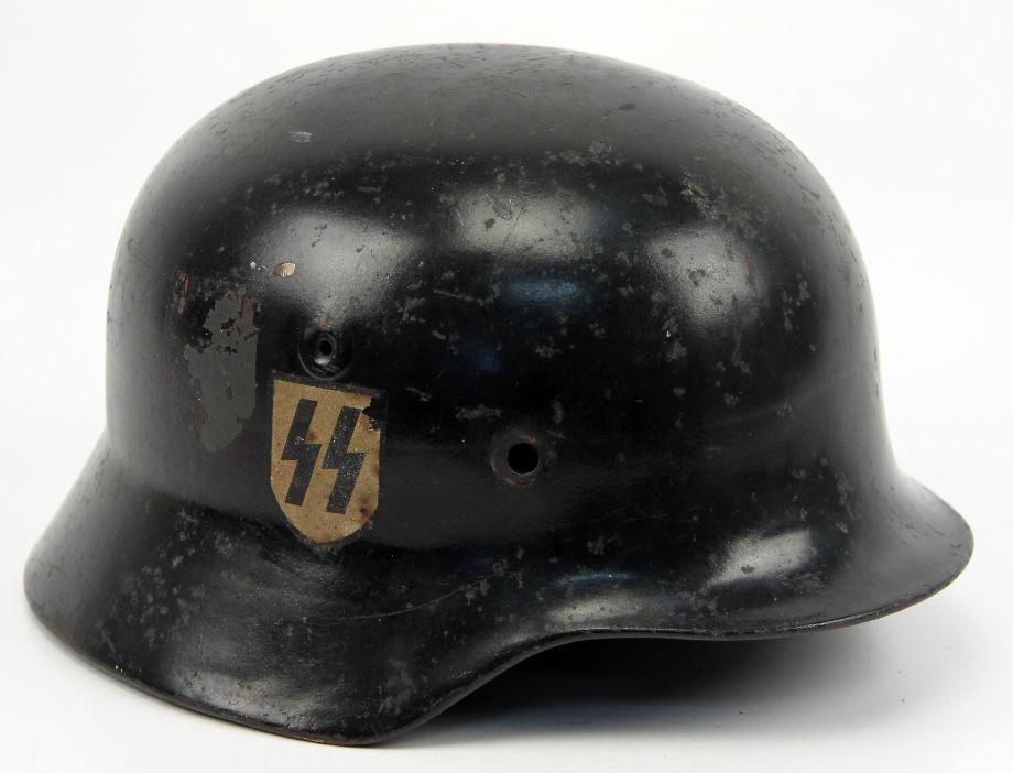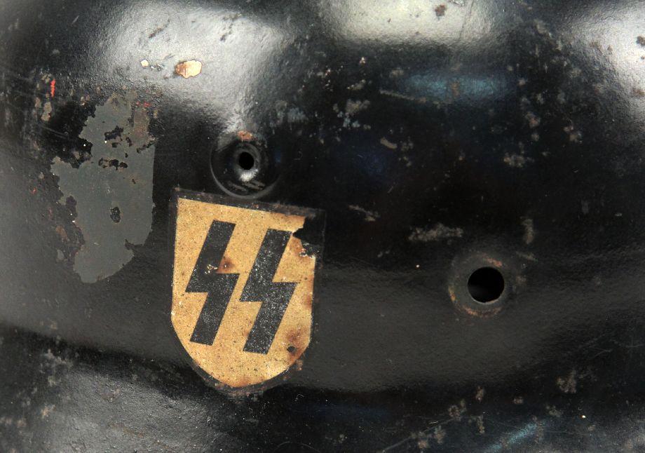WWII German M-42 helmet shell. Spurious SS decal on right, party shield on left appears period. No liner. No dents.