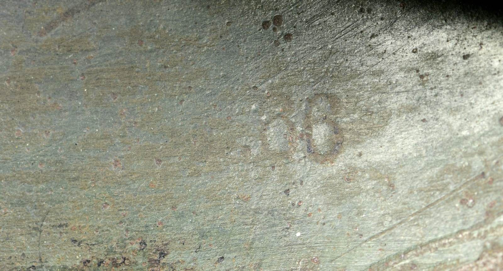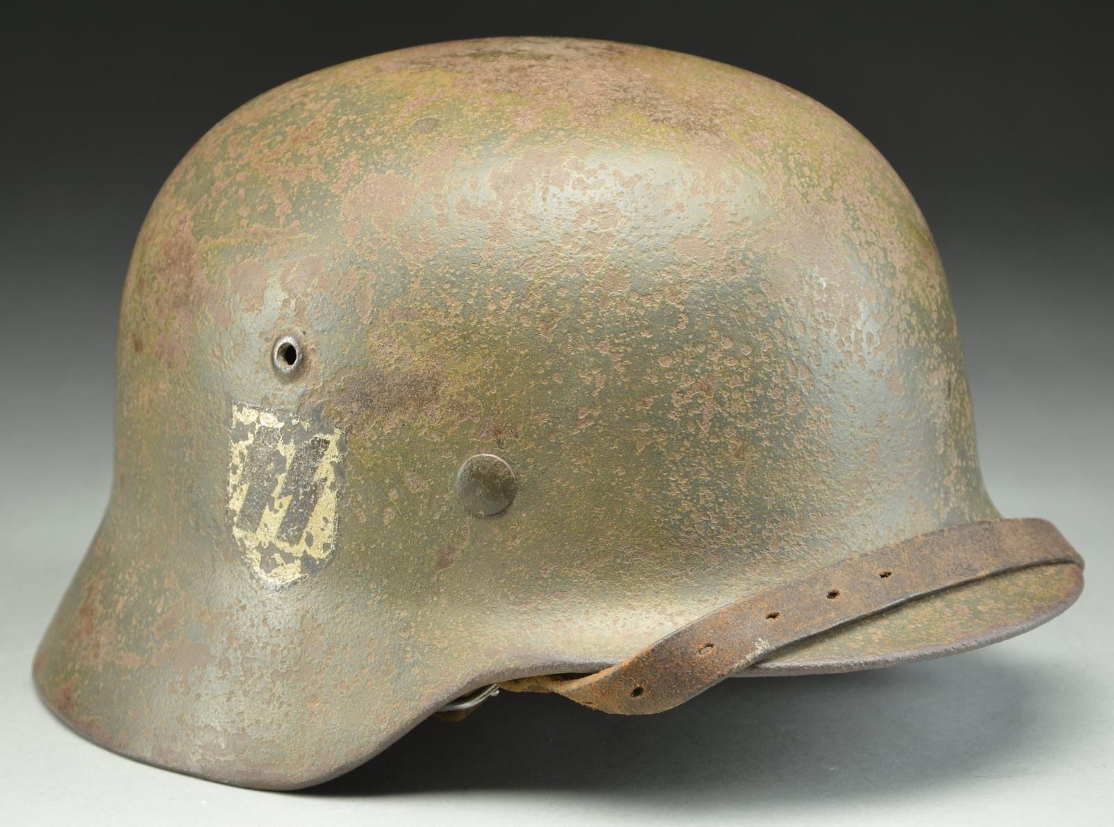 This helmet has a deep green painted finish with an SS decal on the right side and a party symbol decal on the left. Despite the wear to the decals and the painted finish, we feel that the decals and finish may possibly be post WWII enhancements. Original leather chinstrap and 8-tongue brown leather liner. The inside rear of the helmet is stamped “3055” and the inside left is stamped “__.66”. The rear inside of the helmet also has the white painted letters “X.V.P.”. CONDITION: helmet’s current finish is approx. 50%. The SS decal is about 65%. Party decal is about 75%. Chinstrap & liner are solid, but show expected wear. PROVENANCE: From the Lifelong Collection of Glen E. Mattox. (02-18255/BF). $500-1,000.