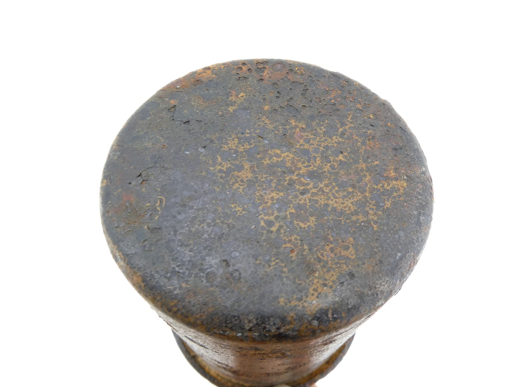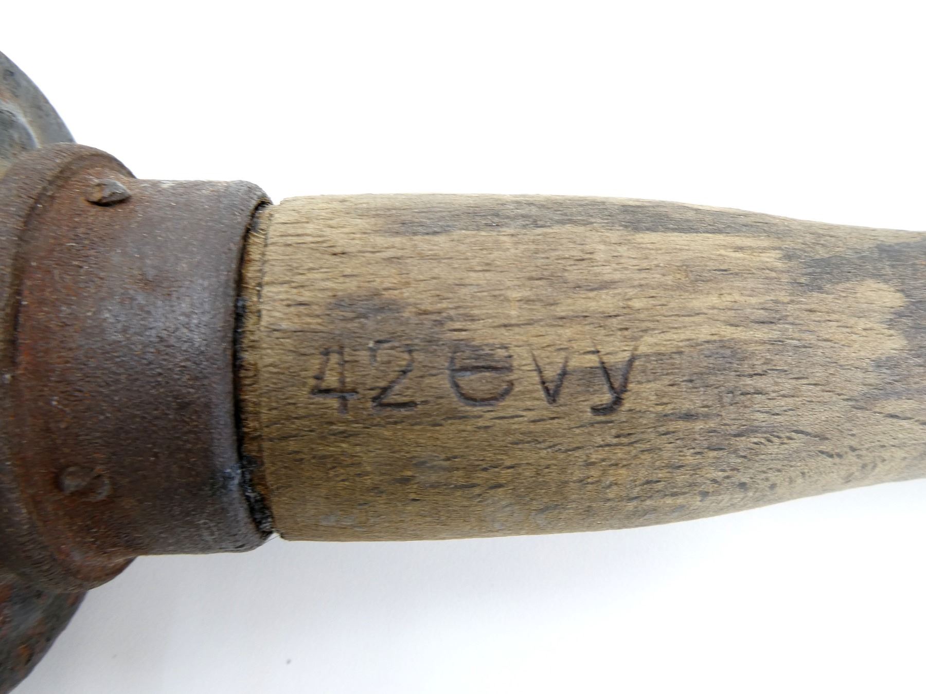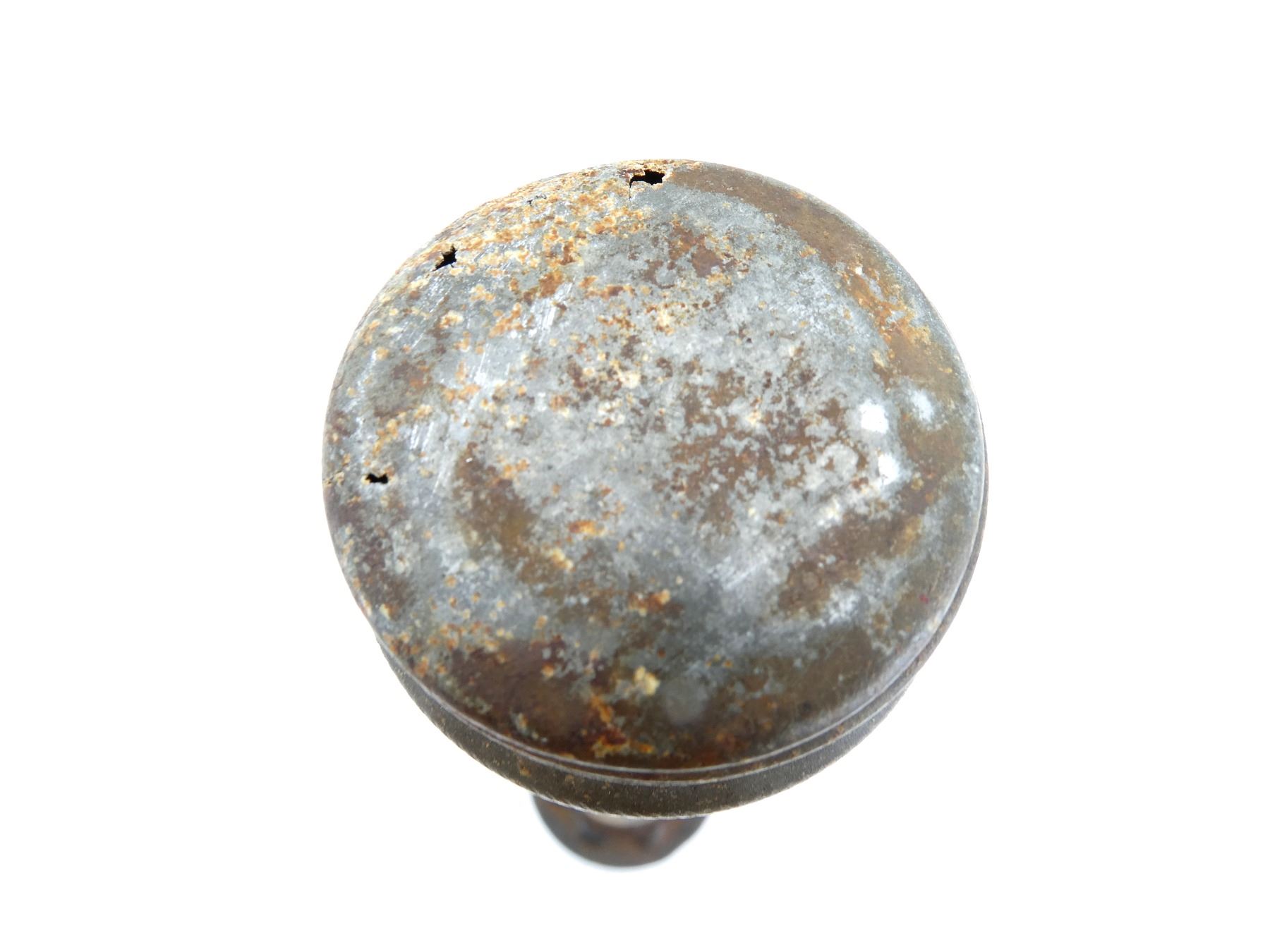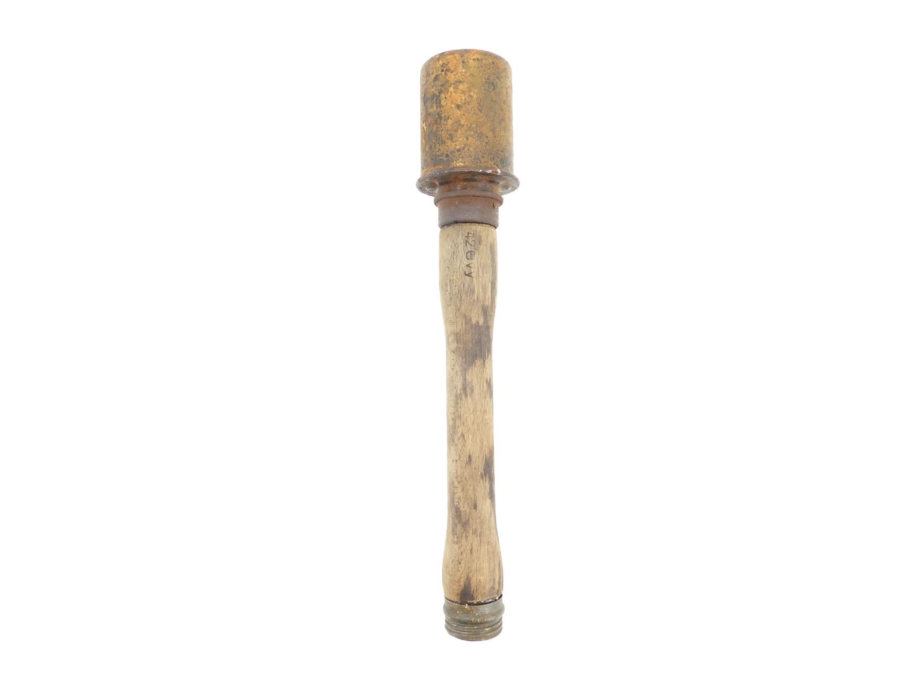 (1) STICK GRENADE, CONSIGNOR STATES: "DEACTIVATED ORIGINAL M24 GRENADE", WOOD WITH METAL ENDS, BOTTOM CAP UN-SCREWS, FAINT / UN-CLEAR MARKINGS ON TOP (RUSTED / PITTED), WOOD MARKED: "42 EVY", SHOWS AGE / WEAR / TEAR, APPROX. 2.5" DIA. & OAL APPROX. 14.25". SEE PHOTOS.