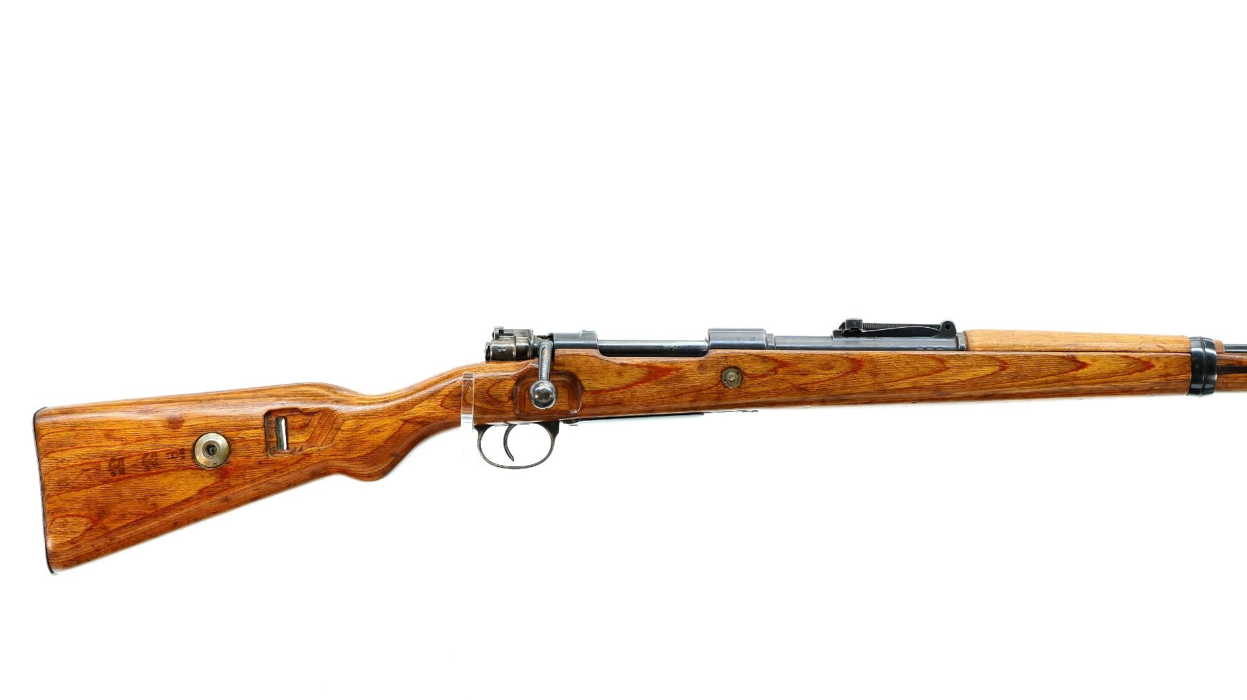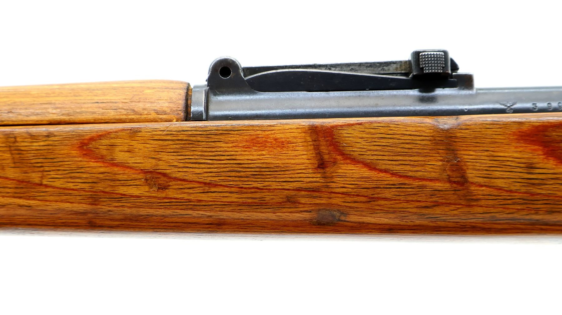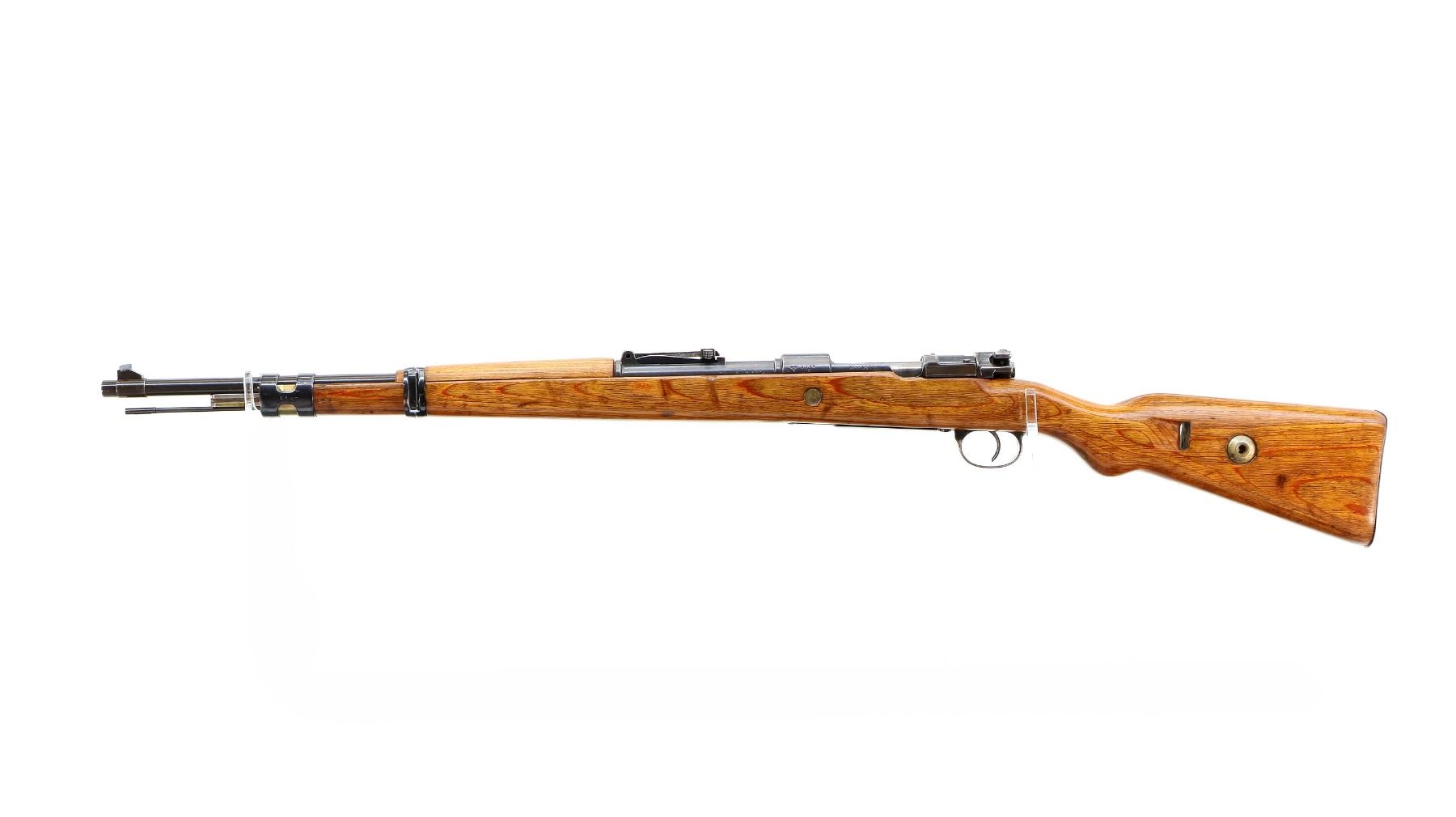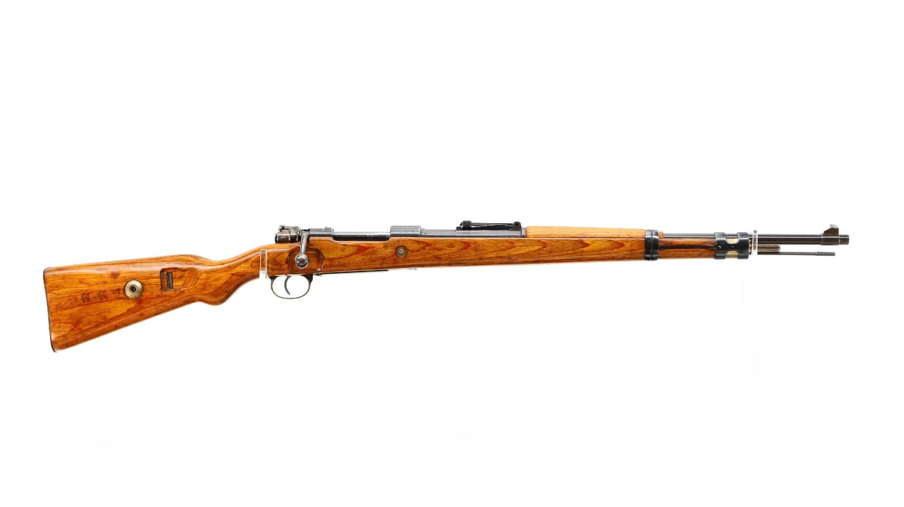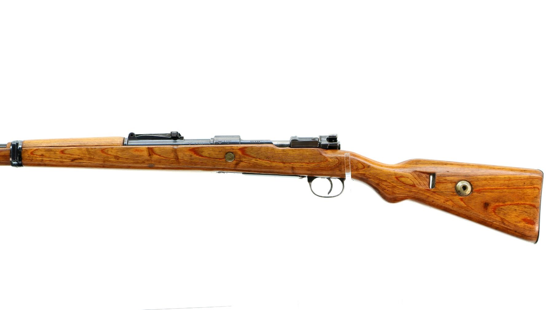 Main Description: Manufactured by 42 (Mauser Oberndorf) 1940. Bolt handle unnumbered, some small parts match, others do not. Barley corn front sight with ramp, adjustable u notched rear sight, blued finish, turned down bolt handle. Two piece full military laminate wood stocks, pistol grip, smooth steel butt plate and stock disk, rear slot front swivel, cleaning rod, bayonet lug.