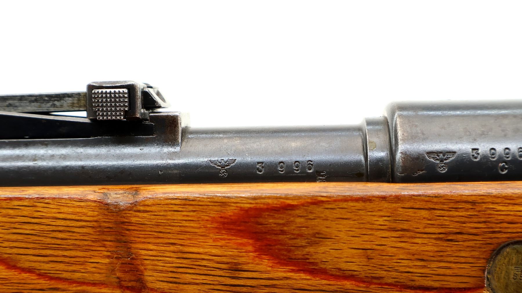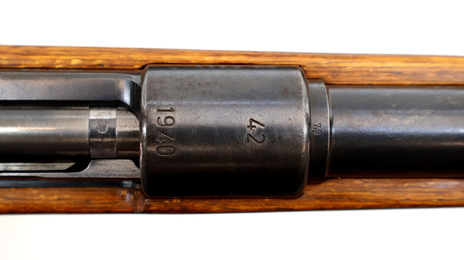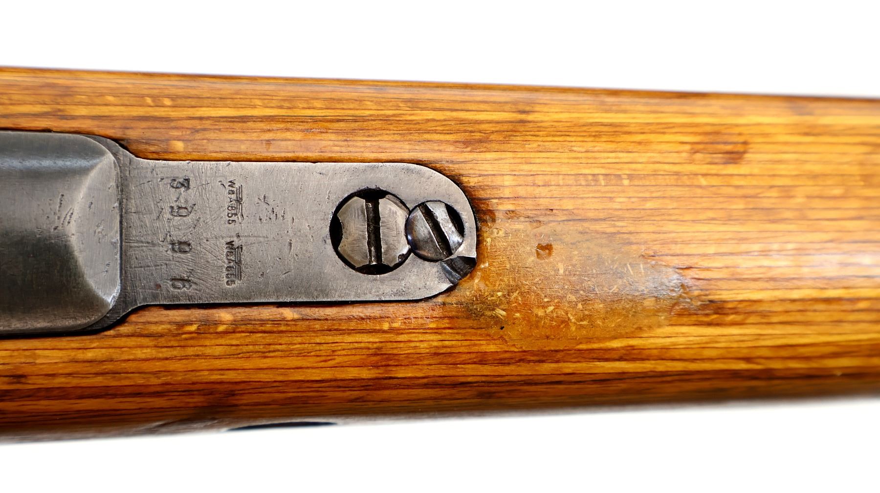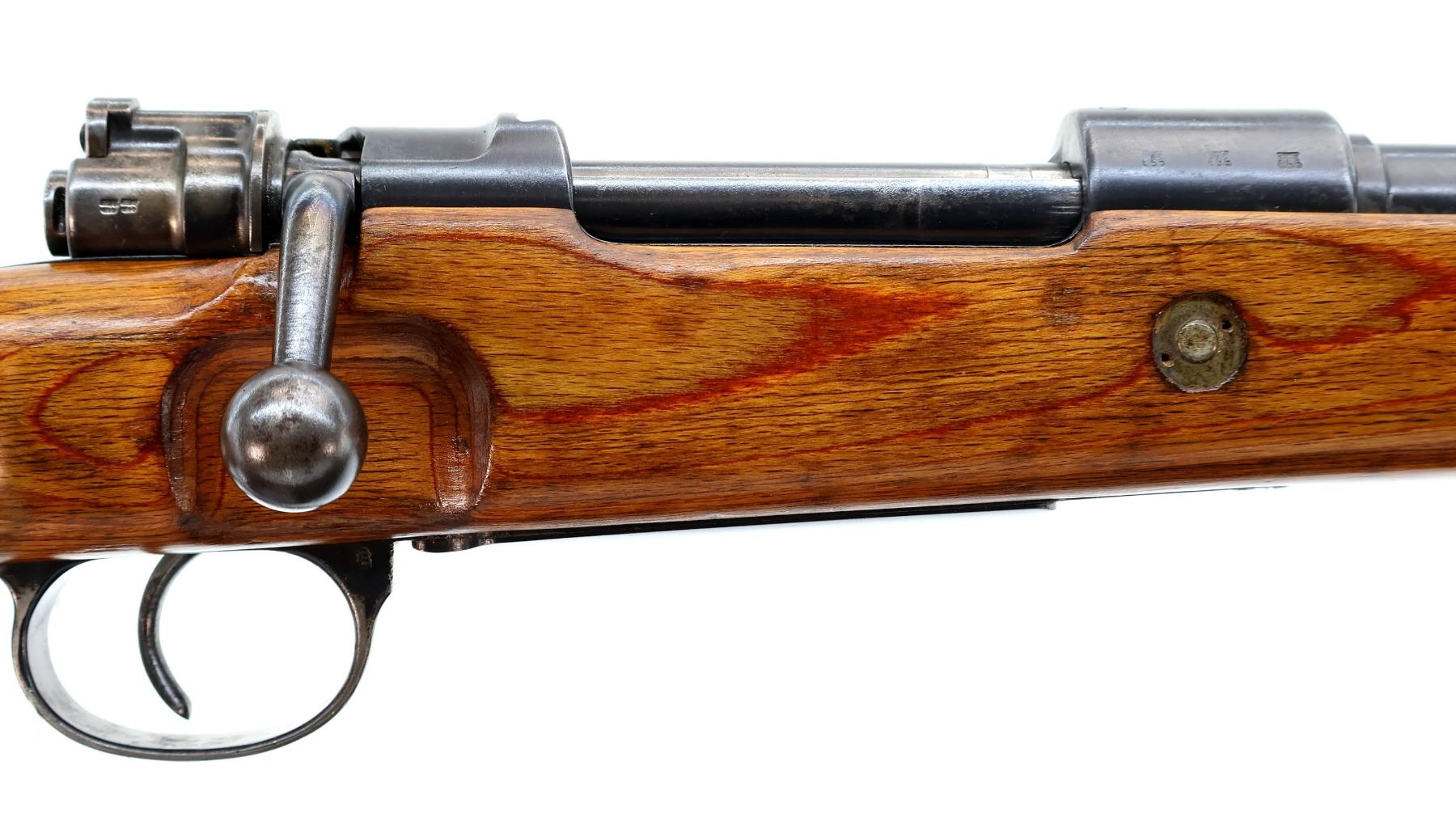 Main Description: Manufactured by 42 (Mauser Oberndorf) 1940. Bolt handle unnumbered, some small parts match, others do not. Barley corn front sight with ramp, adjustable u notched rear sight, blued finish, turned down bolt handle. Two piece full military laminate wood stocks, pistol grip, smooth steel butt plate and stock disk, rear slot front swivel, cleaning rod, bayonet lug.