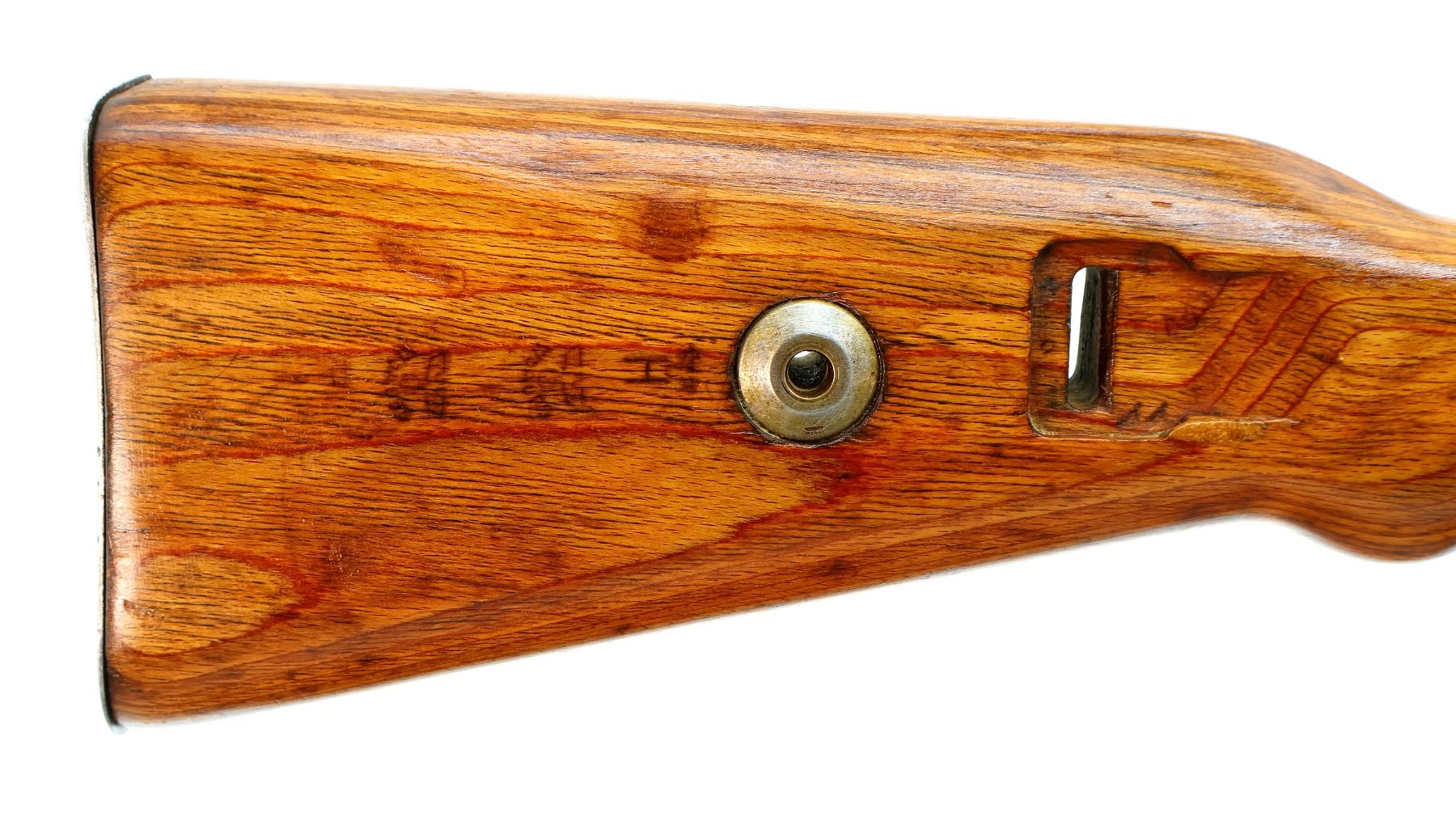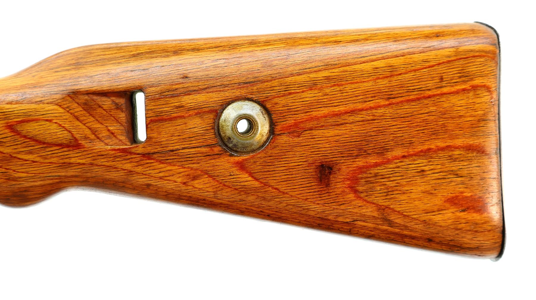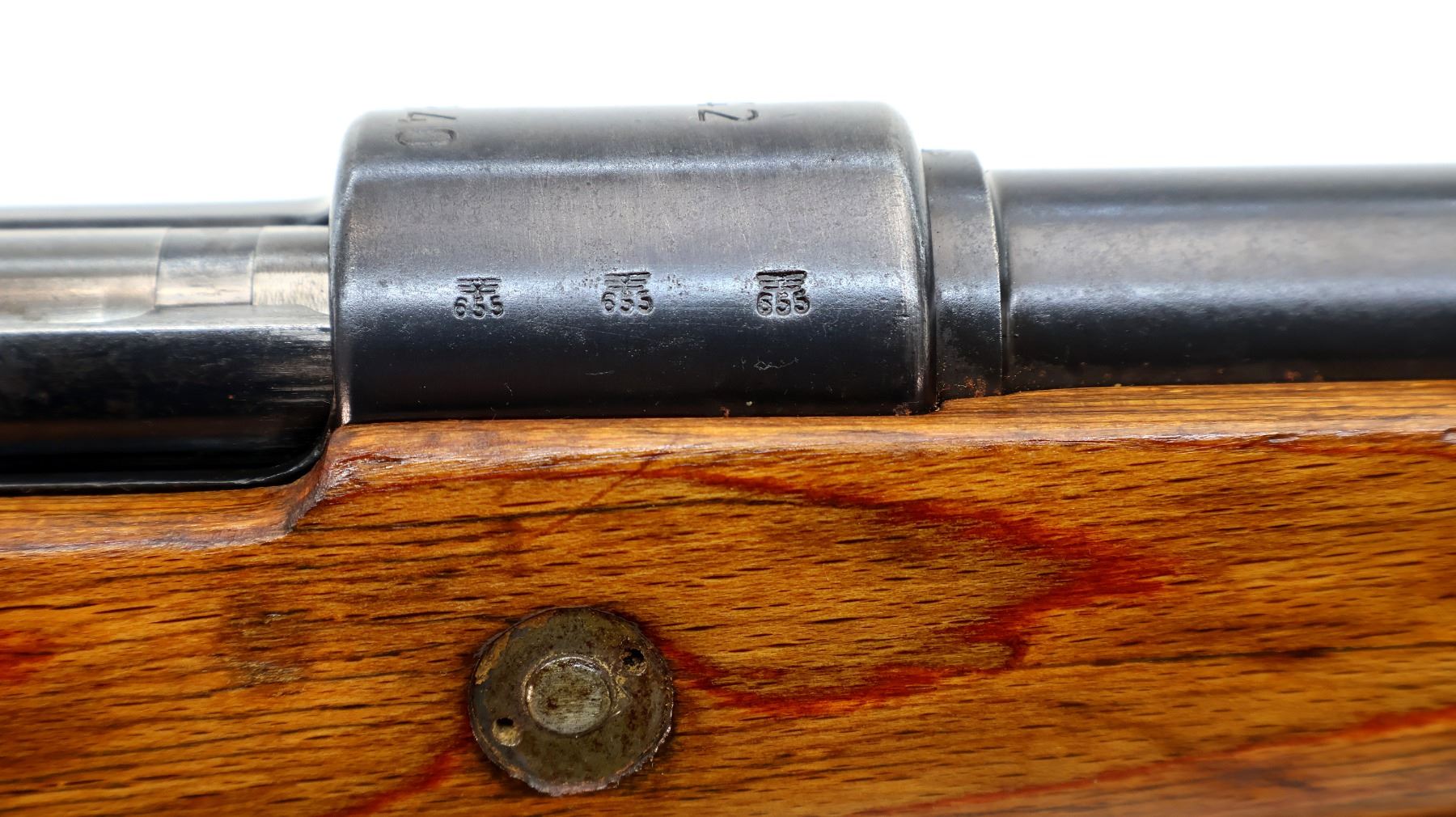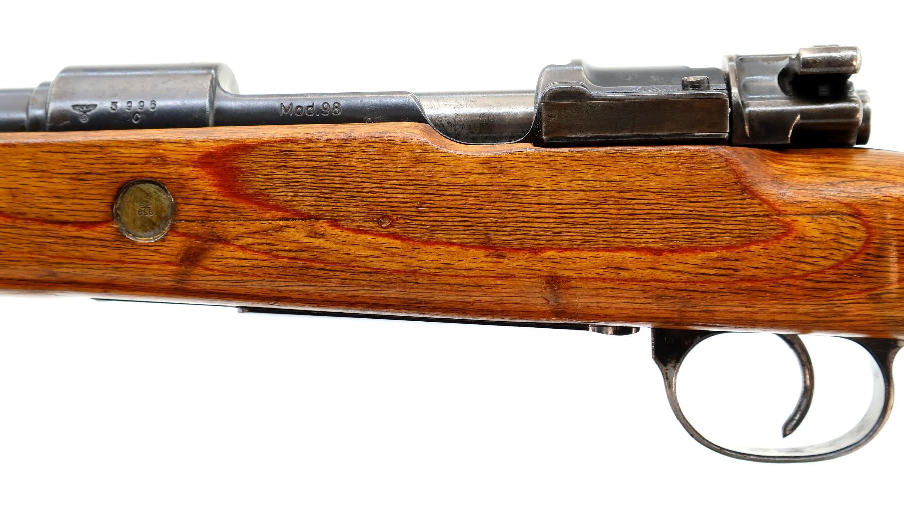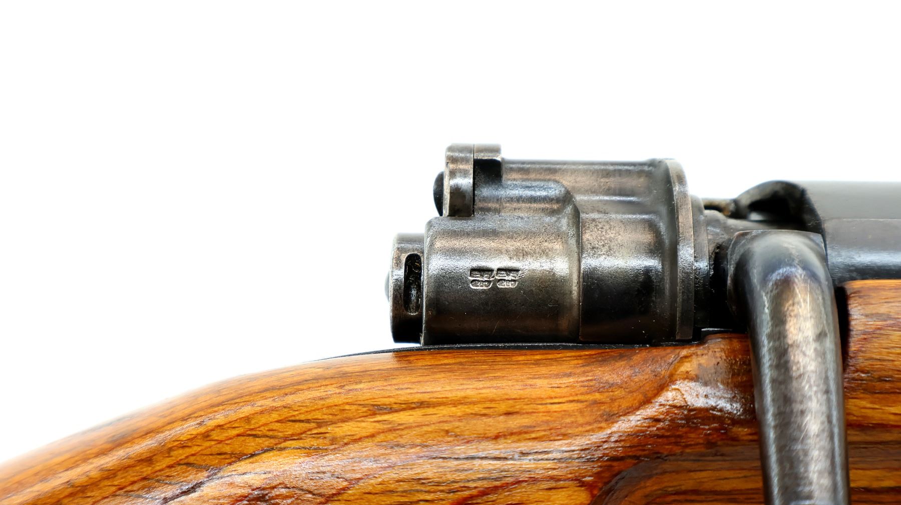 Main Description: Manufactured by 42 (Mauser Oberndorf) 1940. Bolt handle unnumbered, some small parts match, others do not. Barley corn front sight with ramp, adjustable u notched rear sight, blued finish, turned down bolt handle. Two piece full military laminate wood stocks, pistol grip, smooth steel butt plate and stock disk, rear slot front swivel, cleaning rod, bayonet lug.