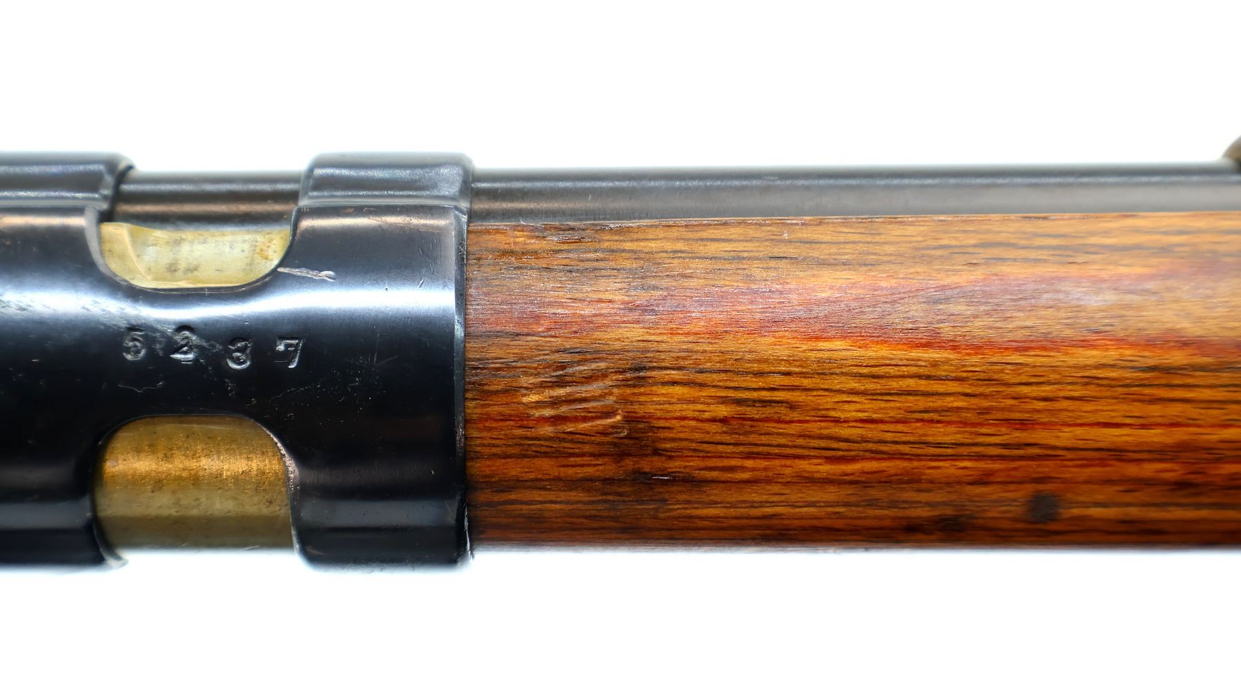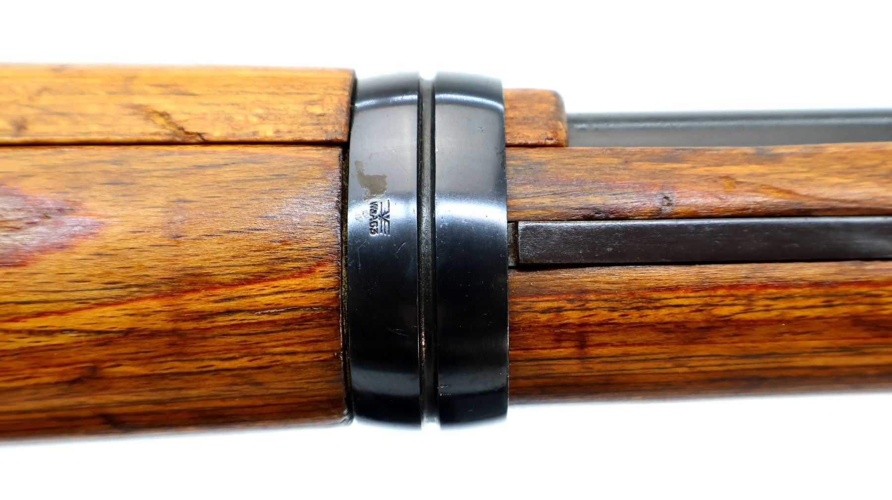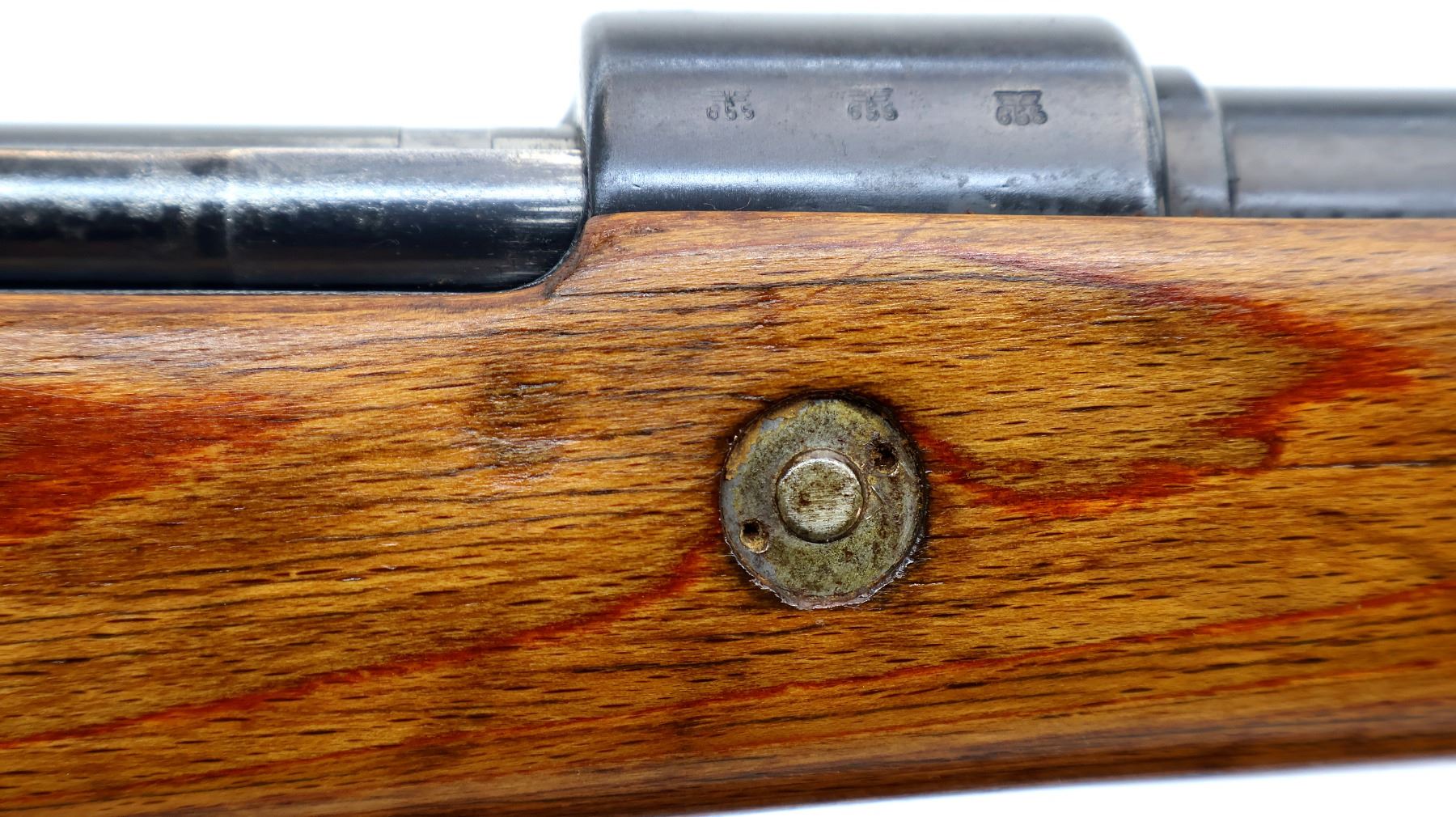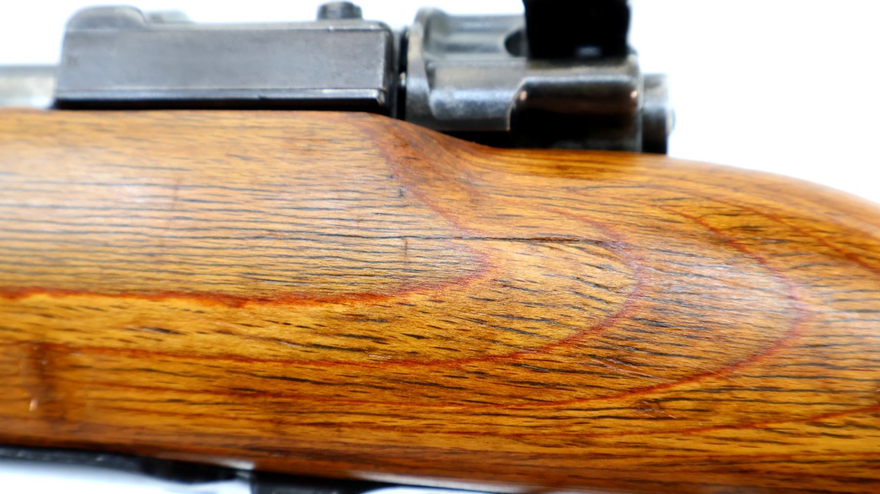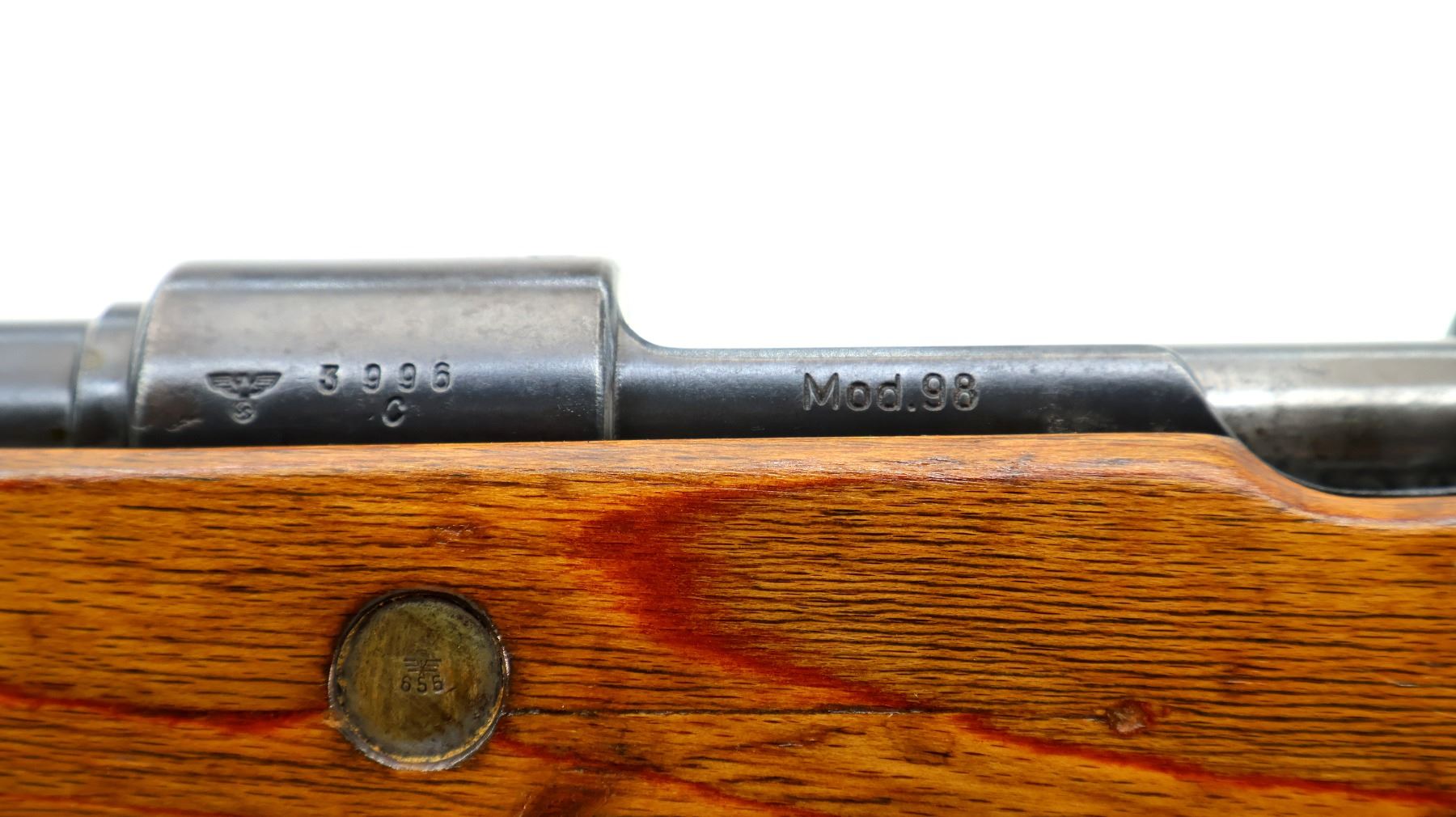 Main Description: Manufactured by 42 (Mauser Oberndorf) 1940. Bolt handle unnumbered, some small parts match, others do not. Barley corn front sight with ramp, adjustable u notched rear sight, blued finish, turned down bolt handle. Two piece full military laminate wood stocks, pistol grip, smooth steel butt plate and stock disk, rear slot front swivel, cleaning rod, bayonet lug.