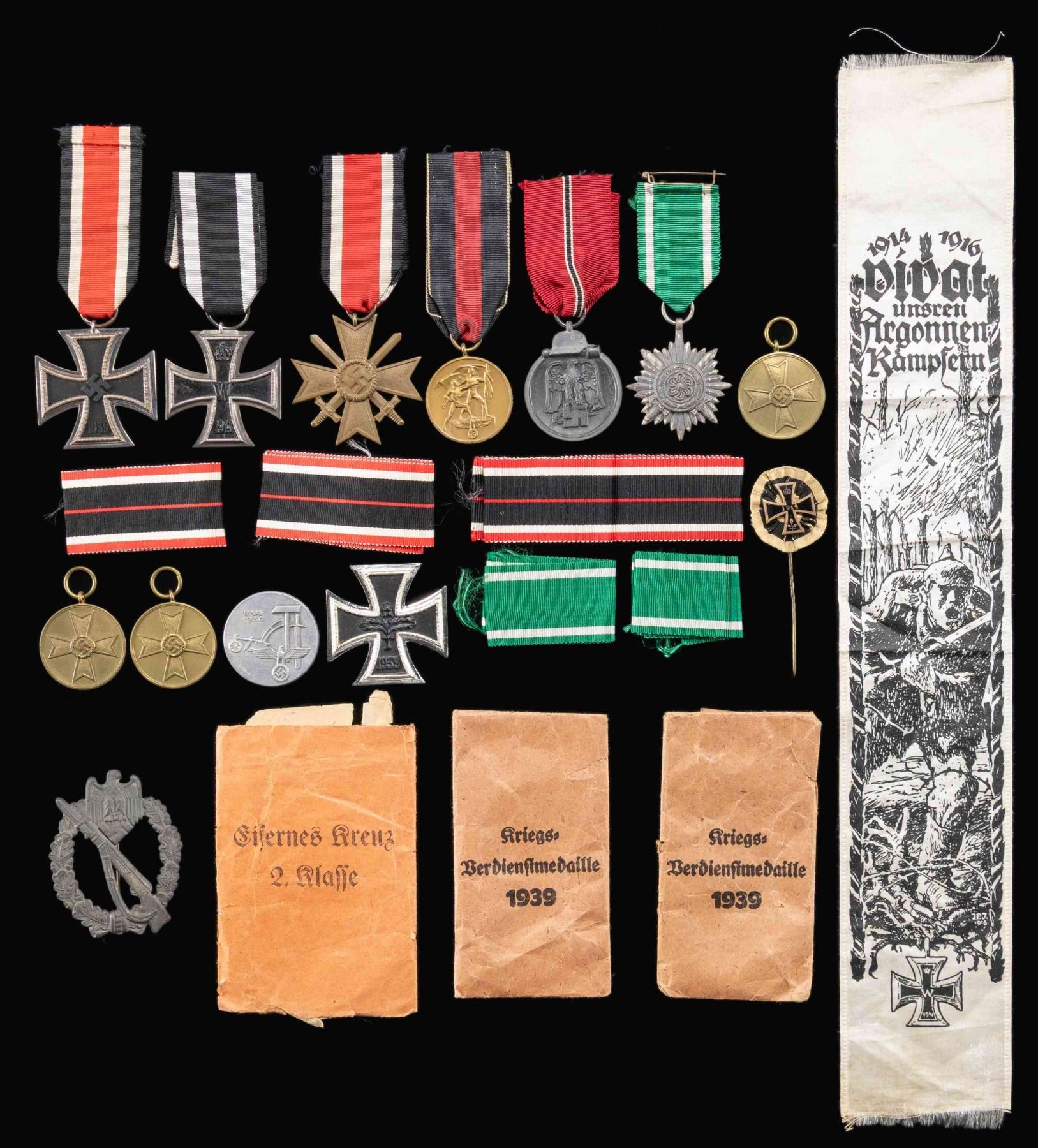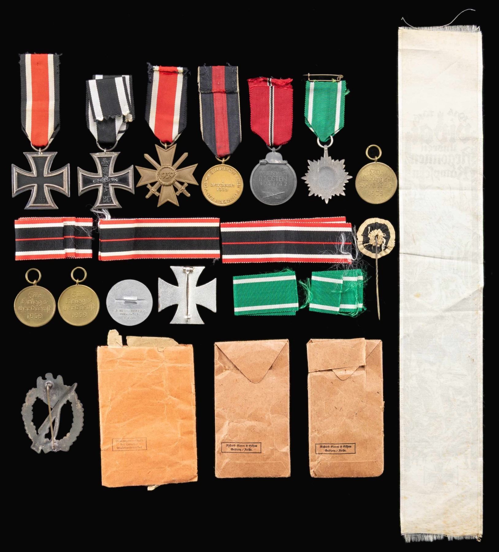 This fine lot of mostly WWII German pieces include 1 WWI 2nd Class Iron Cross with ribbon. / 1 Sudetenland medal with ribbon. / 1 Eastern Peoples medal 2nd class in silvered zinc. / 1 Infantry Assault Badge. / 1 WWII Iron Cross 2nd Class with ribbon and issue envelope. / 1 Russian Front medal with ribbon. / 1 War merit cross with swords and ribbon. / 1 Post WWII issued 1939 Iron Cross First class. Issued without the Party symbol in the center. / 1 WWI Iron cross stickpin in black enamel. / 1 Mai Day tinnie 1936, no pin. / 3 WWII War Service medals, two of which have their original issue envelopes. / 2 Unissued ribbons for Eastern Peoples medals. 1 WW1 commemorative ribbon. CONDITION: all items generally show light wear overall. (02-25058-2/.BF). $500-800.