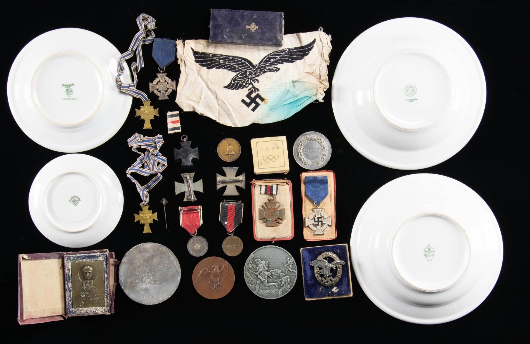 this large lot includes 1 Luftwaffe sport shirt eagle. / 1 NSFK 3 1/4' desk medal in a partial box. / 1 Desk medal for special achievements in animal breeding 2 1/2" desk medal. / 1 Third place 1939 Reichsparteitag 3 3/4" desk medal. / 1 Luftwaffe Observers badge of questionable age with partial box/pad. / 1 Olympic 1936 desk medal 1 1/2" in original box. / 1 Mother's Cross medal box. / 2 Gold Mother's Crosses with soiled ribbons. / 1 WWI Iron Cross 1st Class. / 1 WWII Iron Cross 1st Class. / 1 Anschluss medal with ribbon. / 1 Sudetenland medal with ribbon. / 1 WWI 1914-18 cross with swords in partial box. 1 WWI 1914-18 cross for next-of-kin with soiled ribbon. / 2 Soiled 25 Year Faithful service medals with ribbons and partial boxes. / 1 Rectangular 1939 sporting medal in partial box. / 1 "Blut und Boden" agricultural medal for best butter.in partial box. / 1 Faithful service medal stick pin. / 1 Stoneware saucer. / 1 DAF soup bowl marked on the reverse. / 1 SS bread plate with runes on the front and marked on the reverse. / 1 NSFK soup bowl with insignia on the front and marked on the reverse. CONDITION: most items show moderate to heavy wear. Ceramics are undamaged. (02-25023-5/BF). $700-1000.