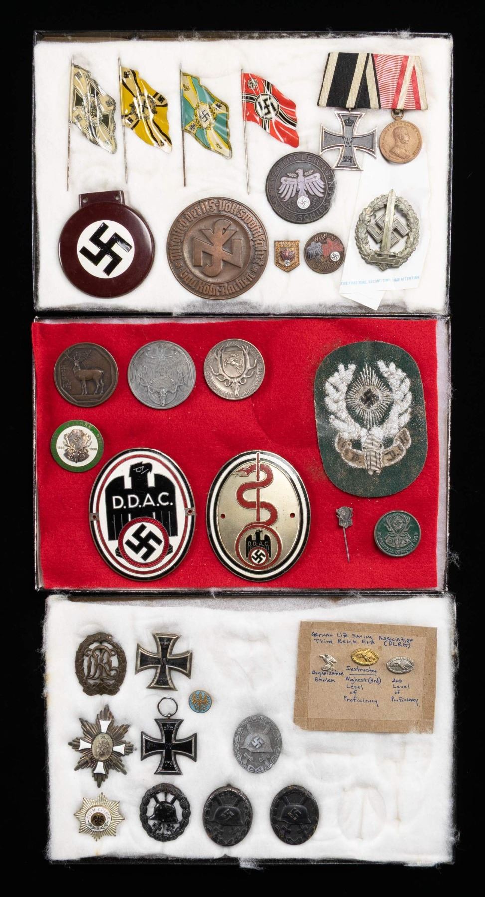 This lot a various WWII German items includes 1 NSV plaque medallion. / 1 Sports Badge for a wounded veteran. / 1 Medal bar of two WWI medals that include the Iron Cross 2nd Class and an Austrian bravery medal. / 1 Bakelite Party symbol possibly for a vehicle. / 1 Four metal flags carried by toy soldiers. / 3 Shooting award pins. / 1 Large DDAC enamel car tag. / 1 Large DDAC enamel car tag for a doctor. / 1 Hunting association sleeve patch with heavy oxidation. / 1 Hunting association silver medal for 1931. / 1 Hunting association tinnie for 1939. / 1 Hunting association stickpin. / 1 Hunting association green & white enamel pin from 1938. / 1 Pre WWII Hunting association pewter medal. / 1 bronze medal dated 1912 for hunting. / 3 DLRG membership pins of different levels. / 2 Black Wound Badges. 1 WWI Black Wound Badge. / 1 Silver Wound Badge with notable oxidation. / 1 DRL Sports Badge. / 1 WWI 1st Class Iron Cross. / 1 WWI 2nd Class Iron Cross. / 1 Imperial German field medal pinback star award. / 2 Prussian enamel pins. CONDITION: mist items show light wear unless otherwise noted. (02-24878-11/BF). $800-1200.