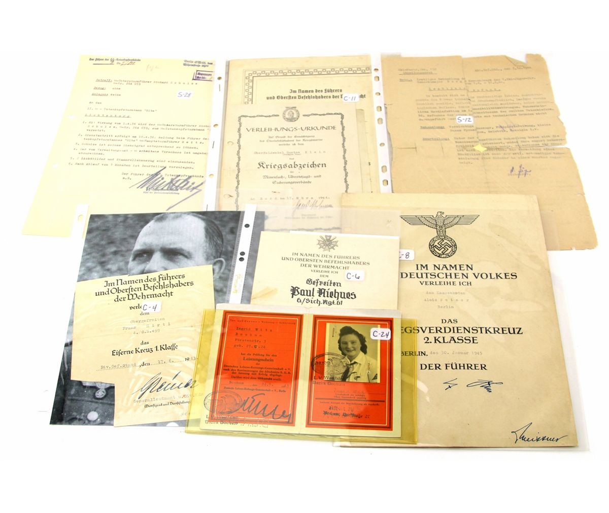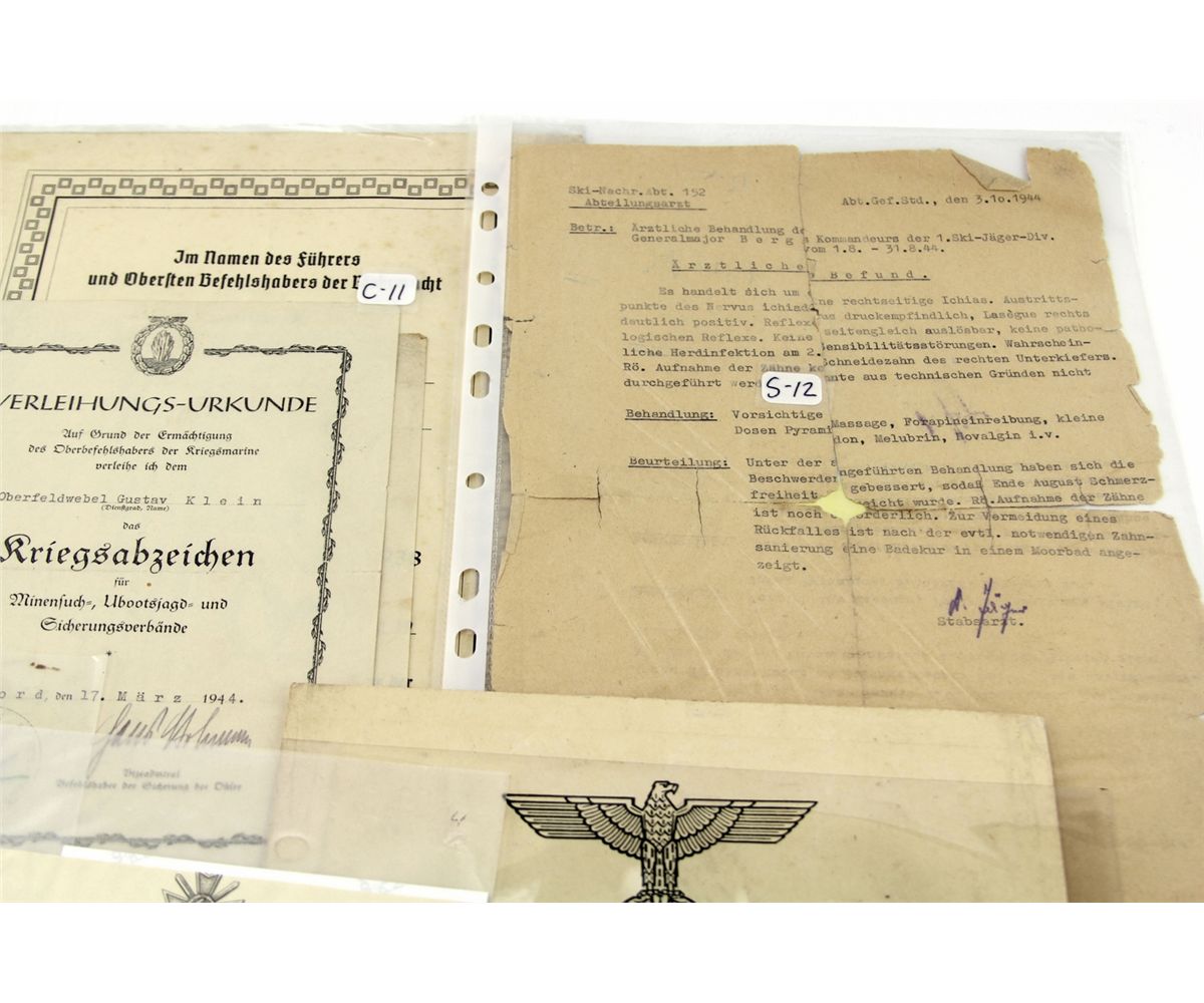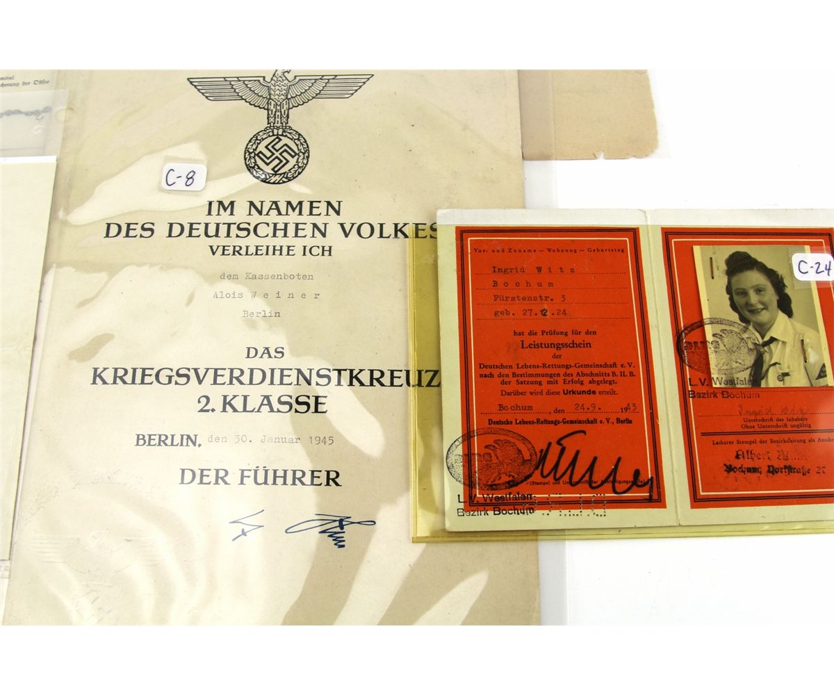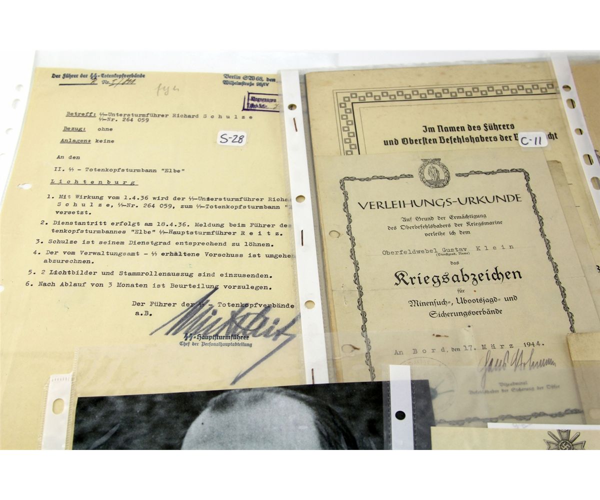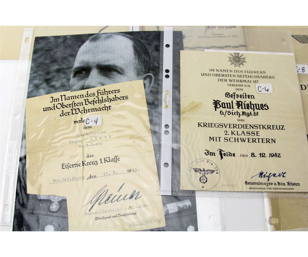 WWII GERMAN MILITARY DOCUMENTS AND CERTIFICATES Various WWII German documents and certificates, including award documents, photos, memos, and more, including some SS documents. Most all are signed by officers of various rank. Country: Germany Condition: Overall good