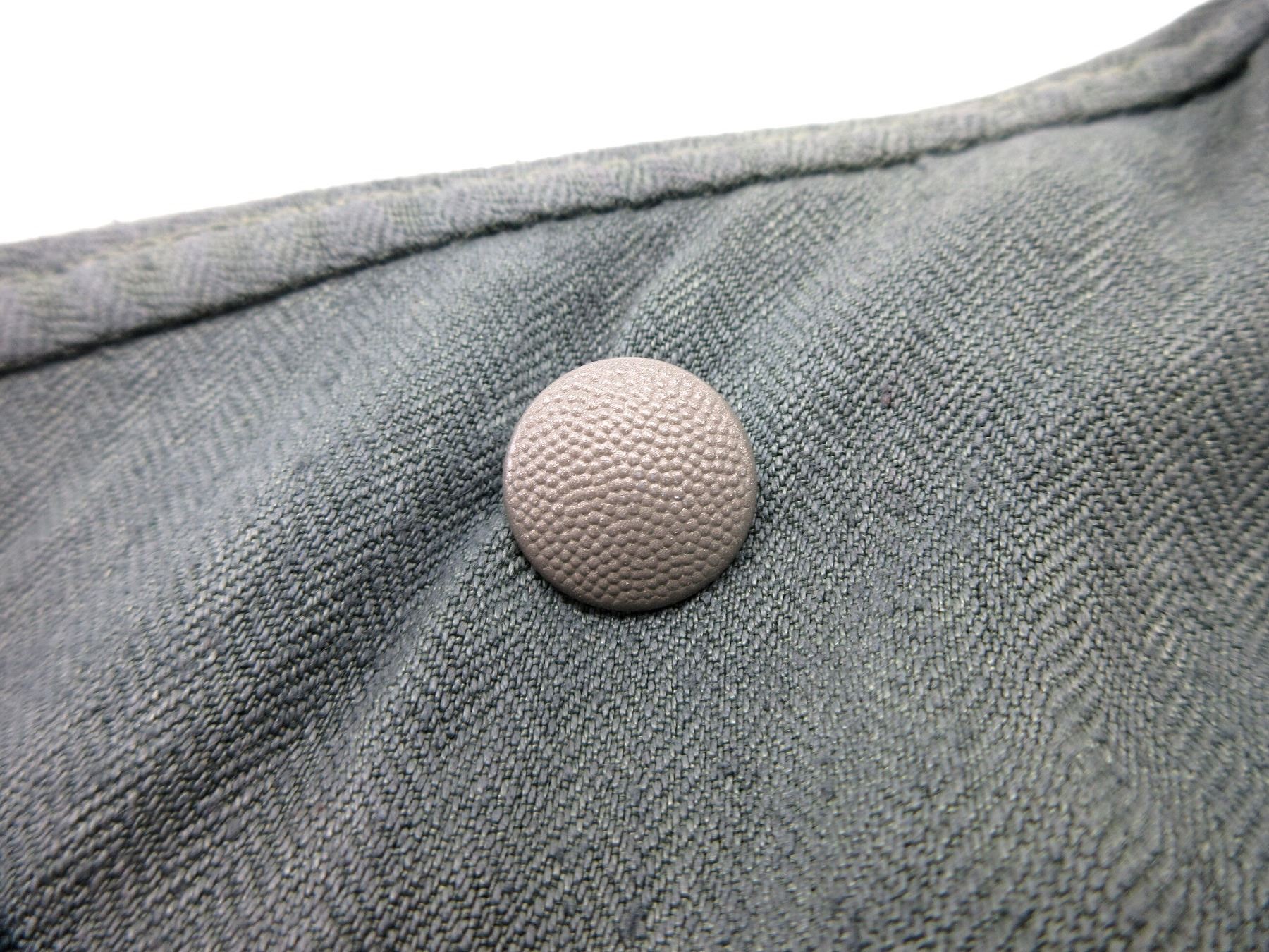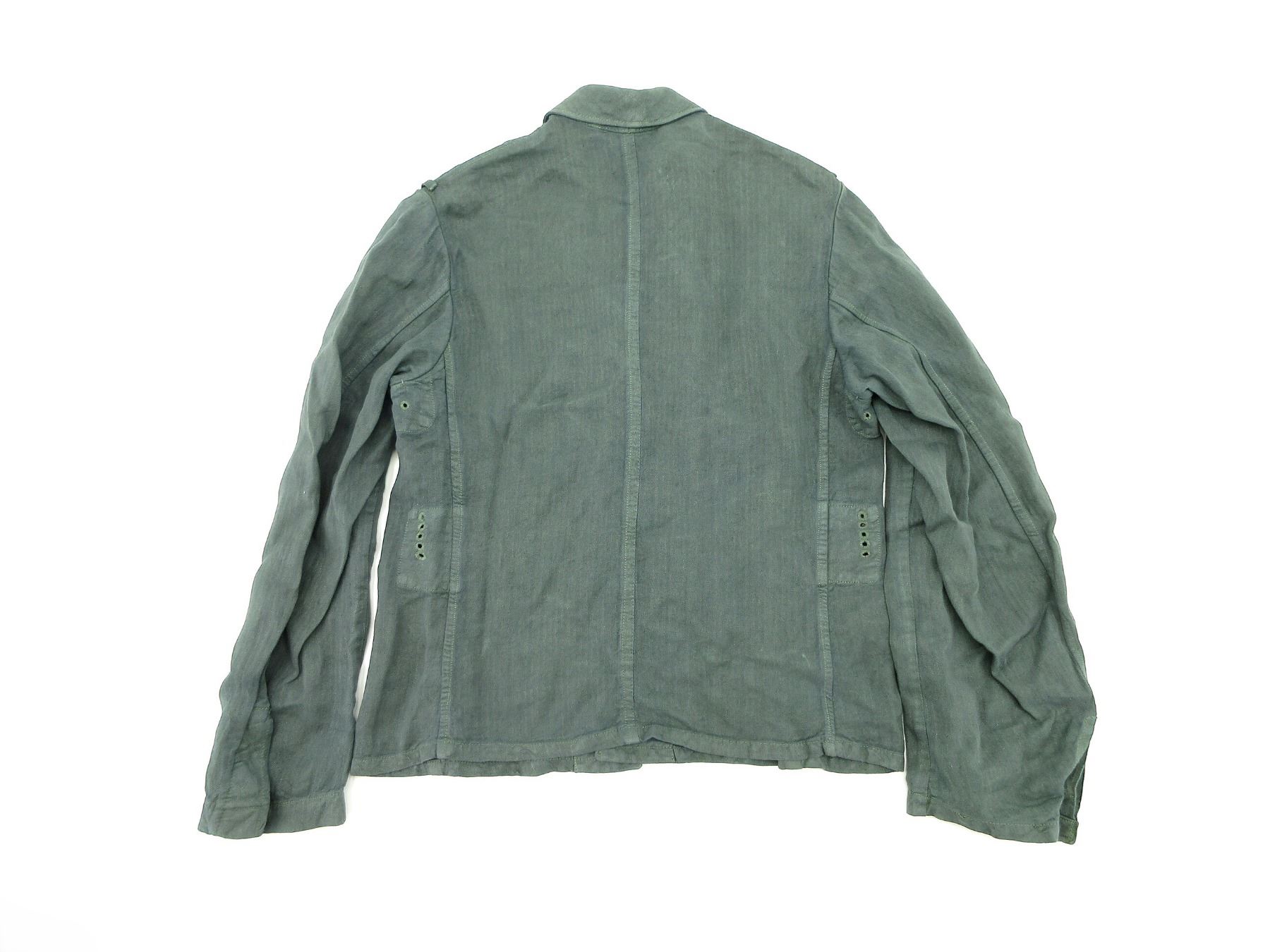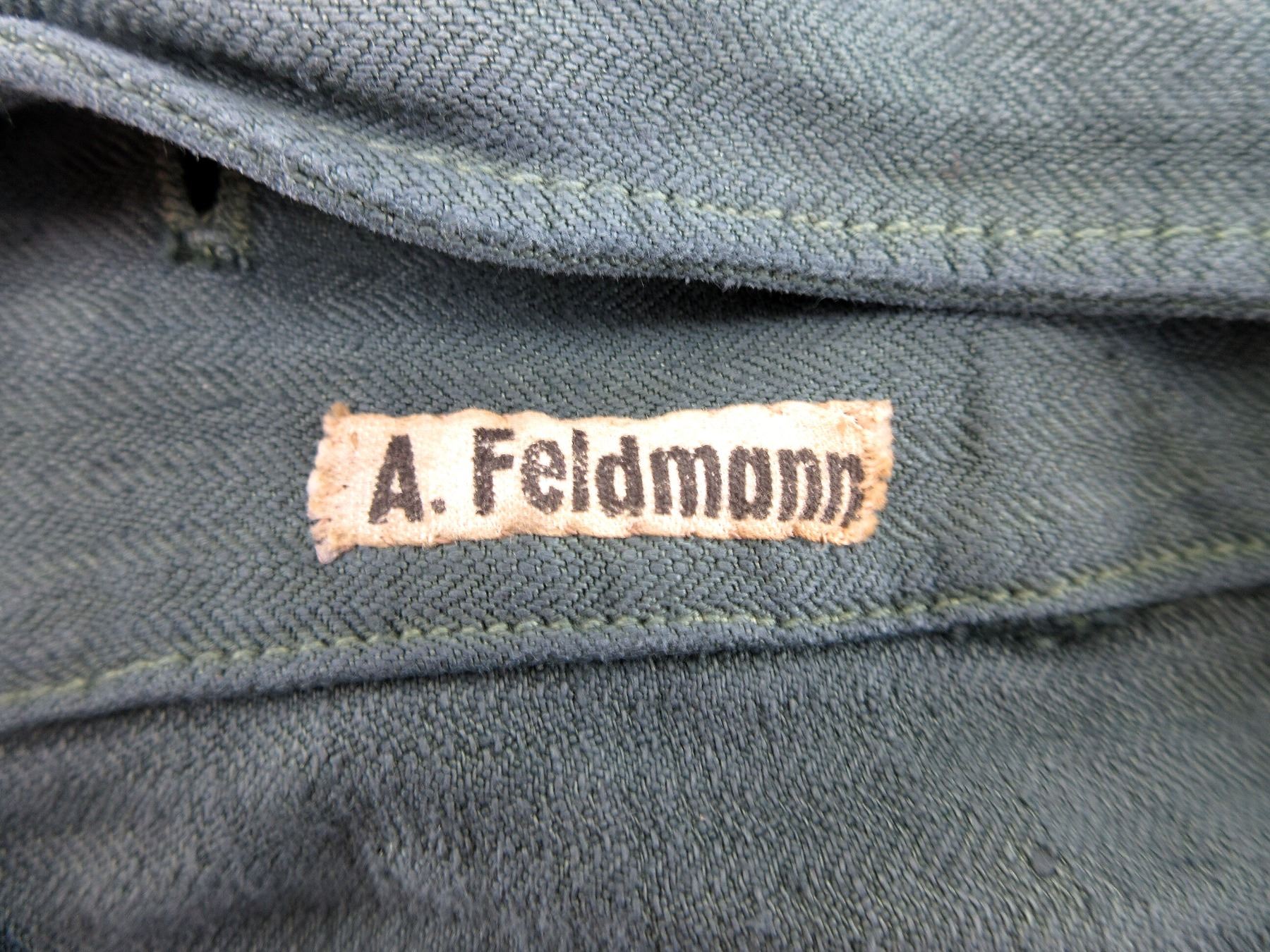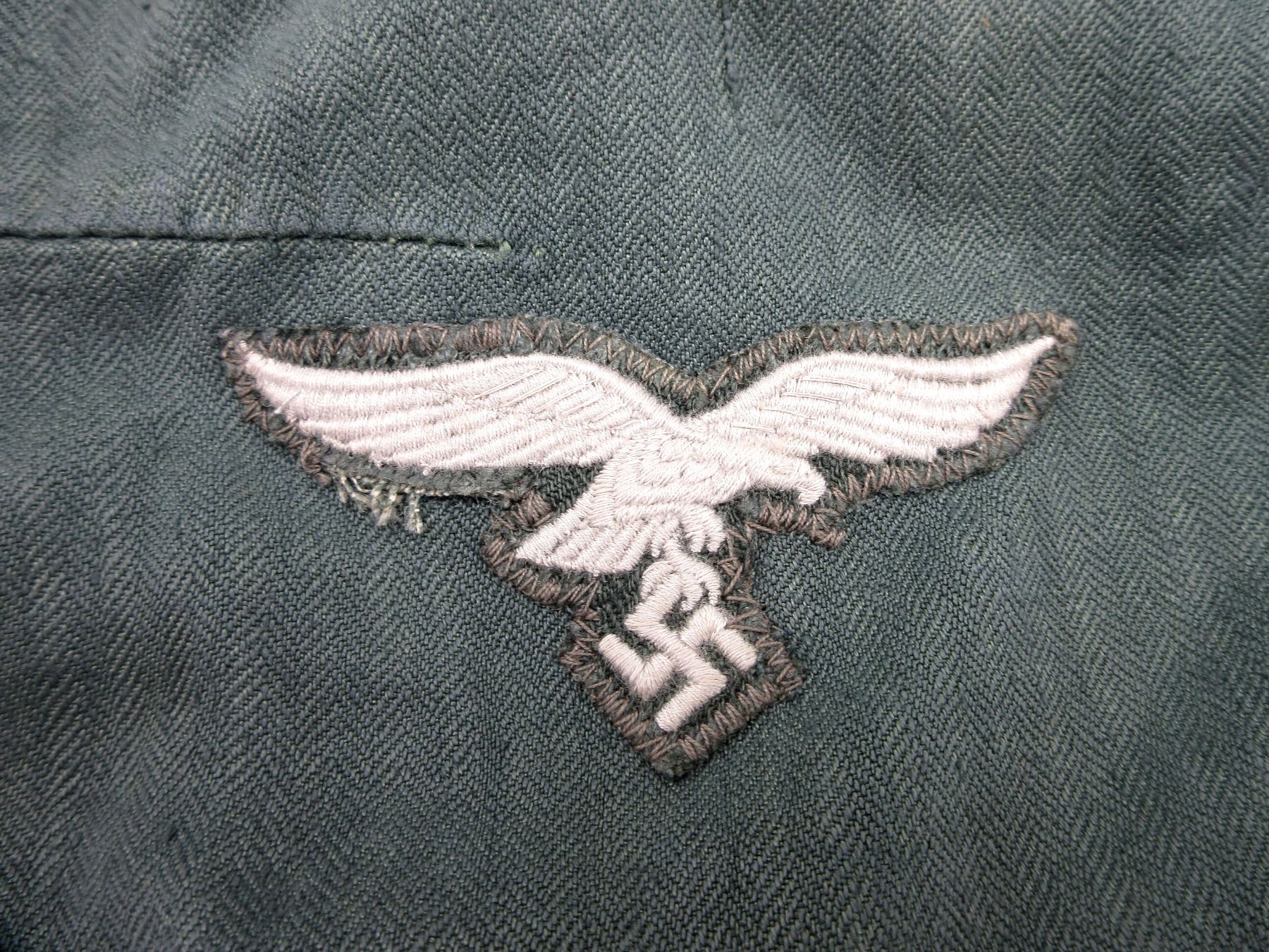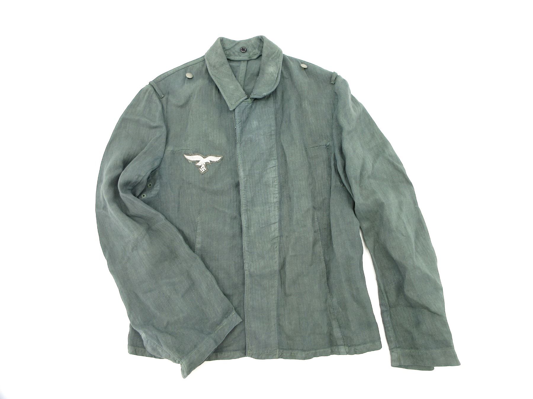 (1) GREEN CANVAS SHIRT WITH LUFTWAFFE BREAST EAGLE, NAMED TO: "A, FELDMANN", SILVER PEBBLED BUTTONS ON SHOULDERS, CLOSED COLLAR, BUTTON FRONT, SHOWS WEAR, SHOULDER WIDTH APPROX. 17". SEE PHOTOS.