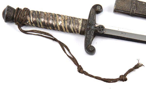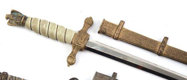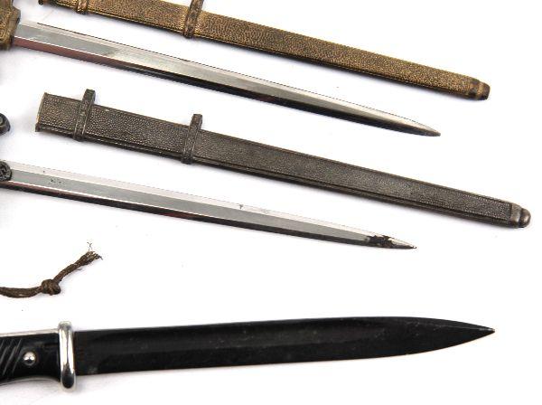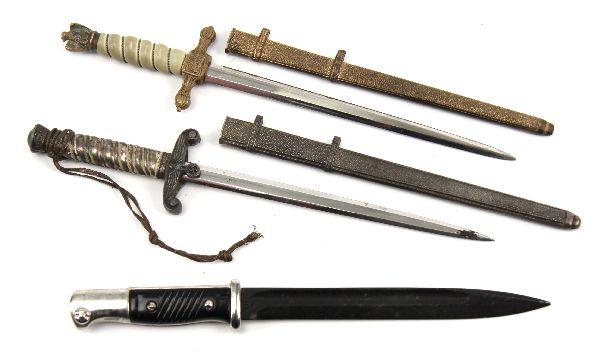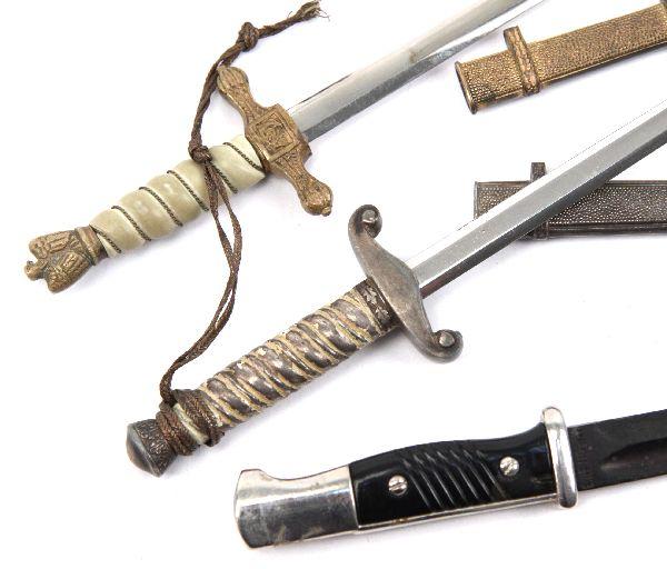 Grouping WWII German miniature Kriegsmarine dagger, Wehrmacht dagger, and mini police bayonet. Bayonet id marked E & F Horster, daggers are unmarked. Losses to paint on army dagger handle, and no scabbard on police bayonet. Overall good to very good condition.