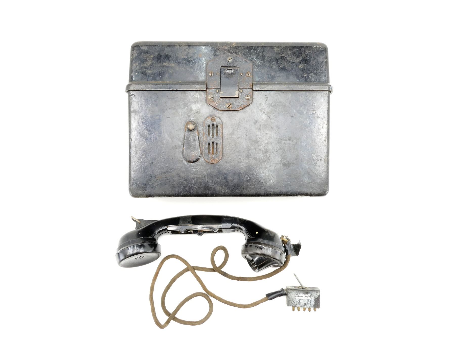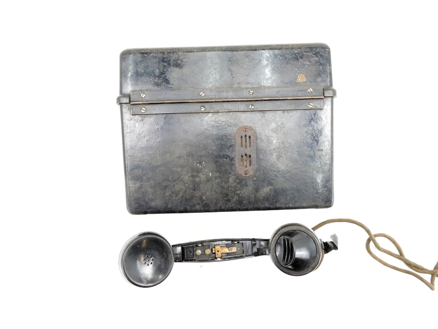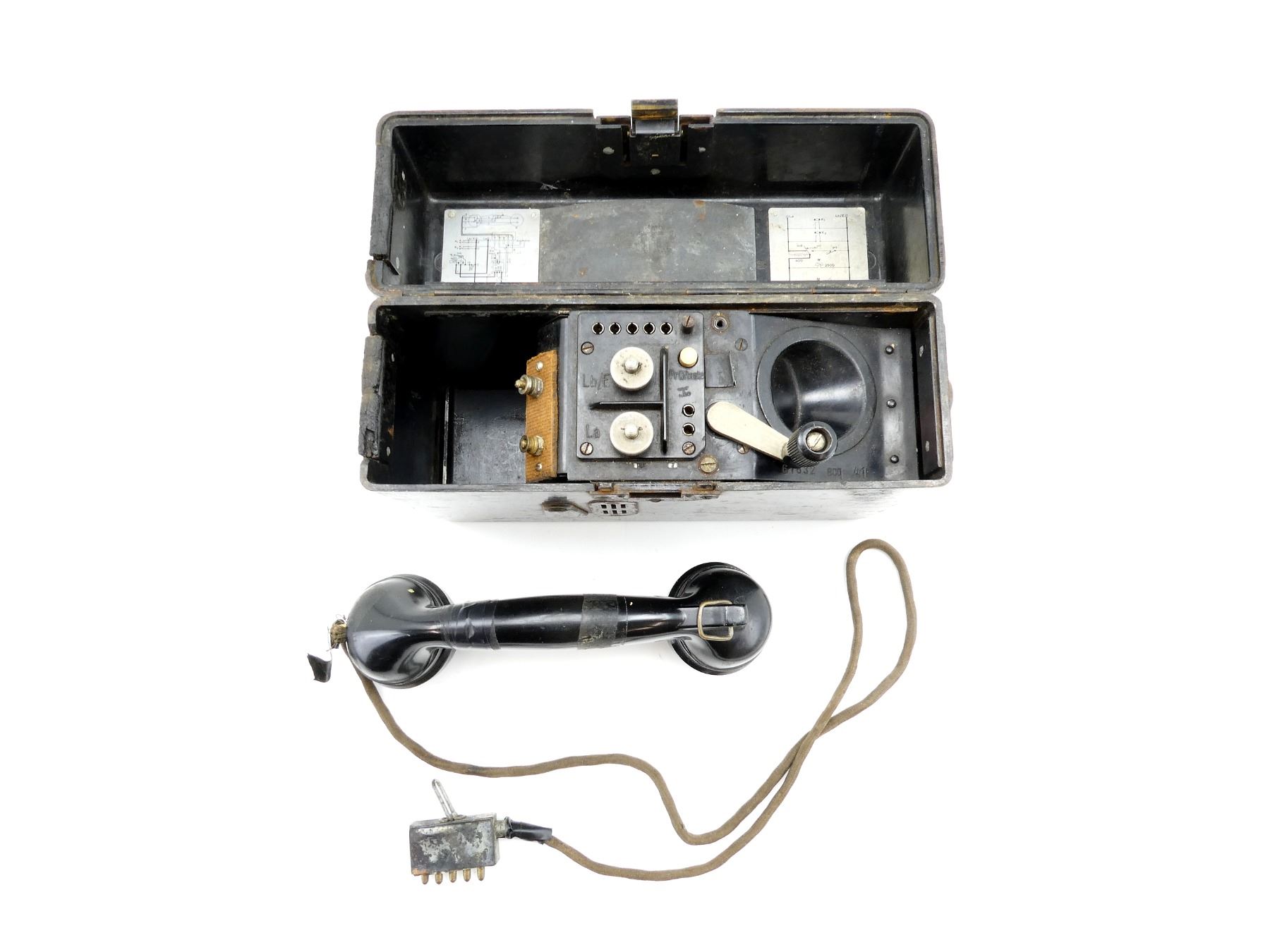 (1) BROWN BAKELITE CASE, WITH DATA PLATES INSIDE LID & ONE ON TOP, WITH HANDSET, CRANK HANDLE, MARKED: FLYING EAGLE "WAA61?", "61632 ECQ 41" & VARIOUS OTHER MARKINGS, VARIOUS MARKINGS ON HANDSET, SHOWS AGE / WEAR / TEAR, APPROX. 11" X 4" X 8.5". SEE PHOTOS.