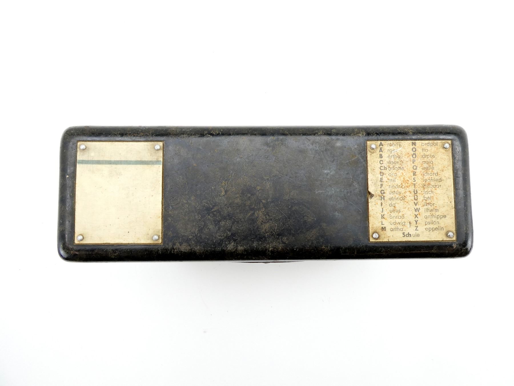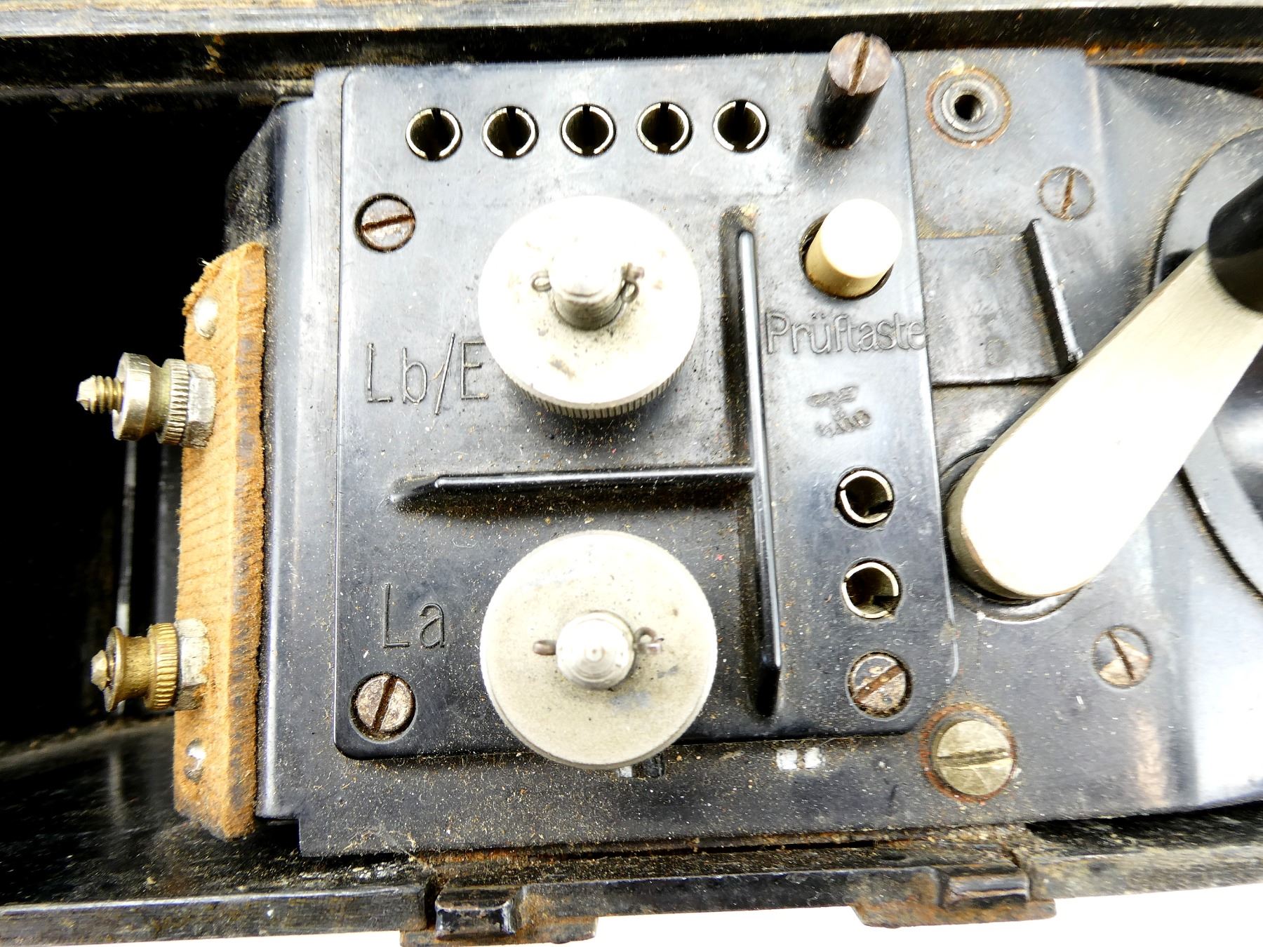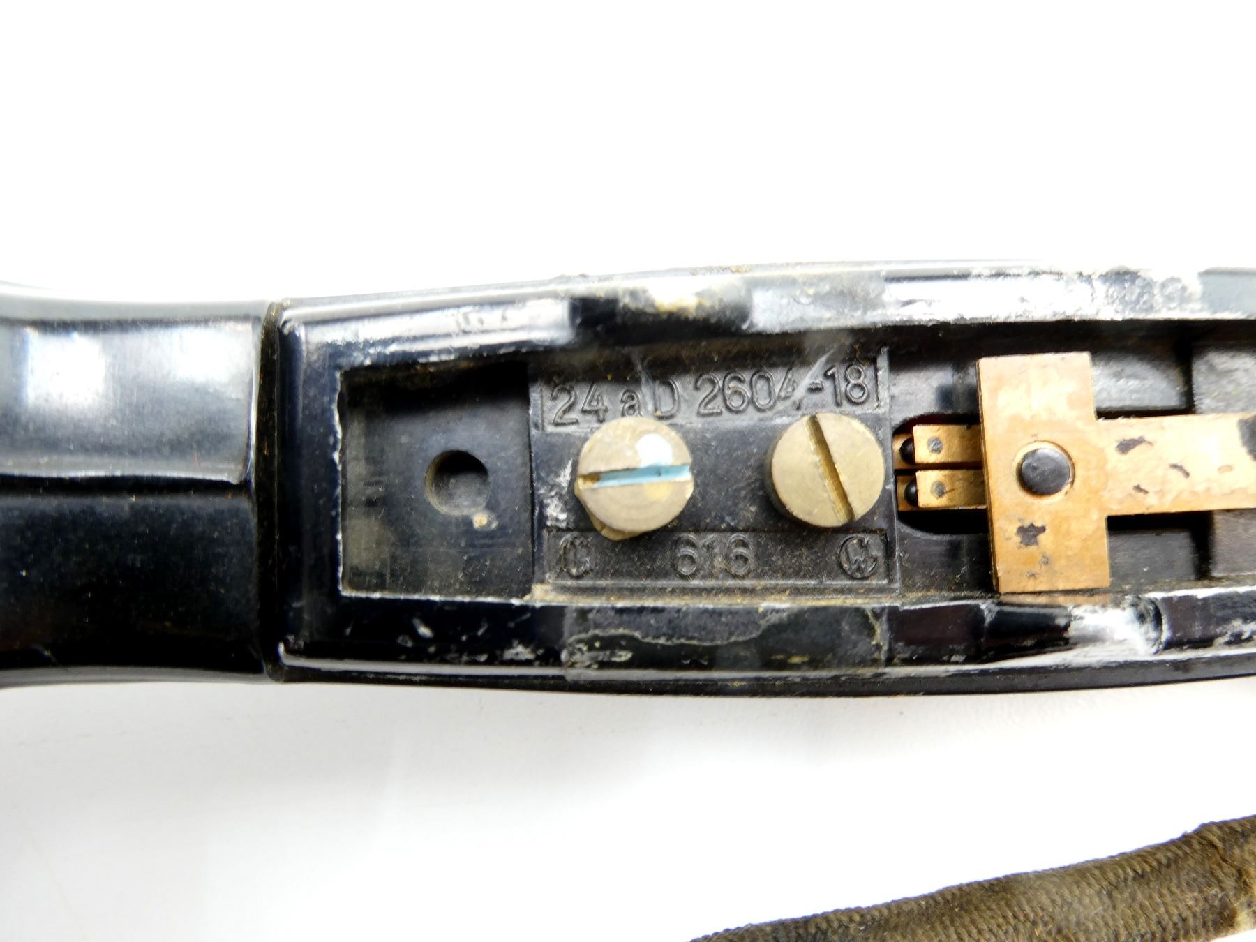 (1) BROWN BAKELITE CASE, WITH DATA PLATES INSIDE LID & ONE ON TOP, WITH HANDSET, CRANK HANDLE, MARKED: FLYING EAGLE "WAA61?", "61632 ECQ 41" & VARIOUS OTHER MARKINGS, VARIOUS MARKINGS ON HANDSET, SHOWS AGE / WEAR / TEAR, APPROX. 11" X 4" X 8.5". SEE PHOTOS.