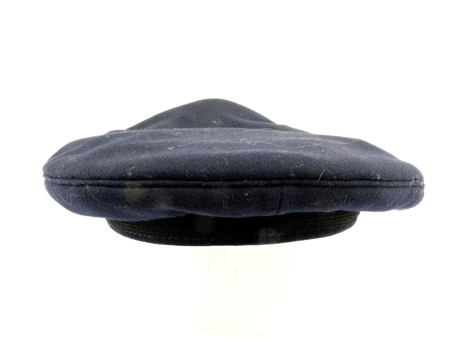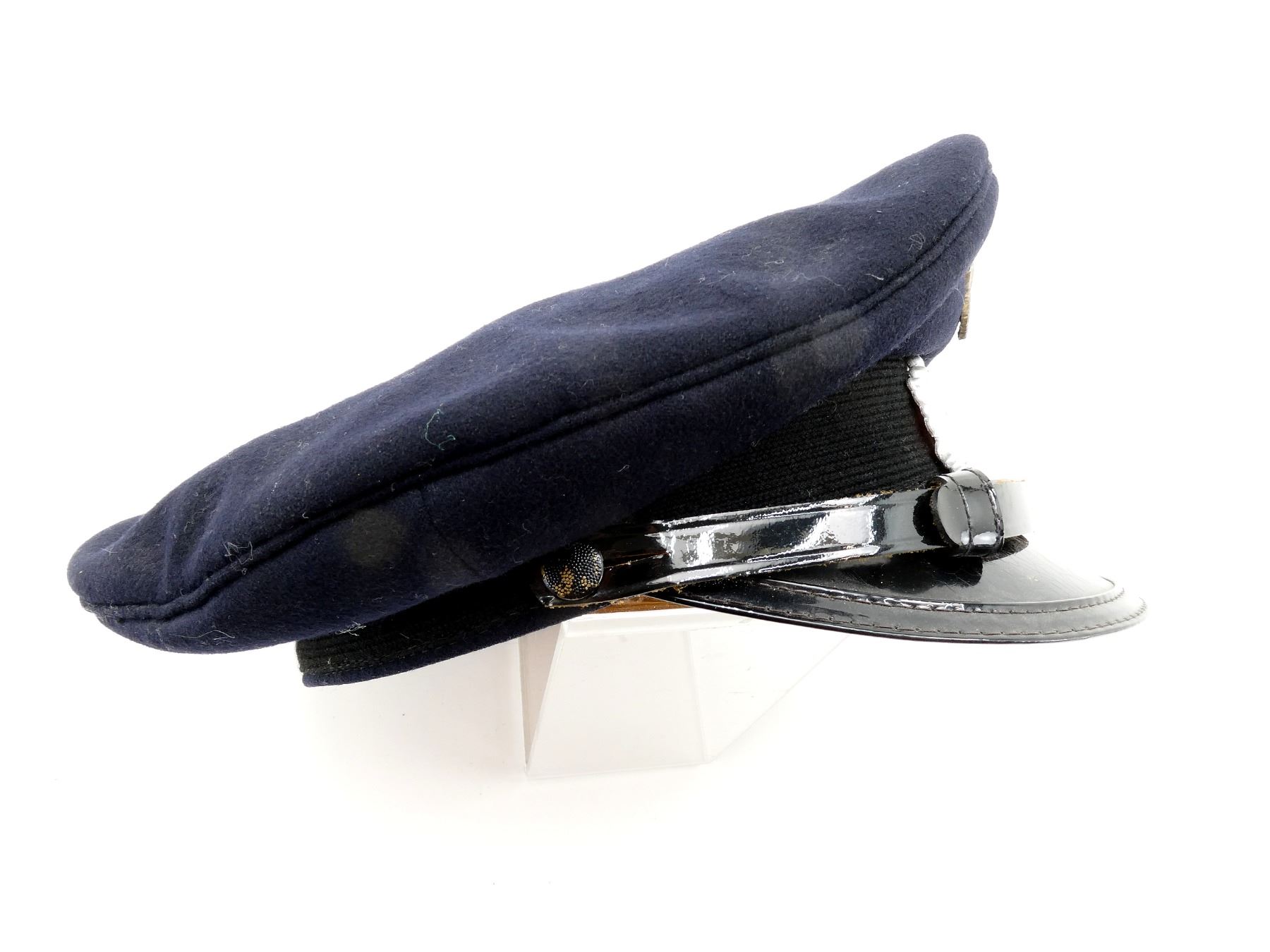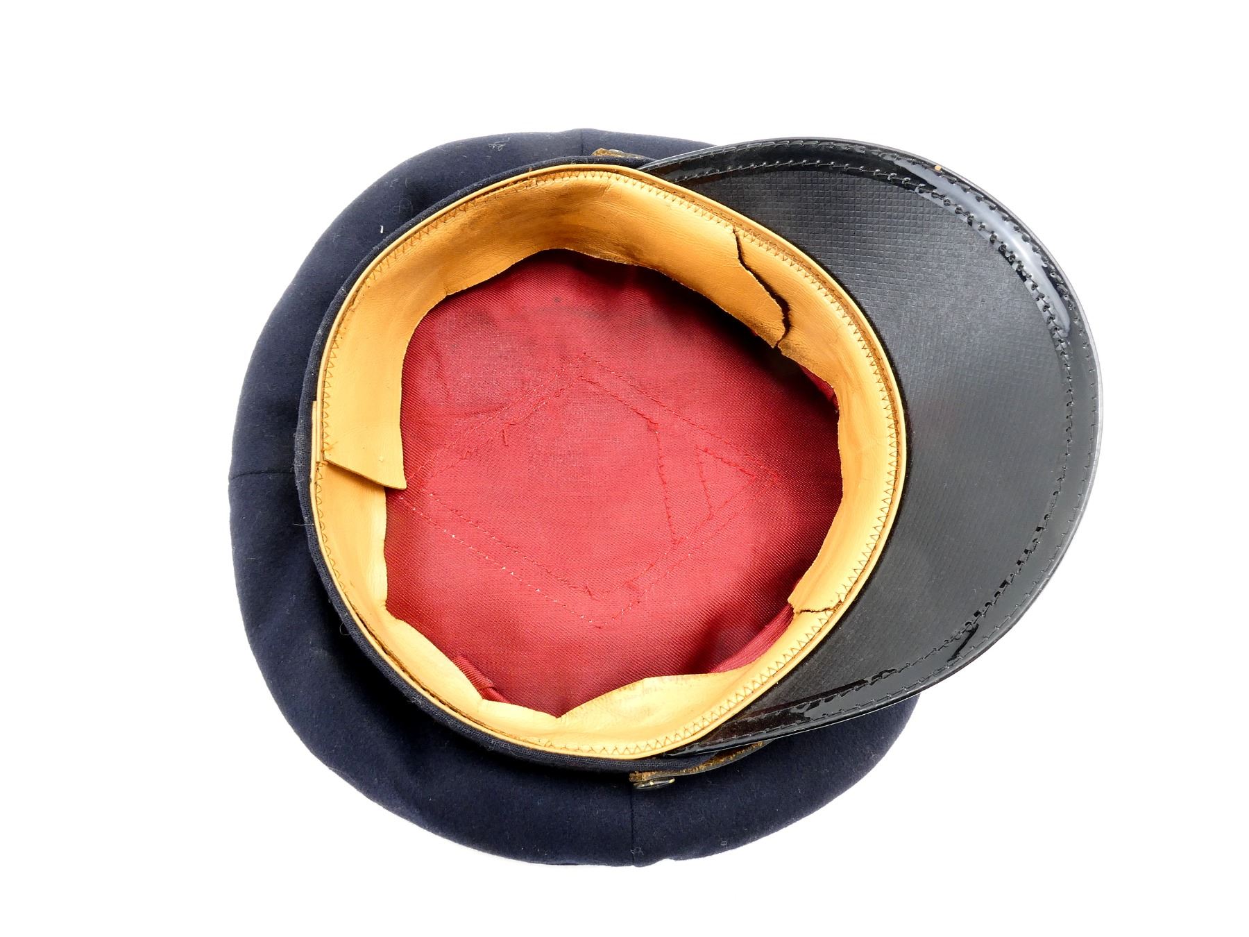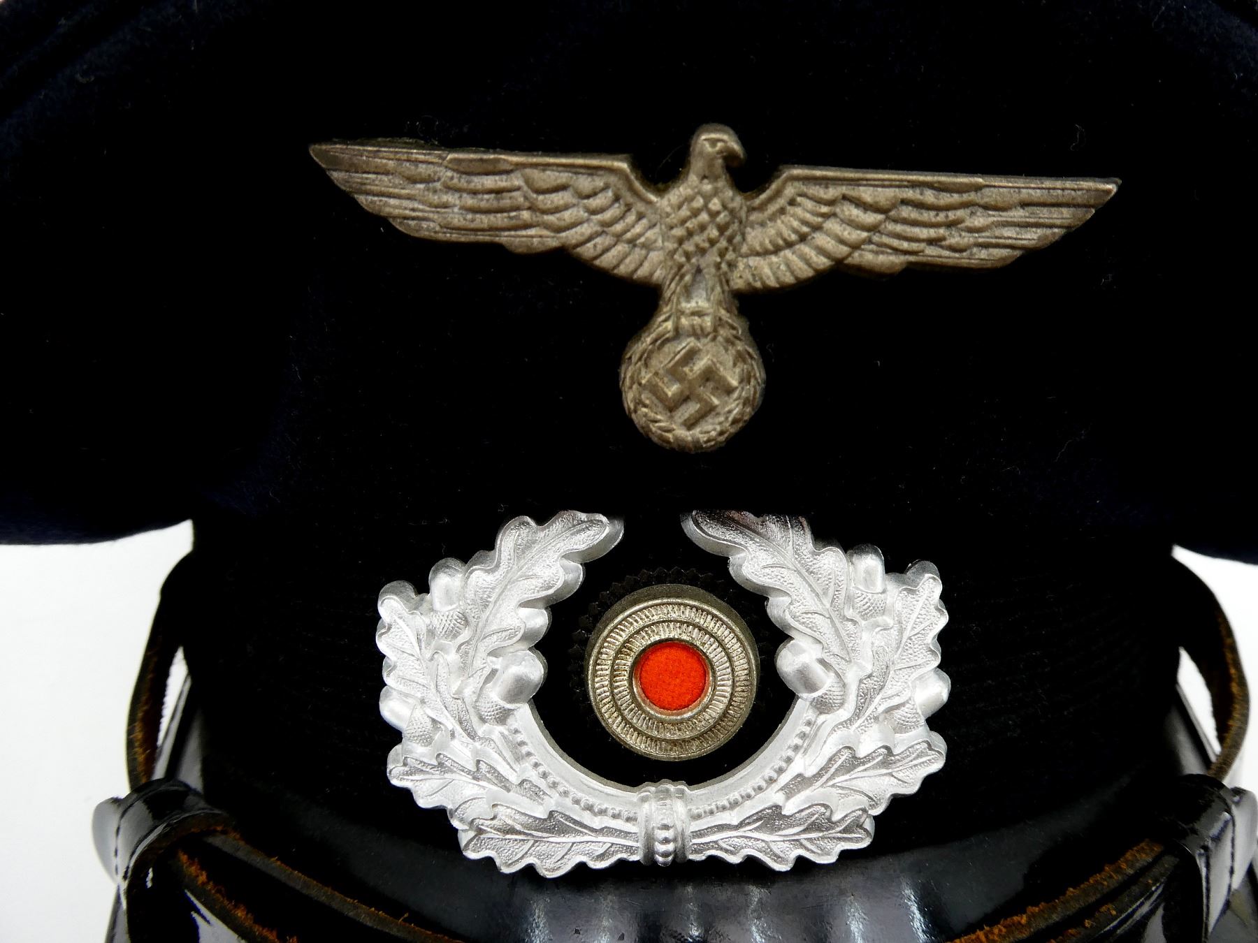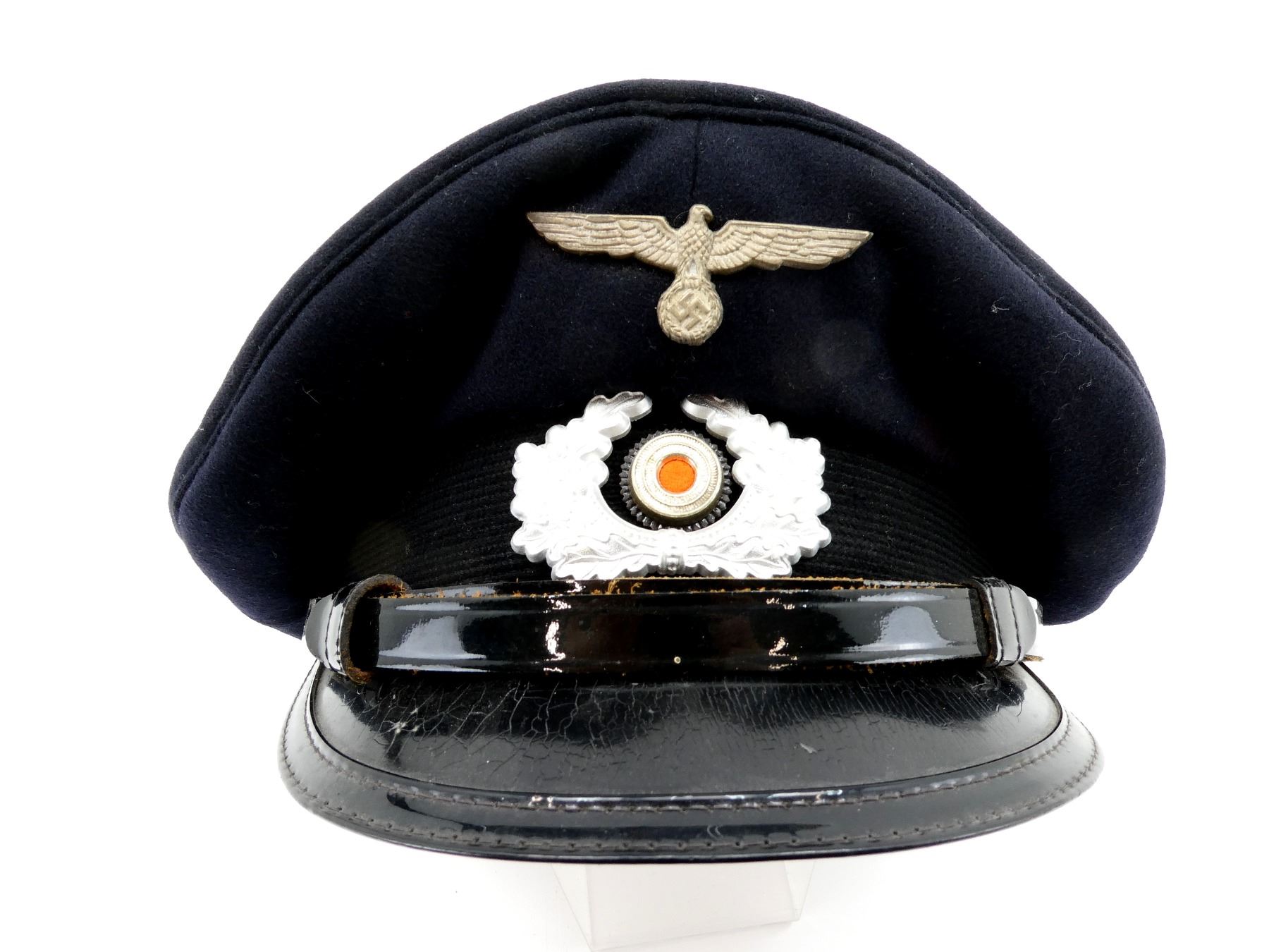 (1) NAVY BLUE PEAKED CAP WITH EAGLE HOLDING SWASTIKA BADGE & COCKADE WITH WREATH BADGE, BLACK PAINTED BRASS PEBBLED BUTTONS, BLACK LEATHER CHIN STRAP, NO VISIBLE MARKINGS (LABEL REMOVED), LEATHER HEAD BAND SHOWS AGE / WEAR / TEAR, CAP SHOWS AGE / WEAR. SEE PHOTOS.