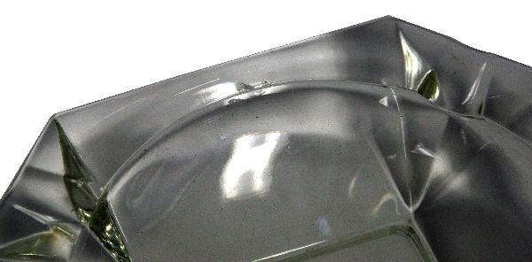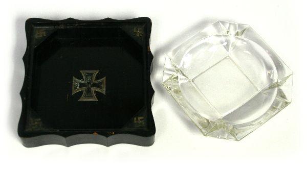 WWII German officer's ashtray. Glass ashtray in wood stand, with large 1914 Iron Cross in bottom, with swastikas on all four corners. Manufacturers label on bottom. Overall good condition, with some scratches.