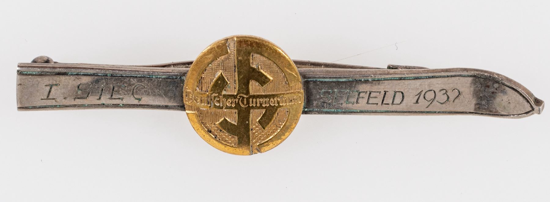 Named Turnerbund pin for the German Olympic ski pin. Pin has small engraved name, 'I. Sieg - Seefeld 1932'. Verso is clutch pin back with maker's mark, '800 - A. Klammer Innsbruck'. 2.75 inches.