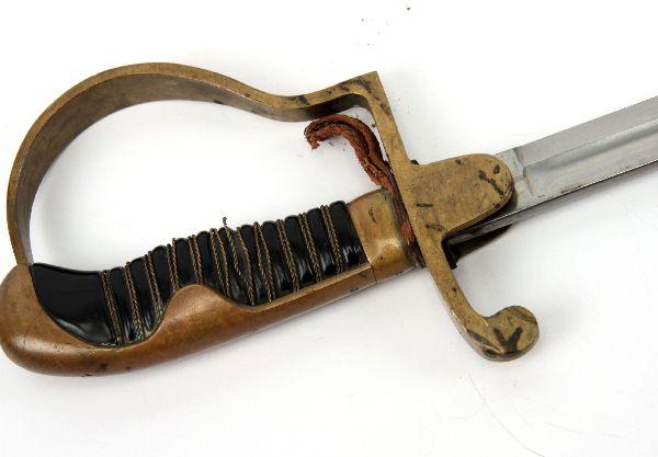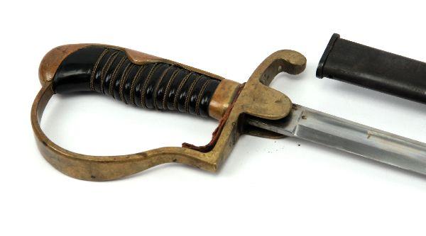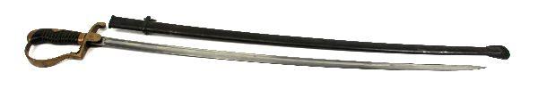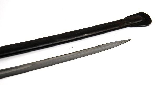32 inch blade marked Alcoso, Solingen with single fuller running 2/3 the length. Brass cross guard marked "4019/ AC/G". Black wire-wrapped celluloid grip. Matching #4019 black rolled steel scabbard shows some wear. Overall very good condition with loose wire.