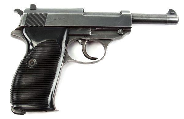 WWII German P-38 pistol, cyq coded for Spreewerke manufacture. Numbers all matching. Very clear waffenampt marks on right side, including eagle over "88", which also appears above trigger guard on left. Bore is in very good condition, and bluing is 90%, with light holster wear. Bakelite grips in very good condition, with minor handling marks. Overall very good condition. Caliber: 9mm Serial #: 4024F