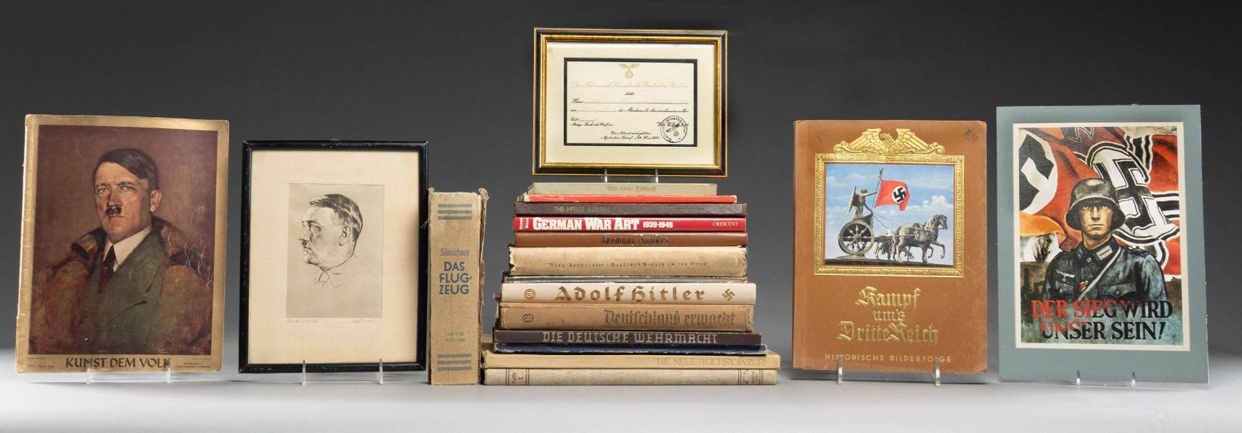This intriguing lot includes 1 book titled "Deutchland erwacht". This WWII German book has scores of tipped-in photographs. / 1 book titled "FLAK AN RHEIN UND RUHR". This WWII German book has many prints of artistic works showing flak guns. / 4 images most of which were taken from publications. / 1 Book titled "DIE KUNST IM DRITTEN REICH". This WWII German book shows many German artworks in this 1939 edition. / 1 Book titled "KUNST DEM VOLK" This WWII German book has many prints of German artistic works. / 1 Book titled "DIE DEUTSCHE WEHRMACHRT". This WWII German book has a plethora of tipped in card photos of the German Army and Navy. / 1 Book titled "DIE NEUE REICHSKANZLEI". This WWII German book shows photos of the new Imperial Chancellery. / Book titled "Die Neue Heimat". This WWII German book has a myriad of photos of different German houses of the 1940s ./ 1 Book titled "Deutsches Ringen un den Often". This WWII German book appears to tell the history of the German people. / 1 Book titled "Kampf um's Dritte Reich". This WWII German book has a plethora of tipped in card photos of political figures, SA, SS, and Army personal. / 1 Book titled "DAS FLUGZEUG". This WWII German book is like a technical manual for various German airplanes. / 1 Book titled "HITLER IN POLEN". This WWII German book has a many photos of Hitler during and subsequent to the Polish invasion. / 1 Dinner invitation for dining with Hitler. / 1 Berlin magazine featuring the 1936 Olympics. / 1 Engraving of Hitler. / 1 Book titled "UNSERE MARINE SCHIFFSBILDER". This WWII German book has a plethora of tipped in card photos of ships from 1250 to WWII. / 1 Book titled "Adolf Hitler". This WWII German book has a plethora of tipped in photos of Adolf Hitler and the armed forces. 3 Modern post WWII books about WWII Germany written in English. CONDITION: all books and related items show expected wear. Most, but not all, have solid bindings and rubbing to the corners.(02-24264/BF). NON-GUN. $500-1,000.