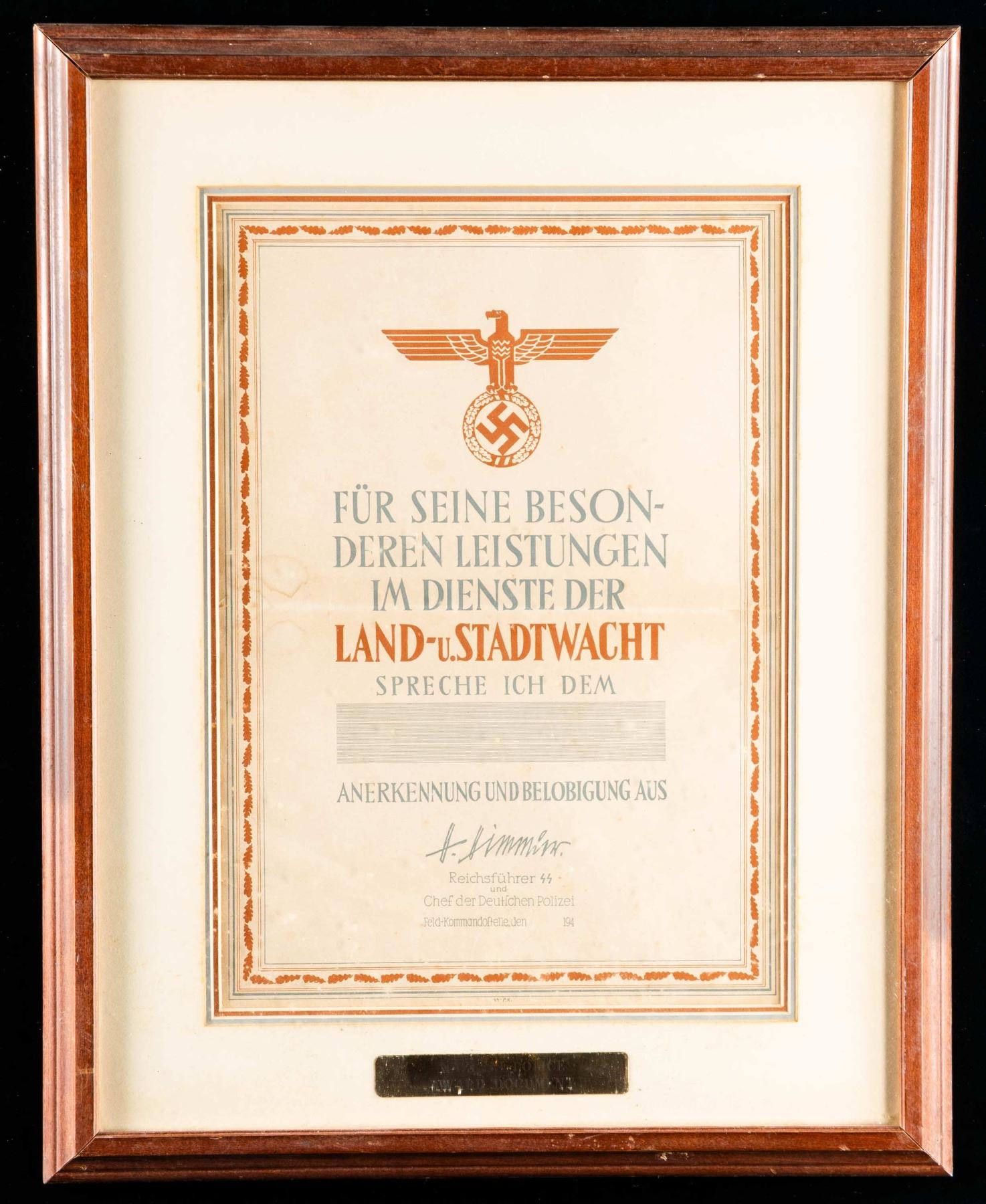 An unissued WWII German commendation document for faithful service to the state and city guard with the printed signature of Heinrich Himmler. The document measures about 16" x 12" and the frame measures 20 1/2" x 16 1/4". CONDITION: document is unissued but does show minor yellowing. (02-24913/BF). NON-GUN. $200-400.