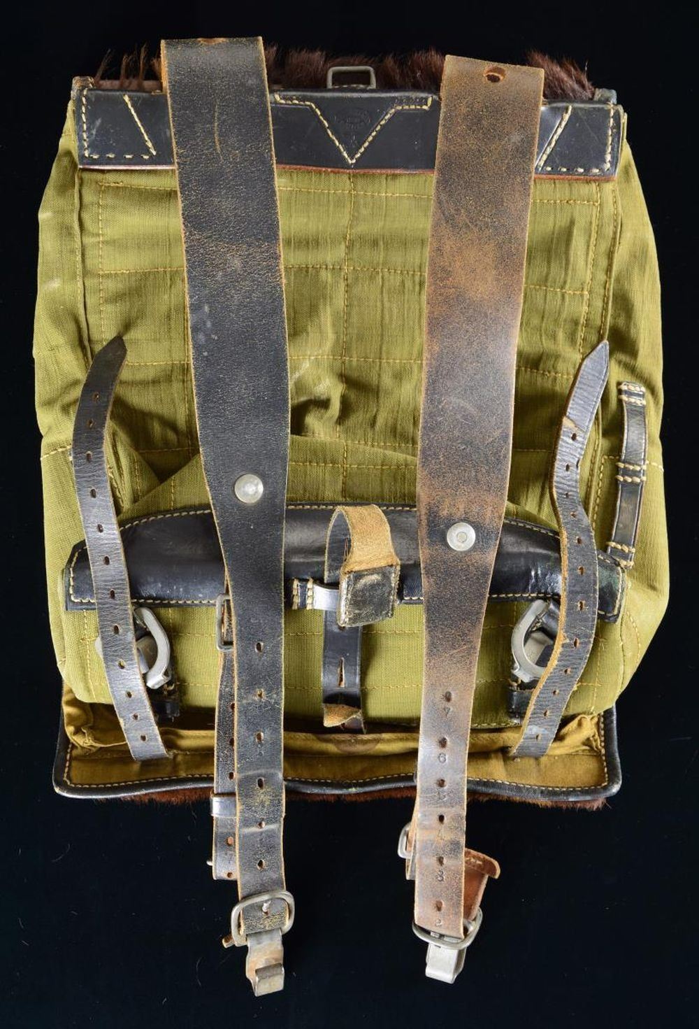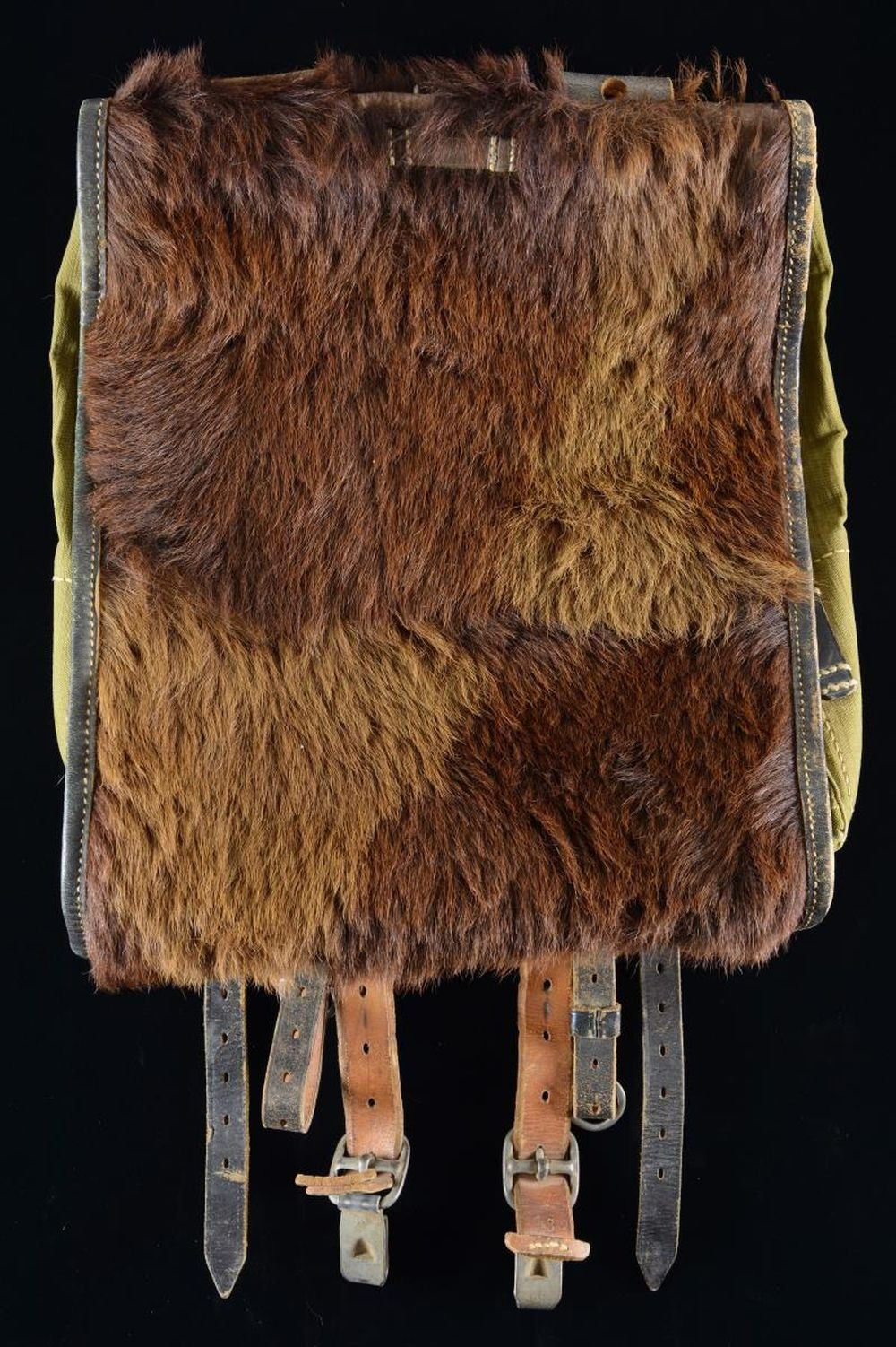 A classic WWII German knapsack with 2-tone brown fur on the exterior and a green canvas bag. Most straps have a black finish, and the shoulder straps have a brown finish. One strap is marked “E.G.LEUNER G.m.b.H. 1940 DAUTZEN.” CONDITION: knapsack shows light wear overall. All straps & buckles appear to be present. (02-21856/BF). $300-400.