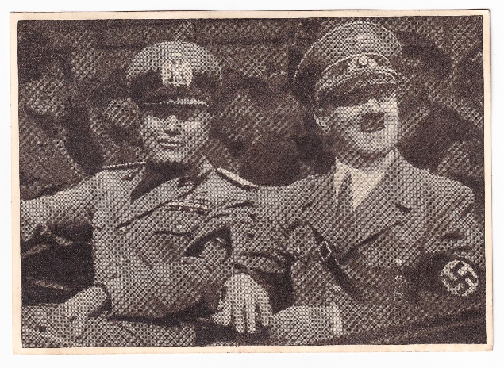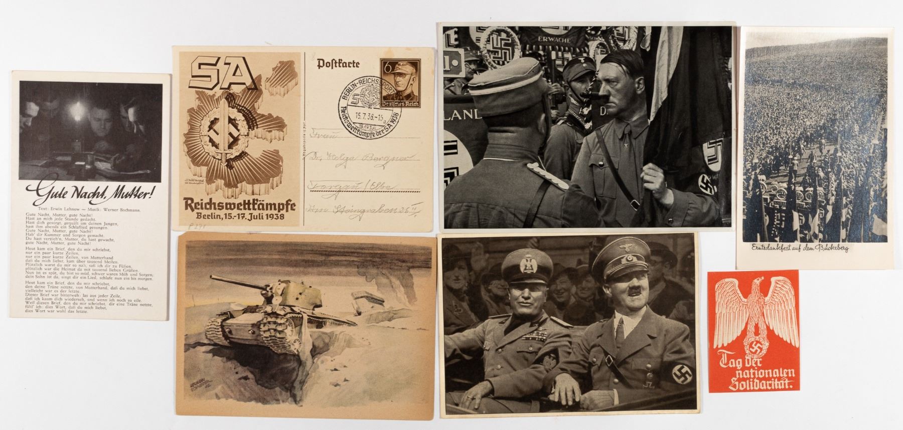 Assorted German postcards, including a postcard of Hitler and Mussolini, stamped and dated 1941. Seven pieces total.