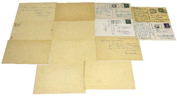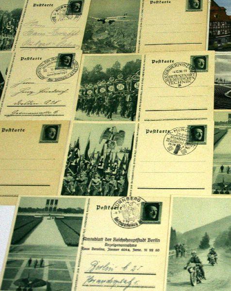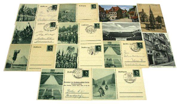 Set of 9 1937 Nuremberg divided back cards 2 unused, 3 unused but canceled, 4 used. 1 with Mussolini-Hitler cancellation and signed Heil Hitler. All in VG to EX. Also 1937 Reichsparteiggelande Zeppelinfeld used VG, Hans Sachs Haus used VG, 1931 Schoner Brunnen used VG, 1923 Albrecht Durer-Haus used G.