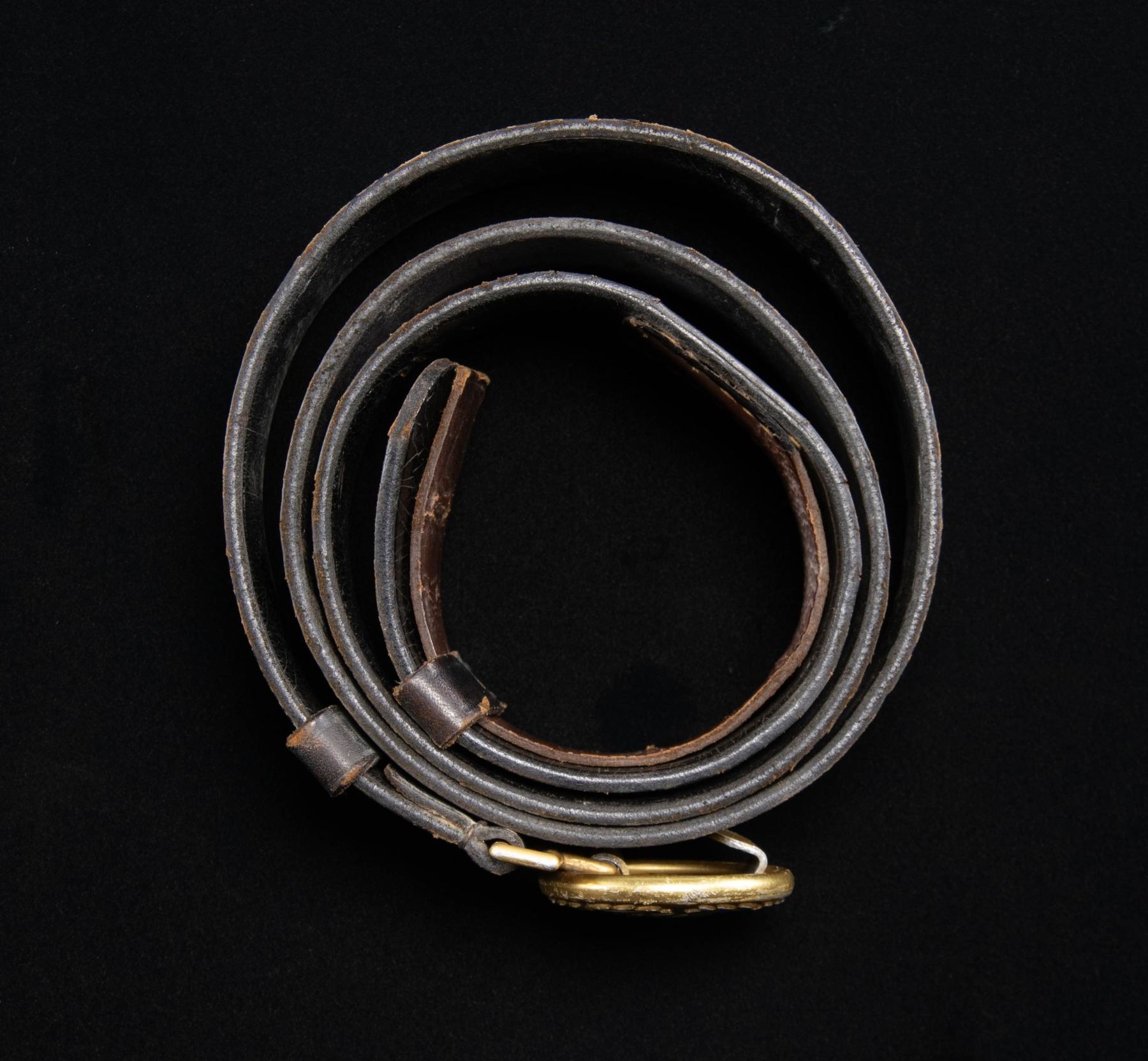 A scarce example of WWII German Reichsbahn or Railway officer's belt and buckle, The leather belt has a black finish and the gilded two piece buckle is marked on the reverse " A DRGM 38 ". The keeper of the buckle is missing. CONDITION: belt shows light wear as does the buckle. No keeper. (02-24865/BF). NON-GUN. $200-300.