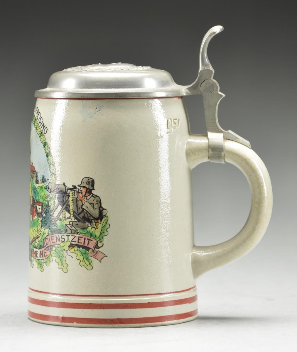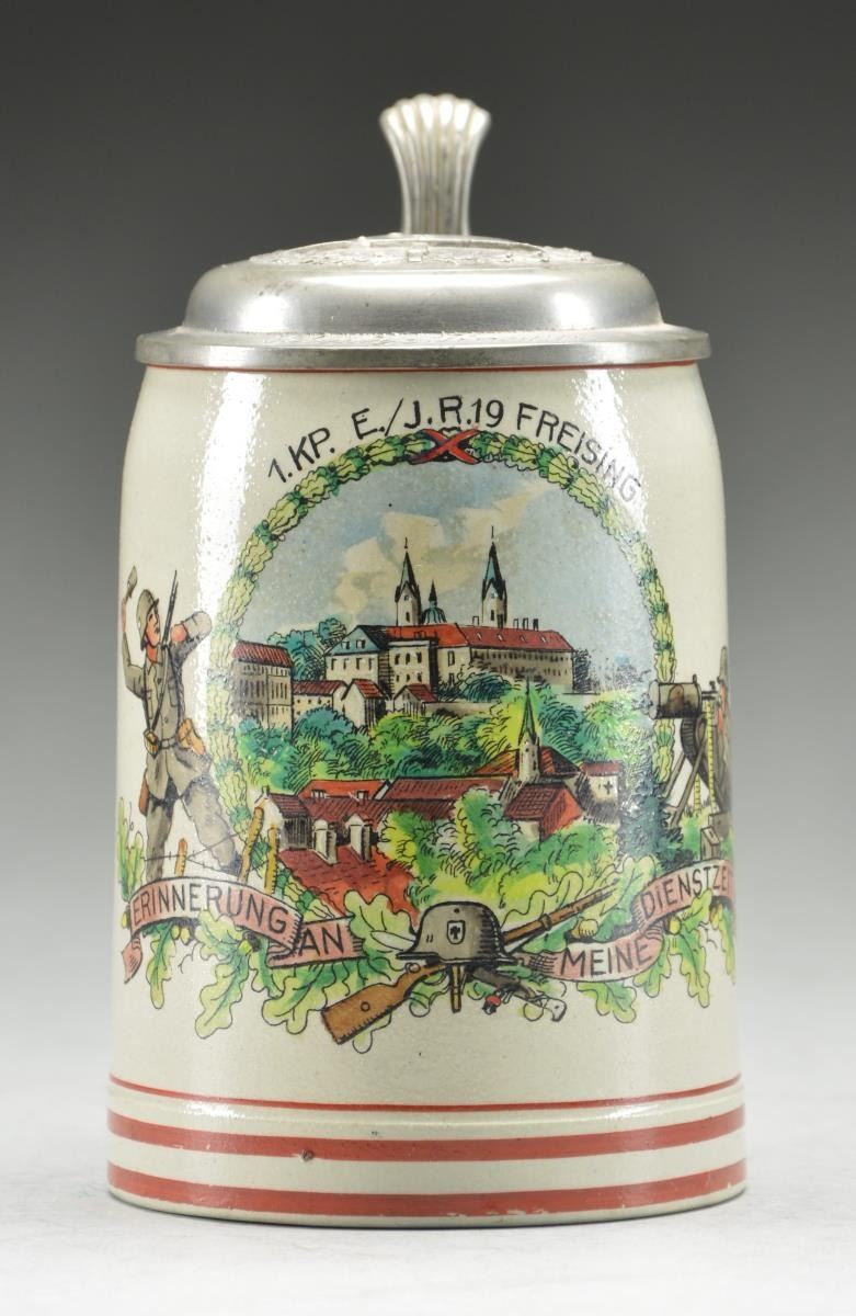 Stein measures 5 3/4" in height. The body of the stein reads "ERINNERUNG AN MEINE DIENSTZEIT" near the base. The top reads "1. KP. E./J.R.19 FREISING". The central portion depicts a town scene with a soldier on the left throwing a grenade, and a soldier on the right firing a machine gun. Pewter domed lid with a WWII German Army helmet surrounded by a wreath of oak leaves. The rim of the lid is engraved "Schutze Knapp." CONDITION: light wear overall. PROVENANCE: From the Lifelong Collection of Glen E. Mattox. (02-18651/BF). $250-400.