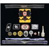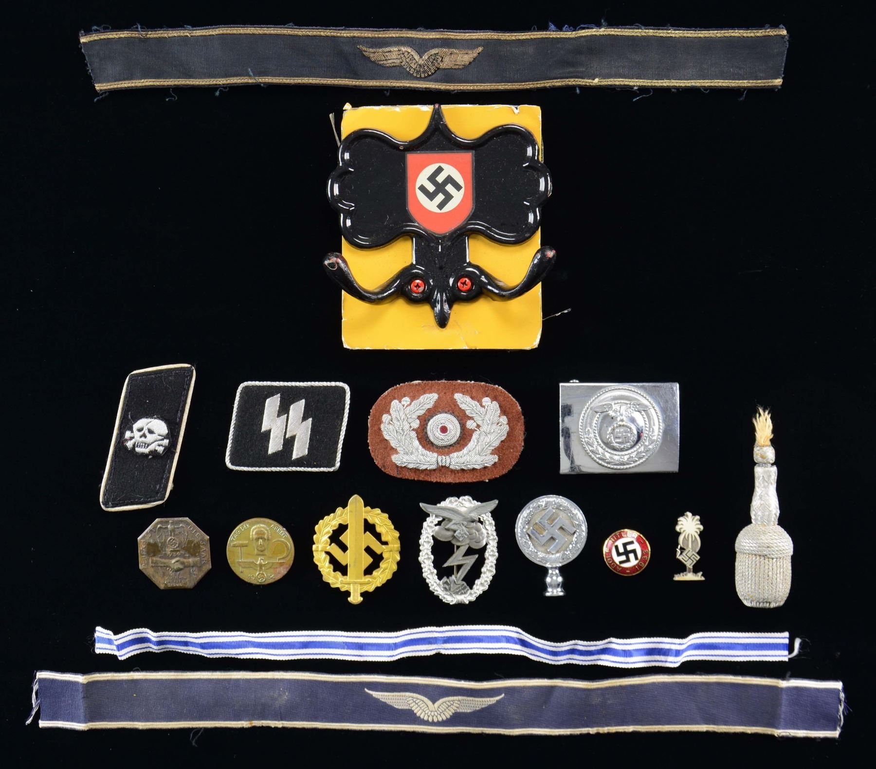 MILITARIA, & ORIGINAL WWII GERMAN ITEMS. This lot includes 2 West German Air Force cuff titles. / 1 "TAG DER ARBEIT" tinnie, dated 1934. / 1 "DEUTSCH IST DIE SAAR" tinnie, dated 1934. / 2 SS collar tabs. / 1 Bullion political leader’s cap wreath and cockade. / 1 Tassel only for a dagger knot. / 1 Luftwaffe Ground Assault Badge. / 1 Gold SA sports badge. / 1 length of Mother’s Cross ribbon measuring 15". / 1 Finial for an award or lamp. / 1 Party pin that reads "ADOLF HITLER 1933". / 1 Chrome-plated political-style belt buckle. / 1 Afrika Korps enamel pin. / 1 Clothing hook with a party helmet decal motif in the center. CONDITION: items generally show very light wear. Most items in this group are reproductions. We encourage interested parties to examine this lot in person. (02-22953-7/BF). $100-200.