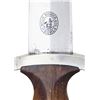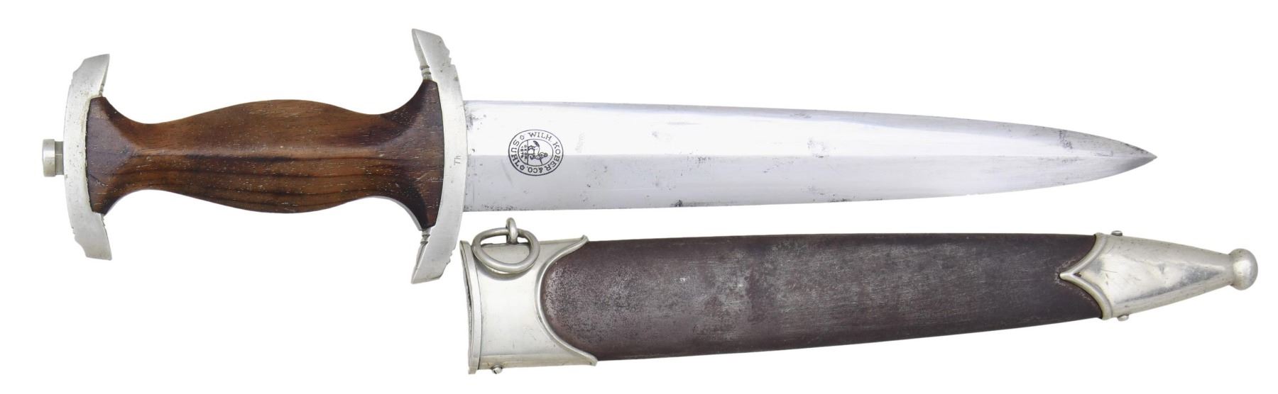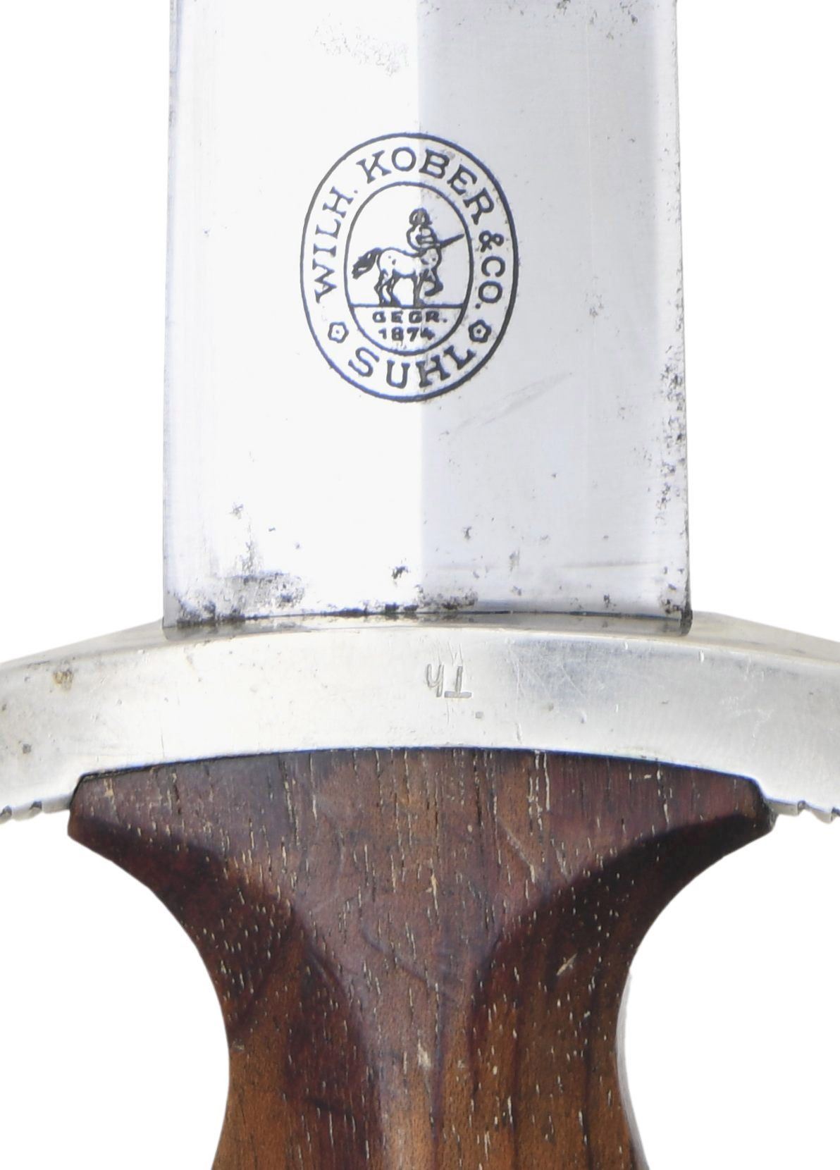Overall length: 13 3/4". Blade is etched "Alles fur Deutschland," and the reverse is marked "WILH. KOBER & CO. SUHL (logo)." Nickel silver crossguard stamped "Th" on the reverse, along with a nickel silver pommel guard. Brown wooden grip with a nickel-silver eagle and brown enamel "SA" button. Brown anodized scabbard with plated mounts. CONDITION: blade shows substantial original factory polish. Hilt shows light wear overall. Scabbard body shows light to moderate wear, and there is one screw missing from the throat. (02-23228/BF). $350-500.