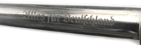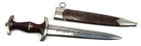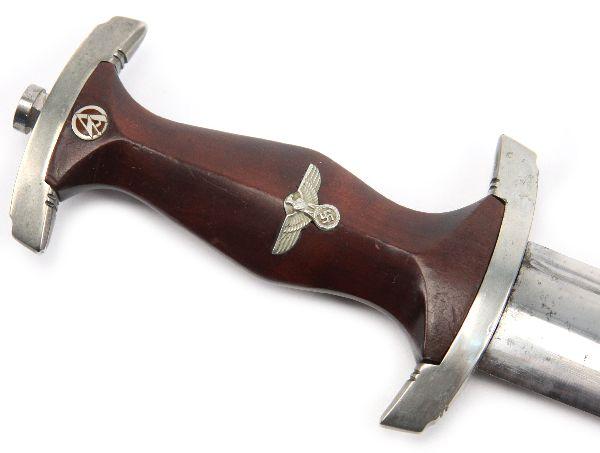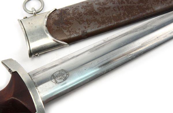 Third Reich SA dagger with scarce Clemen & Jung, Solingen makers mark, with "Z" logo. Some scabbard wear to blade, but retains a good shine. Scabbard has losses to enamel, but is otherwise in good condition, with no dings or dents. Overall good to very good condition.