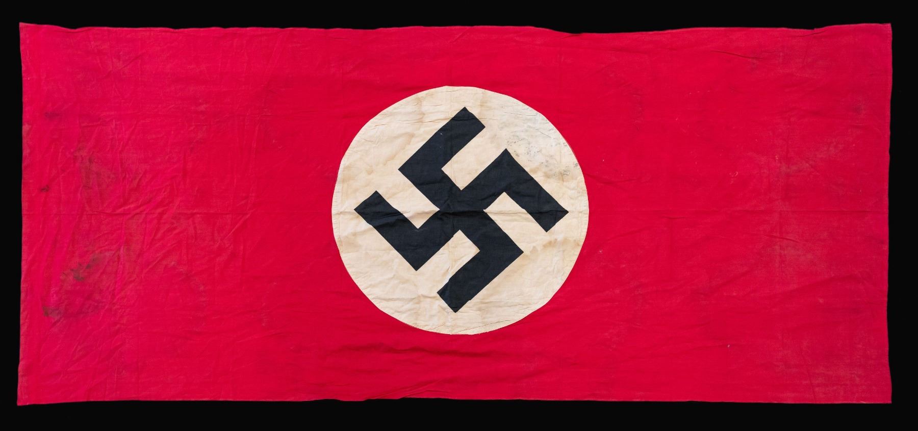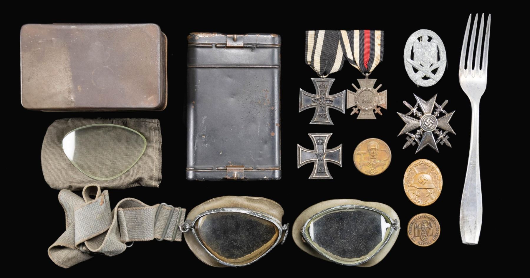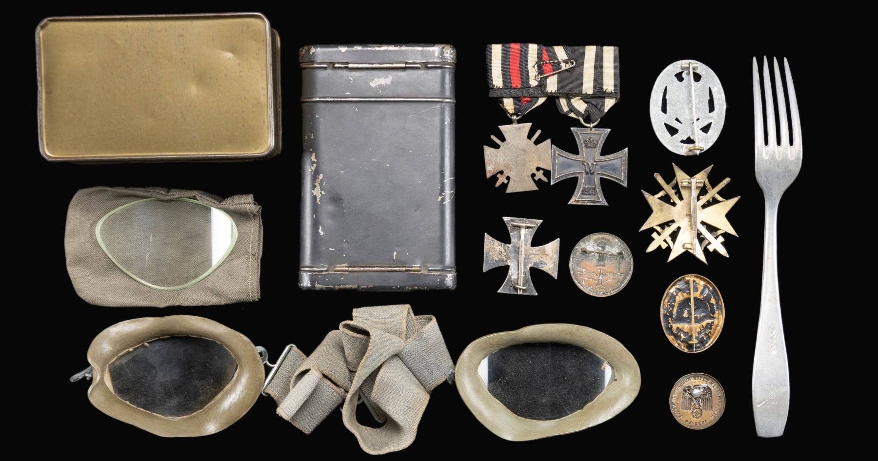 This lot is made up of 1 Gilded silver Spanish Cross marked "900" on the reverse. The gilding shows only traces remaining on the front but 85% on the reverse. / 1 Large Party flag measuring 108" x 48" with minor staining. / 1 Mauser K-98 cleaning kit. / 1 Pair of goggles housed in a tin. / 1 Fork with an early Party eagle and the date 1940. / 1 Medal bar of 2 awards that include the WWI 2nd class Iron Cross and the 1914-18 Cross with Swords. / 1 WWI 1st Class Iron Cross. / 1 Zinc General Assault Badge with heavy oxidation. / 1 Brass black wound badge. / 2 Tinnies. CONDITION: the Spanish cross has a wonderful look but the catch is broken off on the reverse. All other items show light wear. (02-24144-4/BF). $1500-2500.