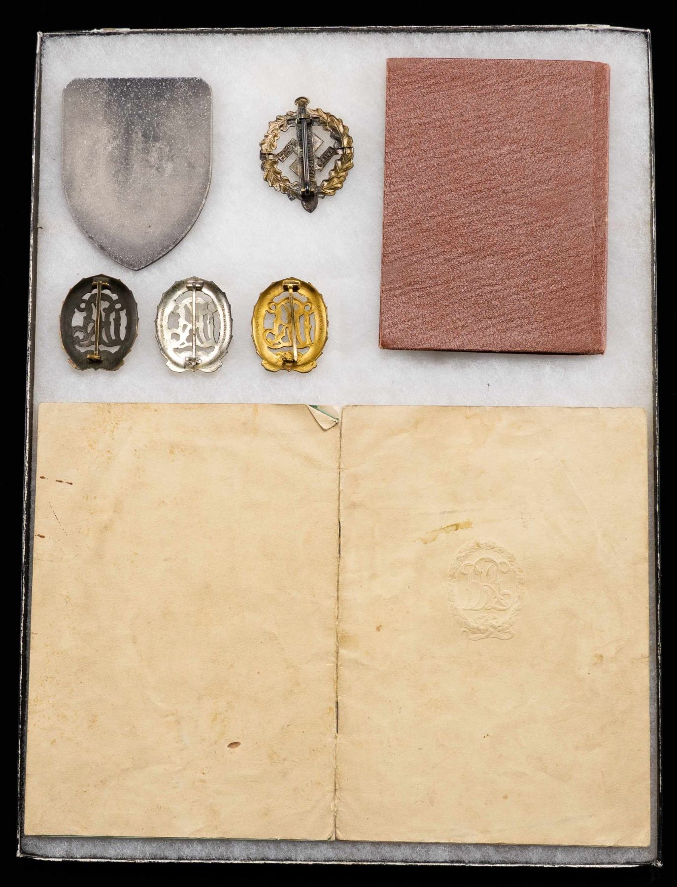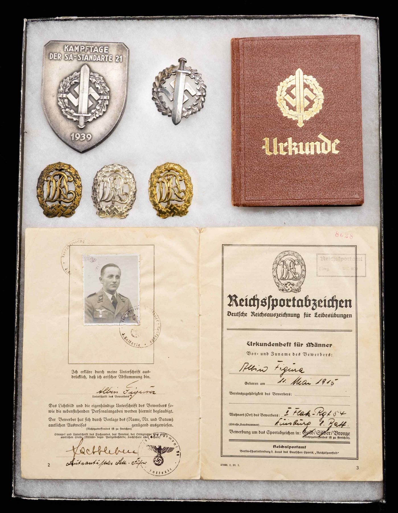 This fine WWII German sporting lot includes 1 Gold DRL Sports badge. / 1 Silver DRL Sports Badge. / 1 Bronze DRL Sports Badge. / 1 Silver SA Sports Badge. / 1 Cast plaque dated 1939 with an SA Sports Badge and The words " KAMPSTAGE DER SA - STANDARTE 21 1939 ". / 1 ID booklet with an SA Sports Badge on the frond and the word "Urkunde". / 1 DRL Badge award certificate for a member of the Luftwaffe. CONDITION: all awards and documents show light overall wear. (02-24878-5/BF). $700-1000.