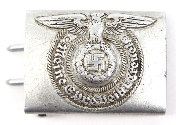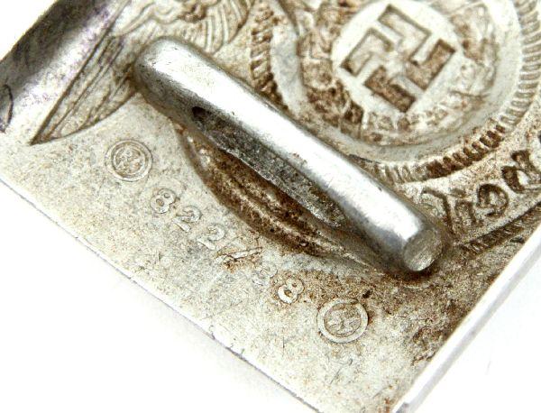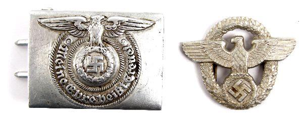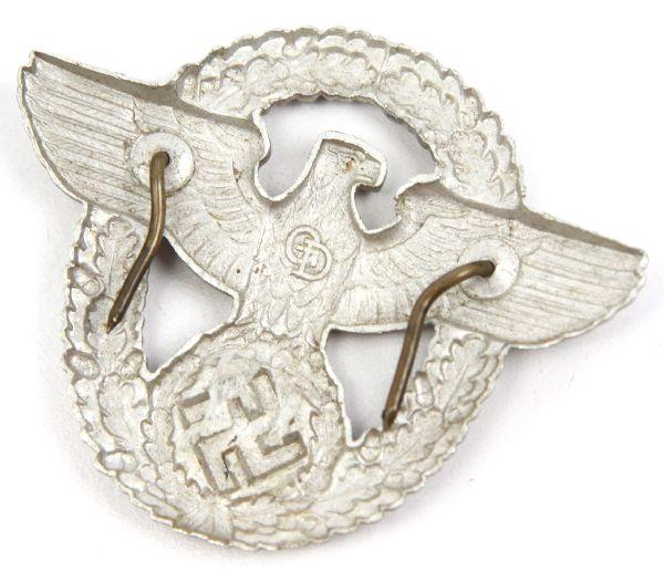 Aluminum SS belt buckle with good details. SS and RZM stamped 822/38. Good condition with some service wear. 2.25x1.75 inch aluminum German police badge with makers mark "GD". Very good condition.
