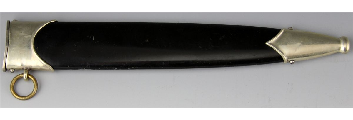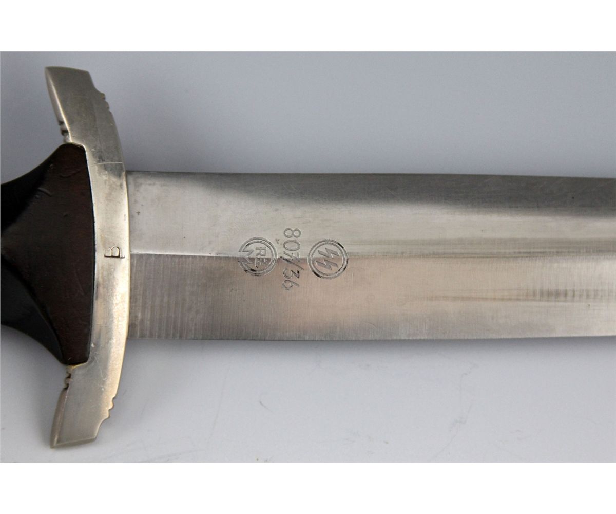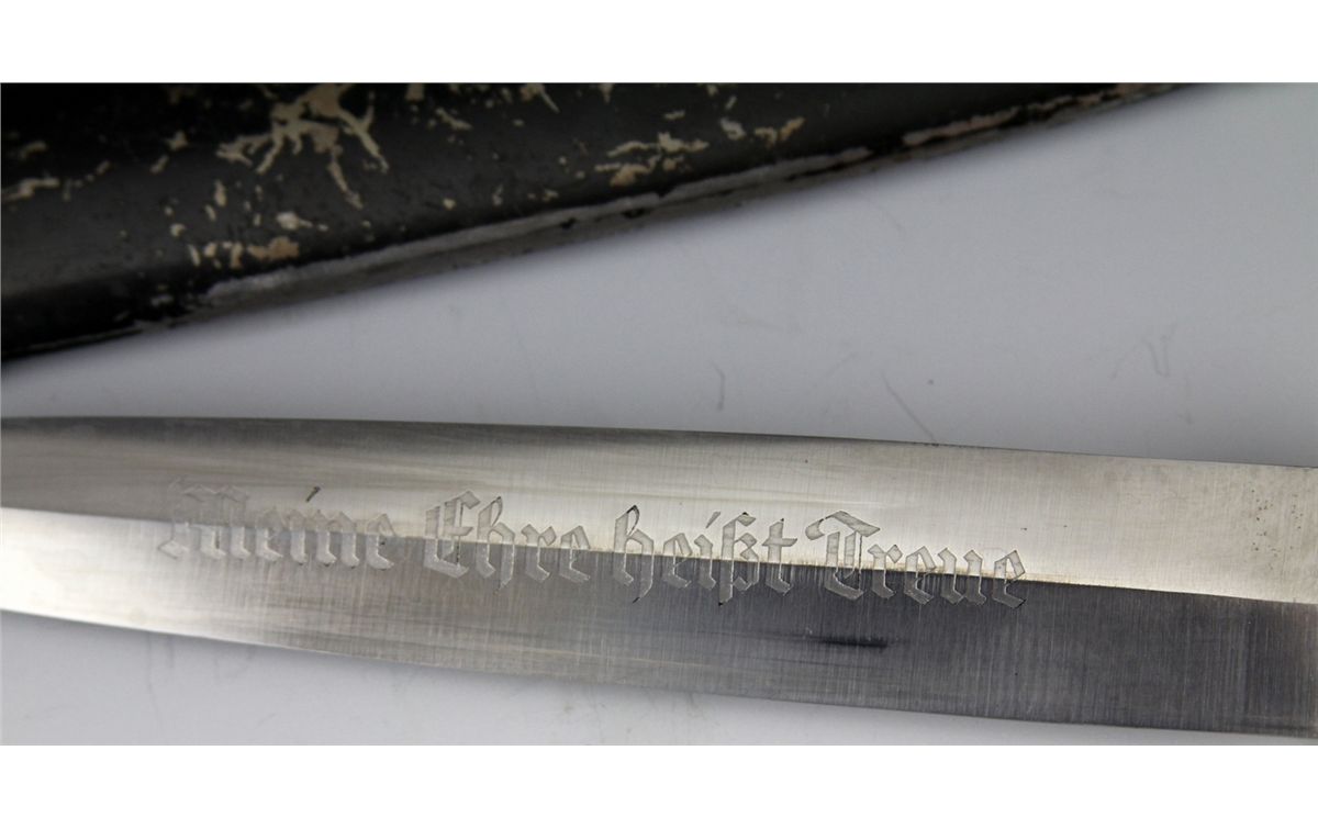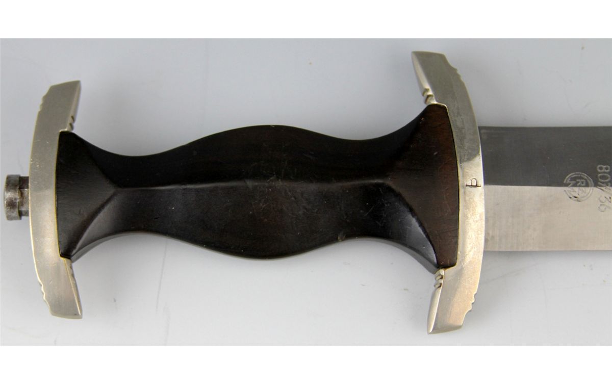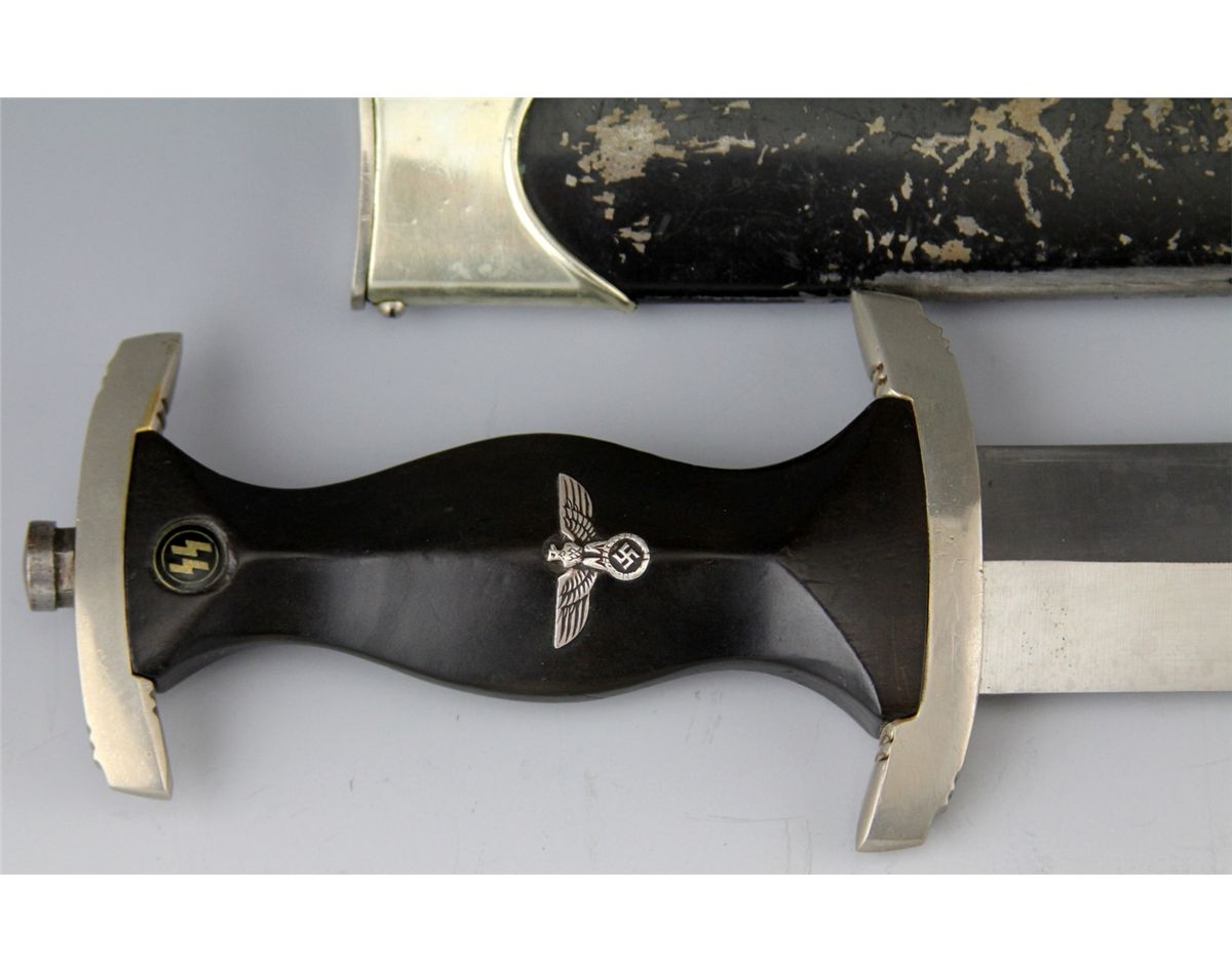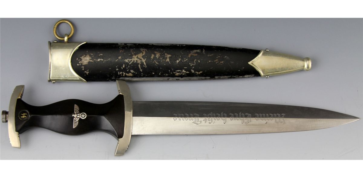 WWII GERMAN SS DAGGER RZM Type: Dagger Country: Germany Blade Length: 8.75" Overall Length: 13.5" Condition: Very good with minor wear and discoloration. Some paint loss to scabbard.