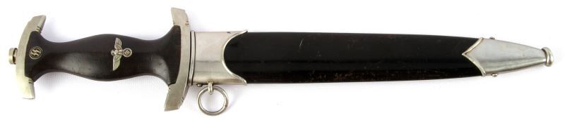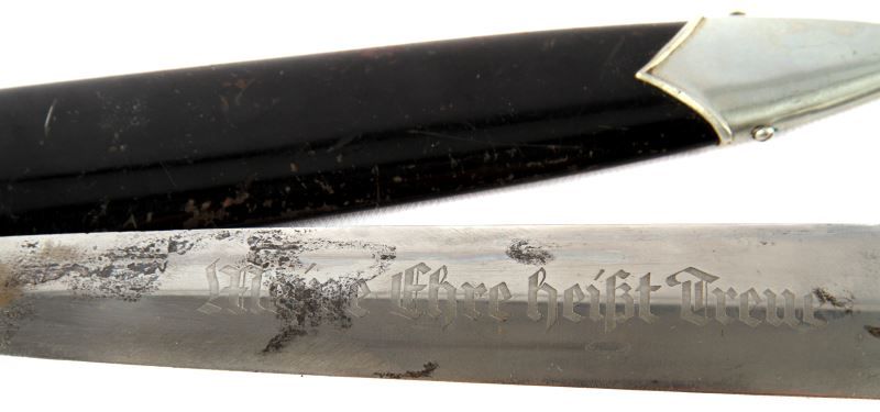 WWII German SS dress dagger, maker marked A Schuttelhofer & Co, Solingen-Wald. Significant pitting marks and some burs to end of blade, and some crushing to finial on chape of scabbard. Grip and fittings are good and tight. Enamel on scabbard about 80%. Overall good condition.