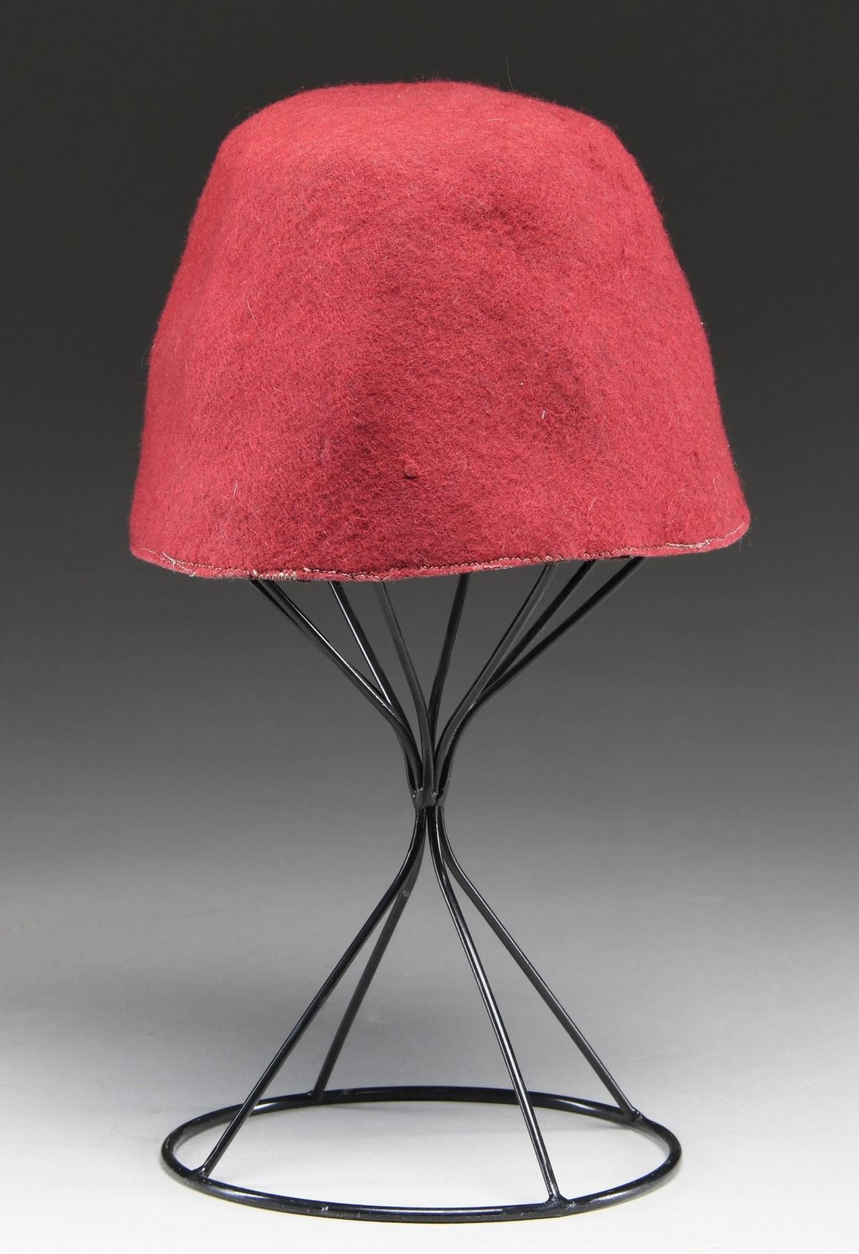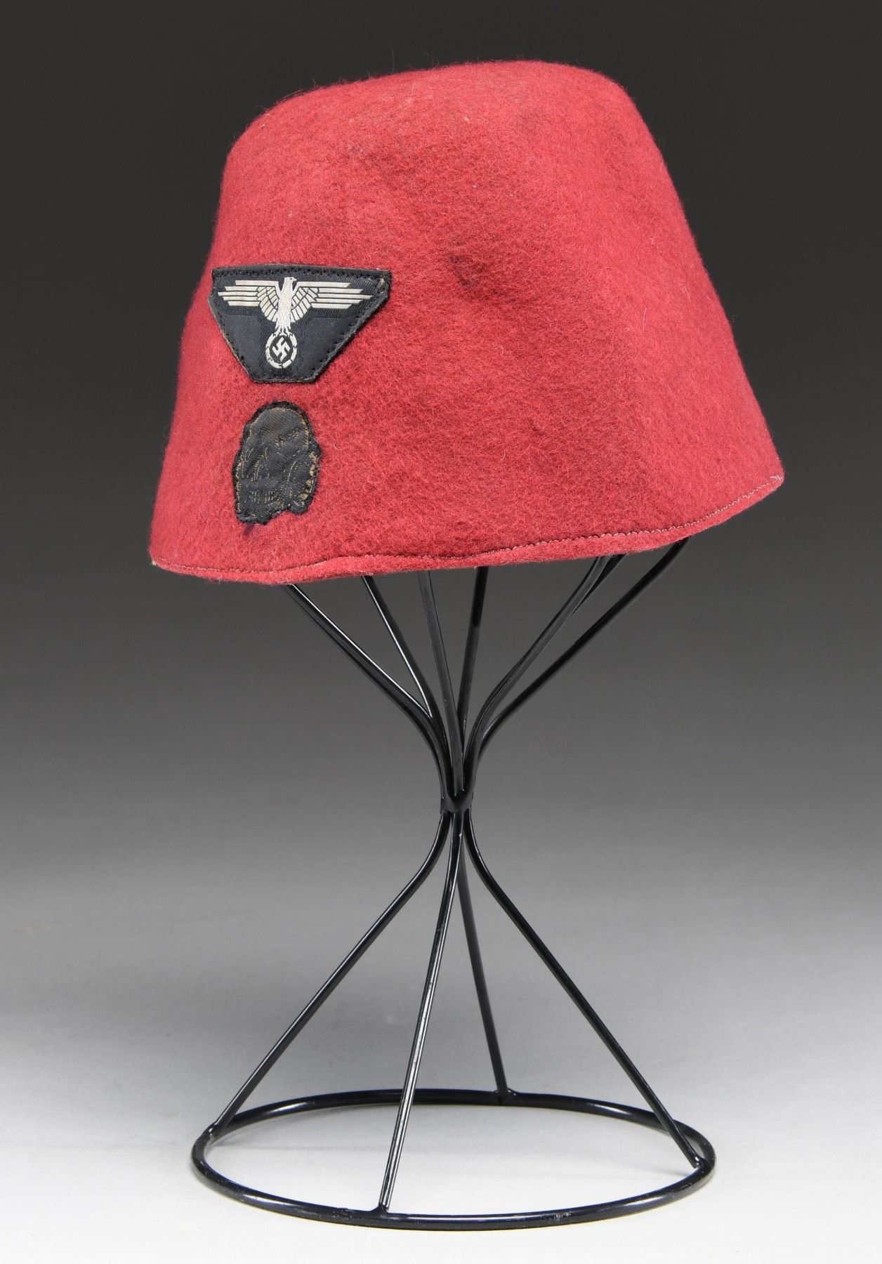 This red wool fez, in our opinion, is a post-war production and should be considered a reproduction. It does show wear and insect damage, nonetheless, we feel it is not of the period. The body of the fez is a medium red wool with a cloth SS eagle and death's head insignia on the front. Brown leather sweatband with no interior markings. CONDITION: hat shows light to moderate wear throughout with traces of insect damage. The sweatband is sewn but shows glue residue on the reverse. There is also an area of rodent damage. (02-25515/BF). NON-GUN. $150-300.