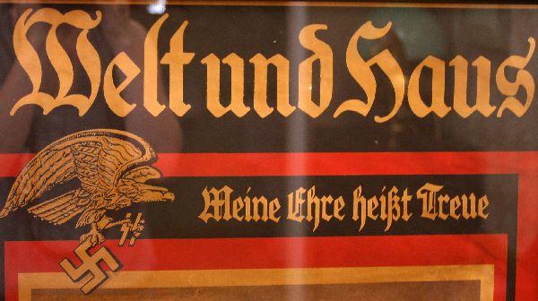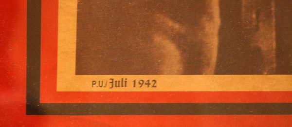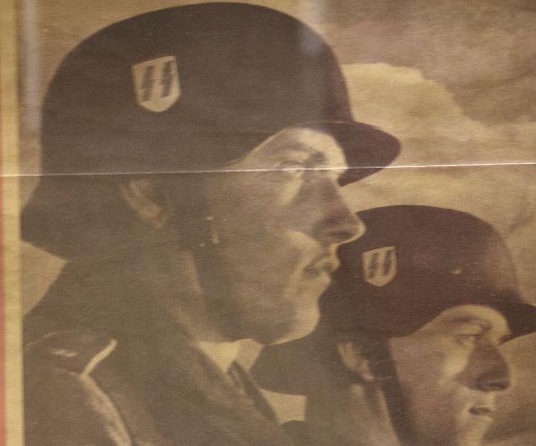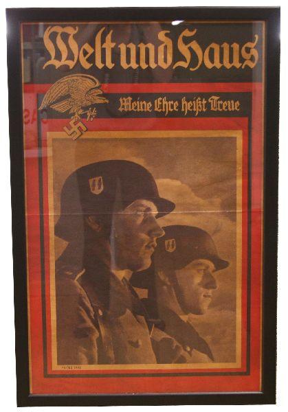 Framed 23.5x36 inch poster of a 1942 cover of the German publication "Welt und Haus". Poster depicts two German soldiers, the SS eagle and the SS slogan "My honor is loyalty". Overall very good condition with a heavy crease across the center and toning of the paper.