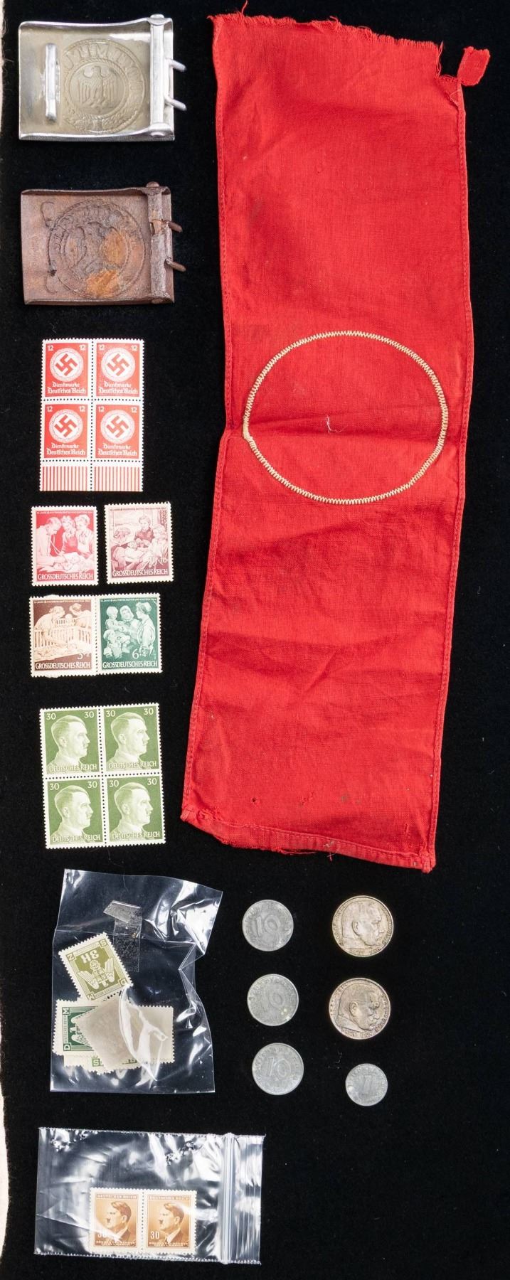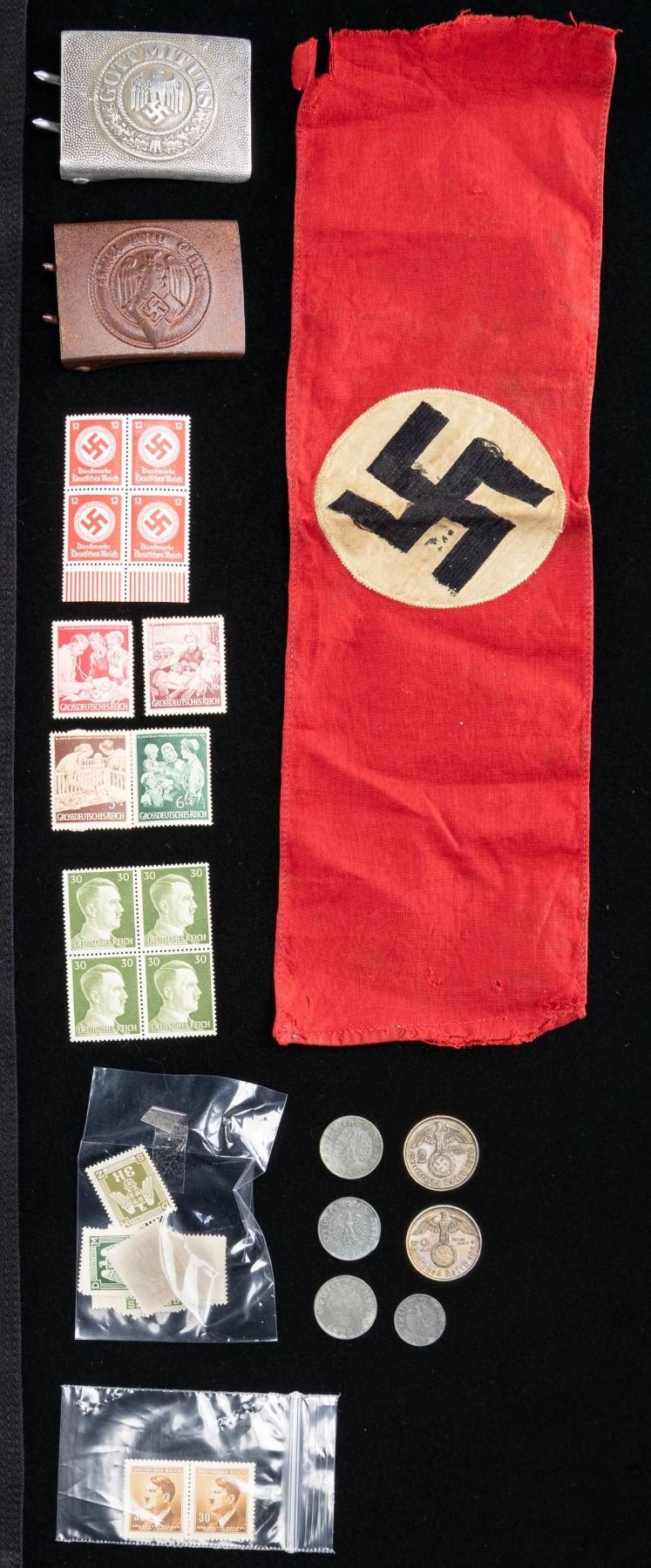 WWII GERMAN STAMPS, FLAG, BUCKLES, ARMBAND & MORE.