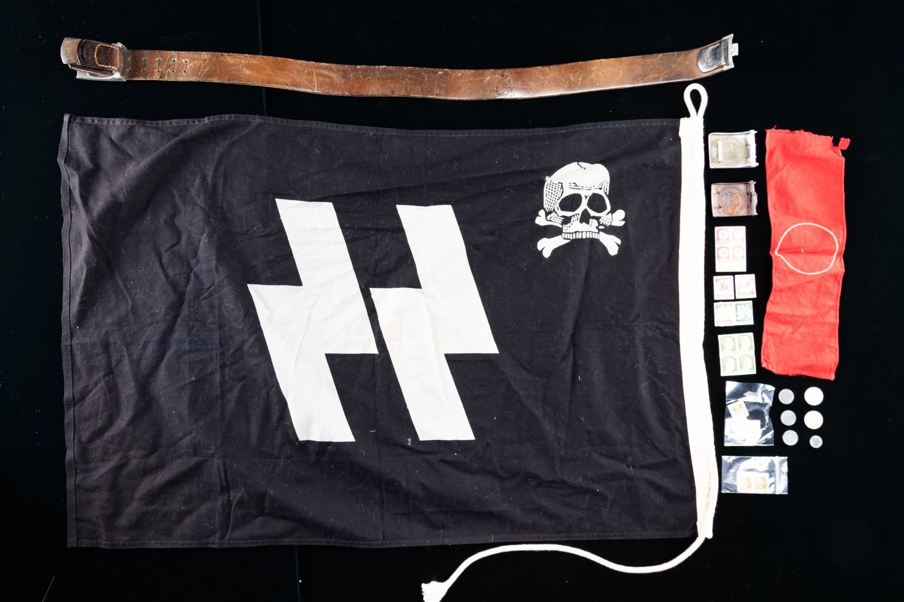 This lot includes 1 Party armband (cut). / 1 Aluminum Army belt buckle with belt. / 1 Excavated HJ belt buckle. / 1 Aluminum Army belt buckle. / 2 Silver 2 mark coins. / 4 Zinc coins. / 1 SS flag measuring 23" x 36" of unknown age and origin. Black and white flag has a central "SS" with a death's head in the canton. Cotton lanyard with cotton hoist marked "60 x 90" & "M9/26". / 29 Stamps of various types and styles. CONDITION: all items show light wear except as noted above. (02-24135/BF). NON-GUN. $500-700.