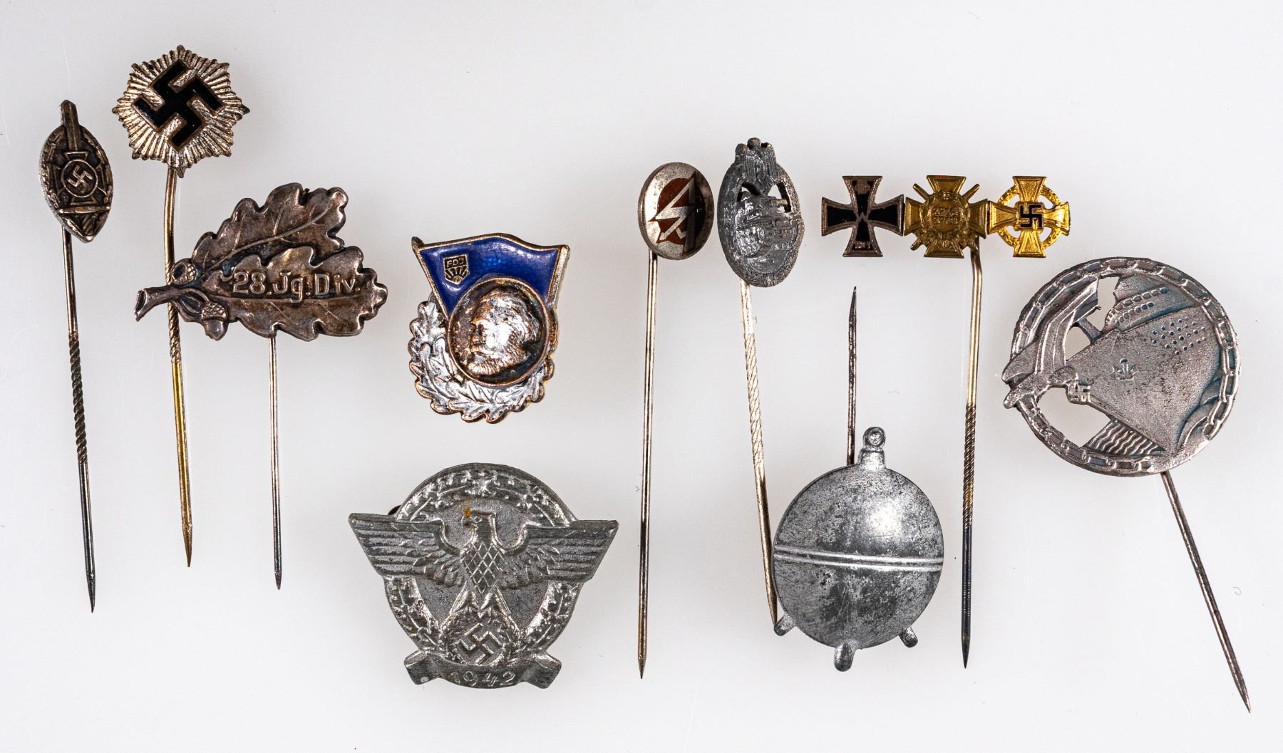 Lot of ten pins of SA, 28th Jager Division, Kriegsmarine, and miniature medals. Sold as-is.