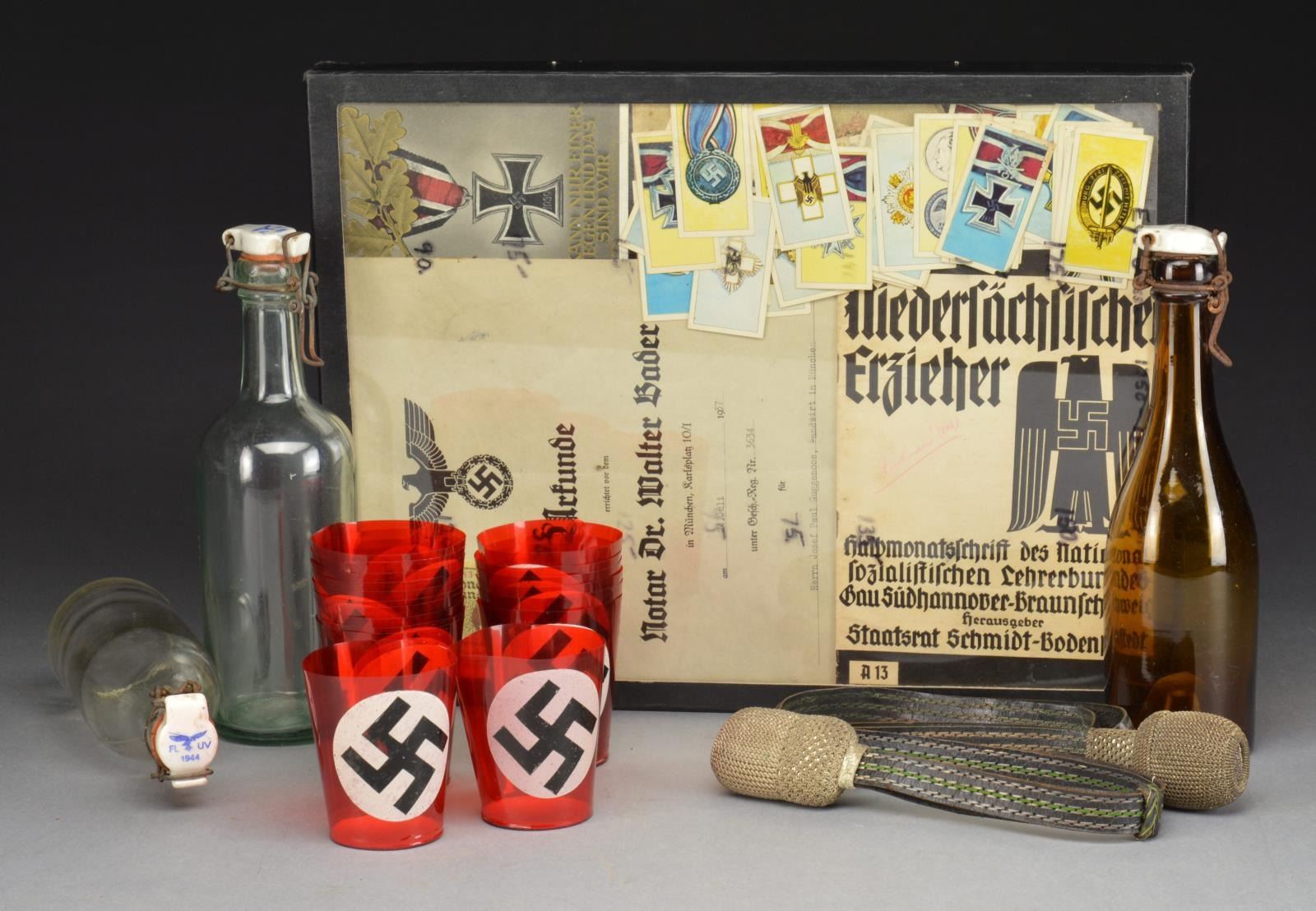 BOTTLES, DOCUMENTS & MORE. This varied lot of WWII German items includes 2 unissued sword knots that appear to be for police swords. Green leather thongs showing 3 bullion stripes & silver bullion knots at the end. / 18 Candle cup lights made of red cellophane printed w/ a black Party symbol on a white field having a card board base. These were used as Christmas lights & also during patriotic parades. A sm. candle was placed on the inside to give a red glow around the room. / 3 Bottles w/ porcelain stoppers marked w/ a Luftwaffe eagle & the letters, “FL UV”. 2 Bottles are dated 1944 & 1 is dated 1943. / Lg. assortment of cigarette cards showing WWII German military awards. / Group of currency. / A lg. Nazi document. / Pamphlet titled, “Niedersachsischer Erzieher”. / Postcard w/ a knight’s cross motif. CONDITION: all items show very light wear. Candle lights appear unused. (02-14729/BF). $400-600.