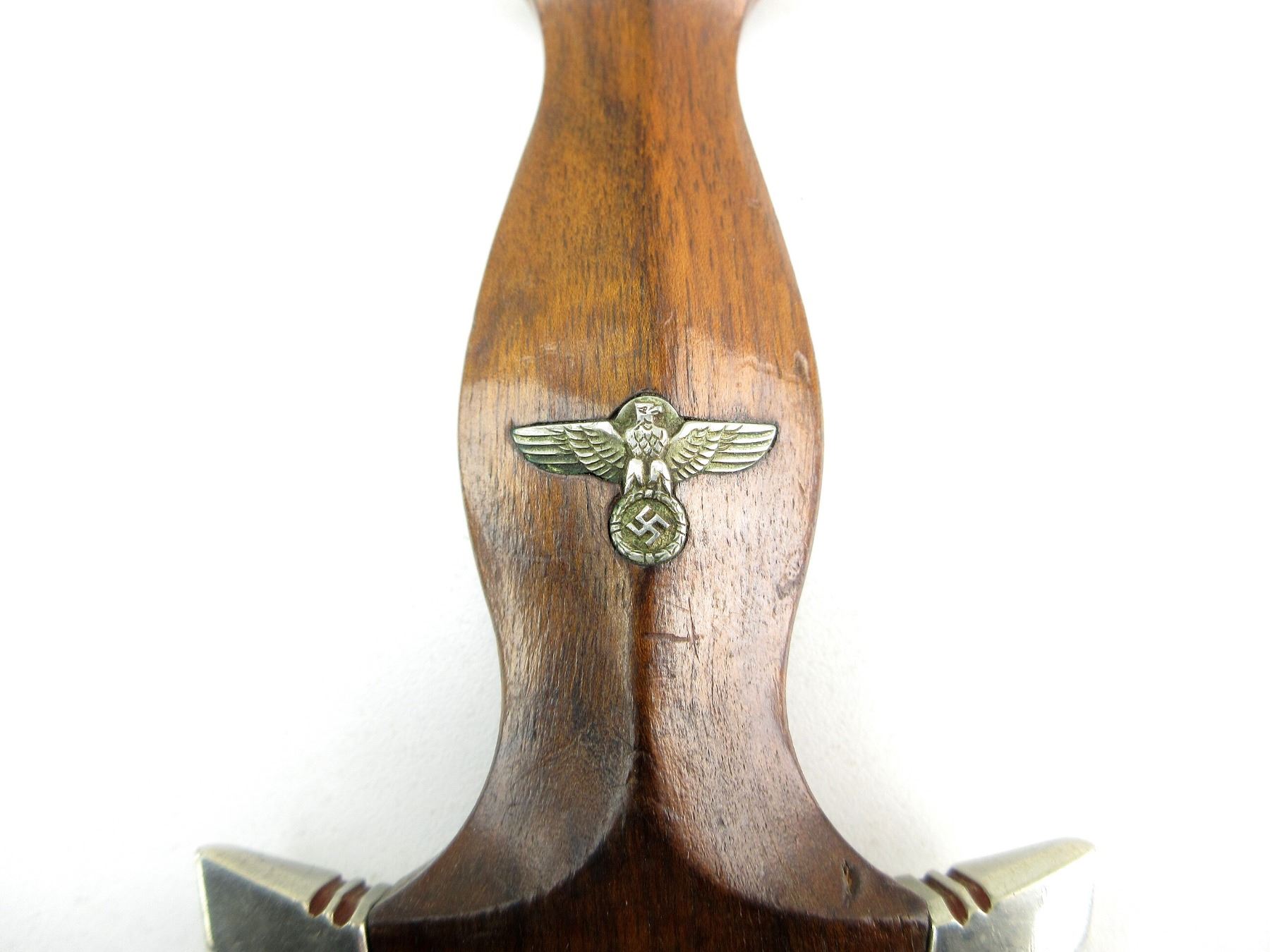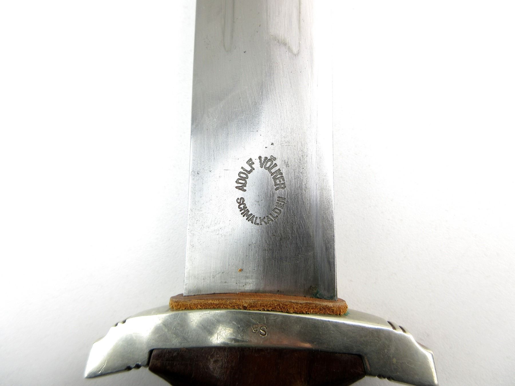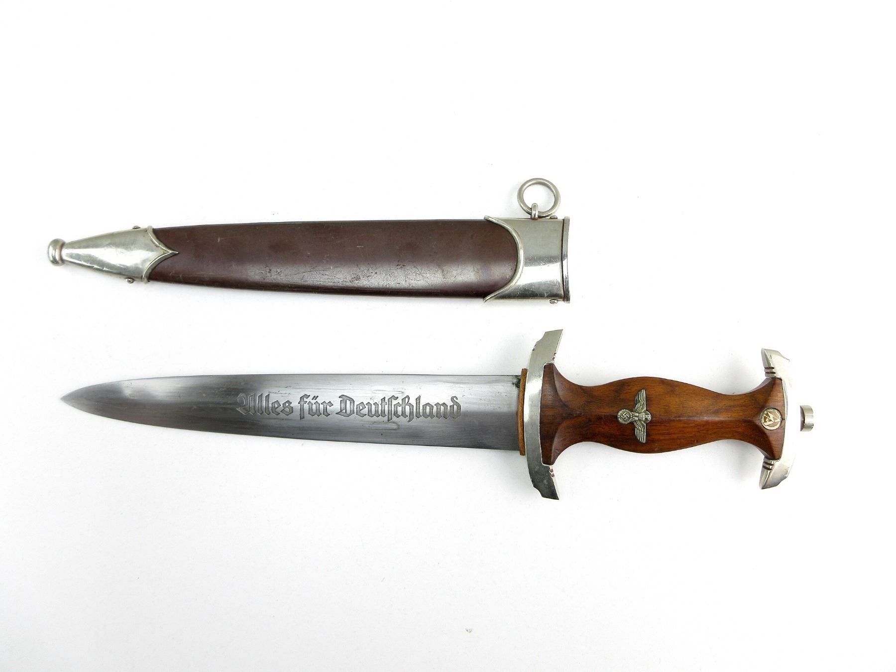 (1) DOUBLE-EDGED DAGGER, RICASSO MARKED: "ADOLF VOLKER, SCHMALKALDEN" (MANUFACTURER), BLADE MARKED: "ALLES FUR DEUTSCHLAND", LEATHER WASHER / BUFFER PAD, CROSS-GUARD MARKED: "SA", WOOD GRIP WITH MEDALLIONS, METAL POMMEL, NO VISIBLE MARKINGS, BROWN PAINTED STEEL SCABBARD WITH SILVER THROAT / TIP, THROAT HAS METAL RING, NO VISIBLE MARKINGS, BLADE APPROX. 8 5/8" & OAL APPROX. 13.5". SEE PHOTOS.