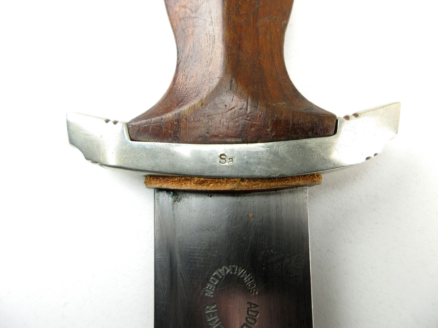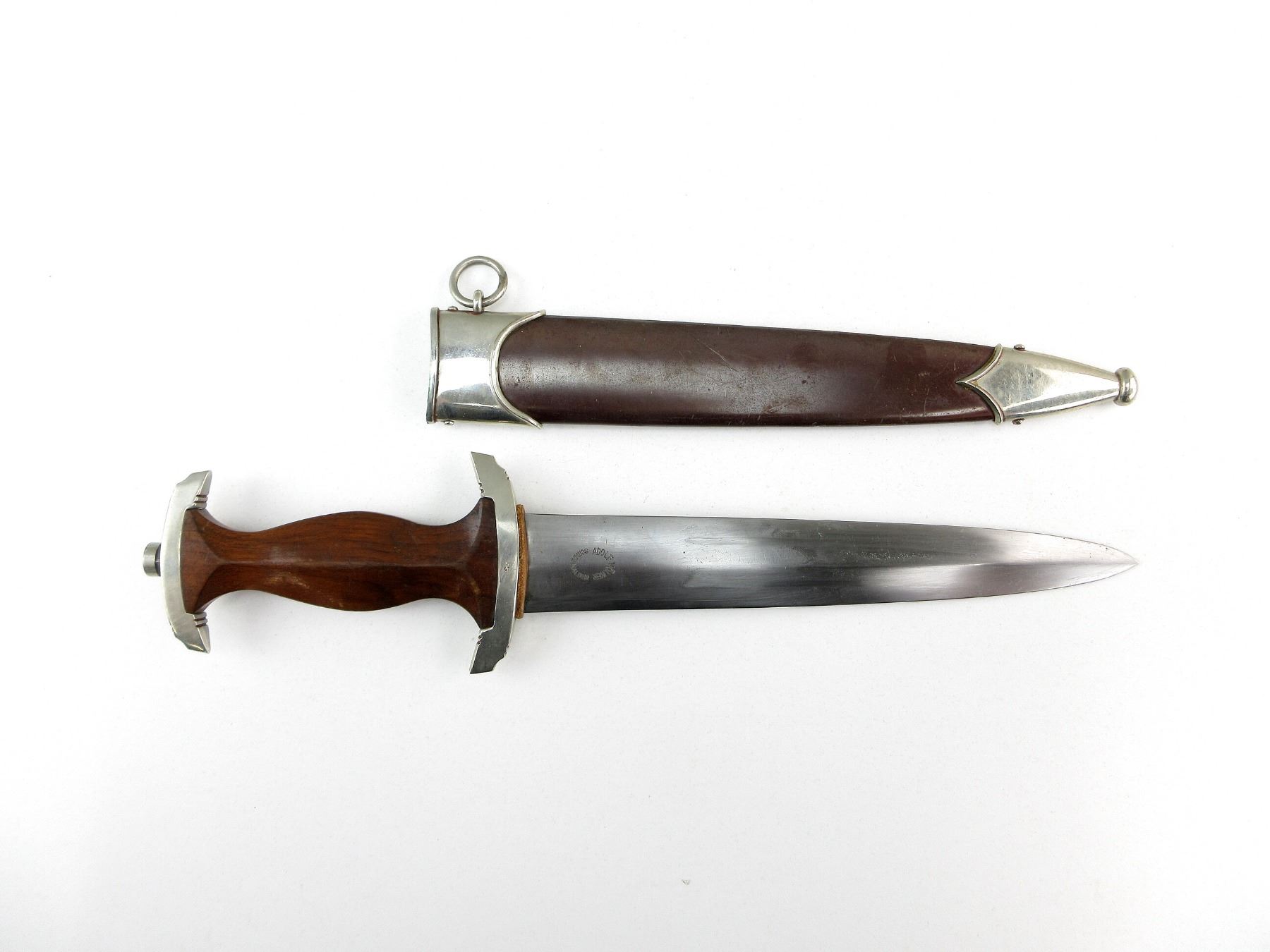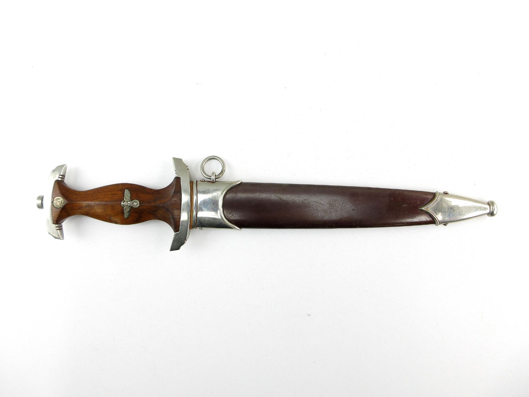 (1) DOUBLE-EDGED DAGGER, RICASSO MARKED: "ADOLF VOLKER, SCHMALKALDEN" (MANUFACTURER), BLADE MARKED: "ALLES FUR DEUTSCHLAND", LEATHER WASHER / BUFFER PAD, CROSS-GUARD MARKED: "SA", WOOD GRIP WITH MEDALLIONS, METAL POMMEL, NO VISIBLE MARKINGS, BROWN PAINTED STEEL SCABBARD WITH SILVER THROAT / TIP, THROAT HAS METAL RING, NO VISIBLE MARKINGS, BLADE APPROX. 8 5/8" & OAL APPROX. 13.5". SEE PHOTOS.