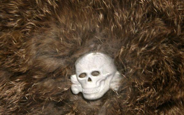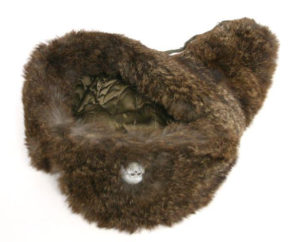 WWII German Waffen SS fur lined wool winter hat from the Russian Front. Green wool, with fur lining, and fabric lining inside top, and totenkopf skull on front. Faded date on inside 1943, size 57. Skull insignia is RZM marked on back. Repair to wool is visible on top, and minor tears and holes on inside fabric. Fur is delicate. Overall very good condition.
