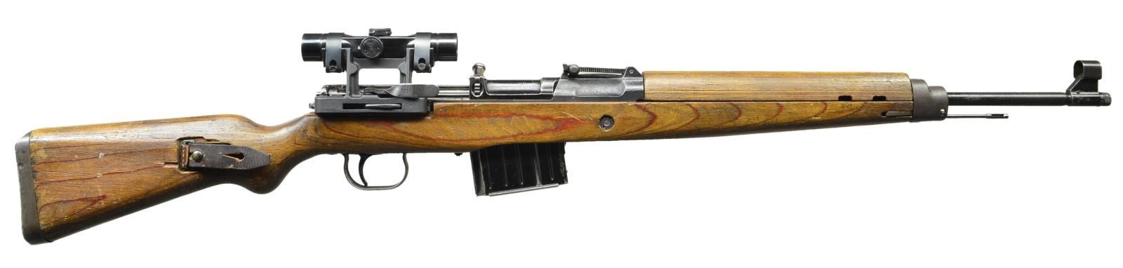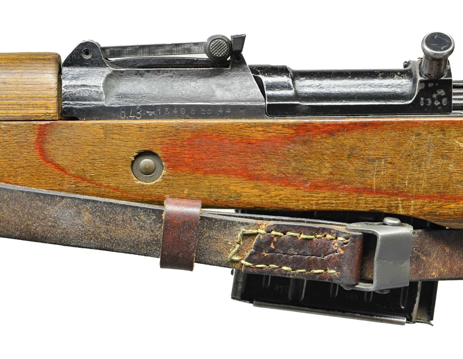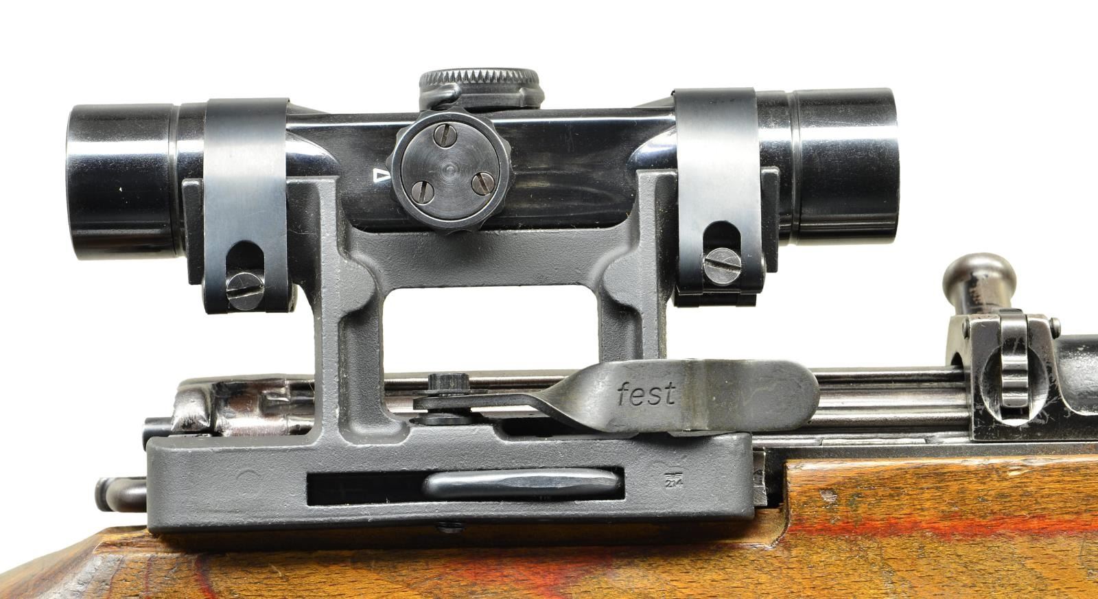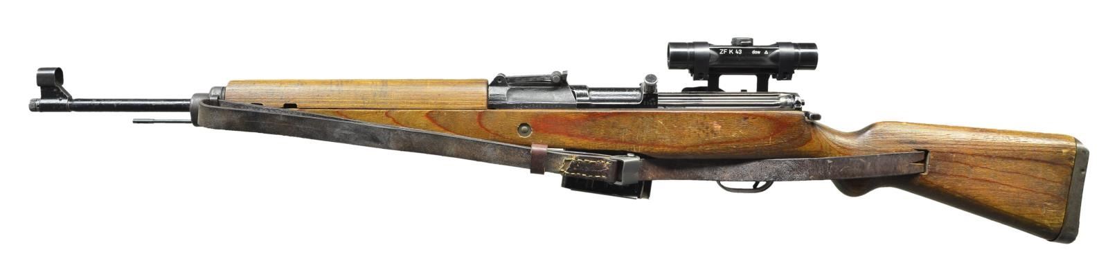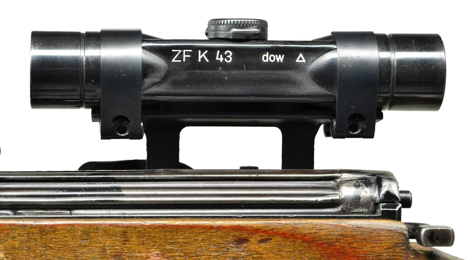 Cal. 8mm Mauser. S# 1340c. Bbl. 21 3/4" w/ threaded muzzle. Ac44 coded receiver w/ German eagle, serial number & "G.43" marking. Matching stamped numbers on bolt & charging handle. Electropencil matching firing pin housing & locking lugs. Rifle fitted with Apfeltor gas piston & shooters kit. No dust cover present. Tangent rear sight graduated to 1200m. Blade front sight w/ hood. Reproduction ZF4 scope & mount. ZF4 scope has post w/ very good plus optics. Unnumbered laminated stock & handguard w/ indiscernible Waffenamt on wrist. Nose of stock appears to be missing a bit of wood, as bandkeeper protrudes outward a couple inches. Left side sling provision w/ black leather sling. Cleaning rod present. MAGS; 2-10 rd. one reproduction & one original marked "aye" & "G43". UNATTACHED ACCESSORIES: reproduction leather lens caps, original gas piston w/ 2 spring, Allen wrench & Apfeltor instruction sheet. CONDITION: stock set has a 1 1/2" crack on right side of recoil bolt, a chip near right sling cut, scattered dings & handling marks. There is a patch of moderate tool marks on bbl. near gas piston. Metal otherwise retains 65% black enamel & phosphate finishes w/ scattered flaking. Good bore w/ some frosting & light pitting but strong rifling. (22-3349/MJC). CURIO. $3500-4500.