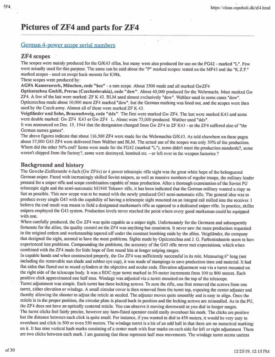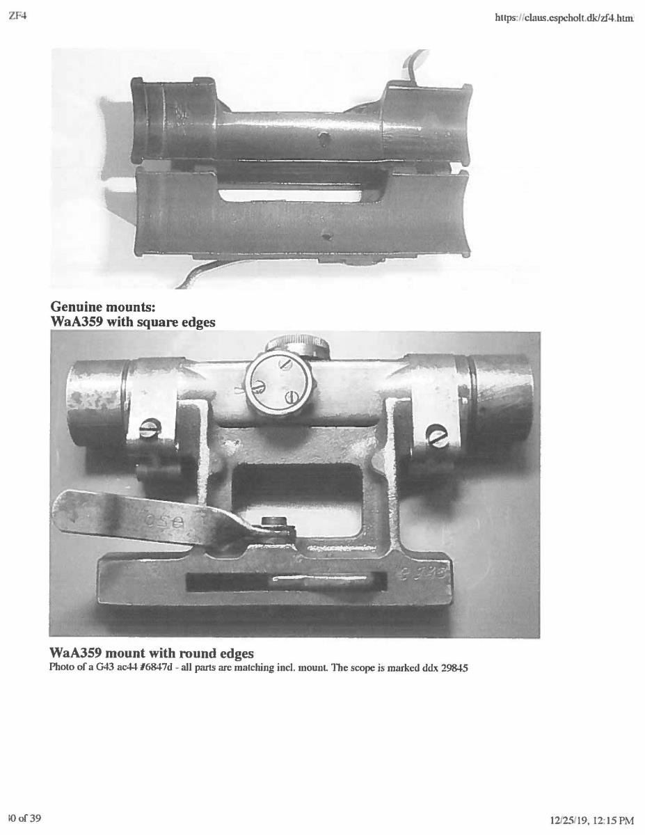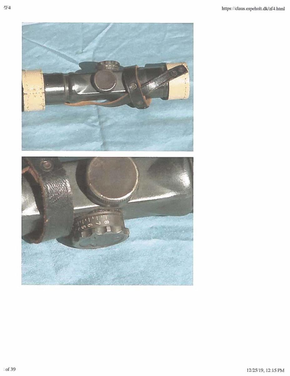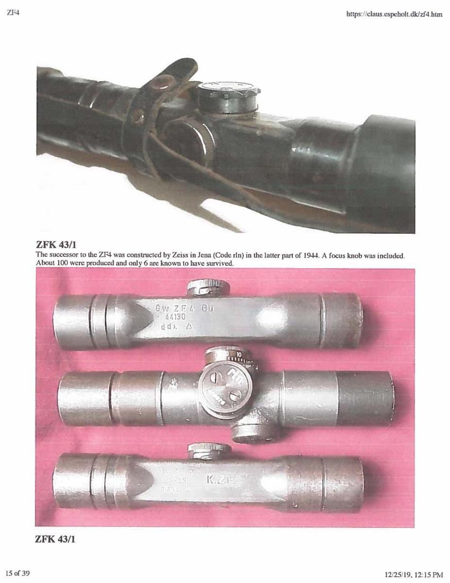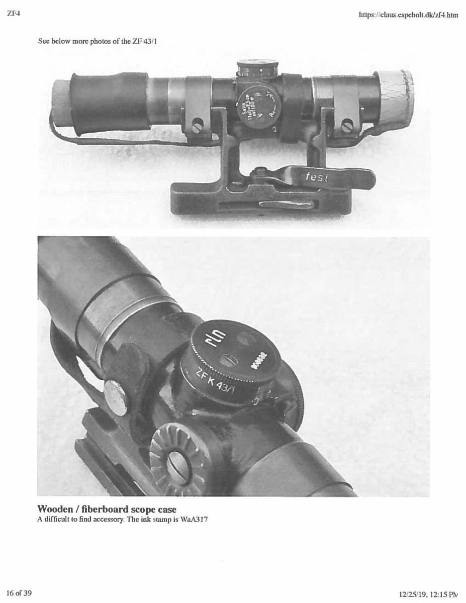 Cal. 8mm Mauser. S# 1340c. Bbl. 21 3/4" w/ threaded muzzle. Ac44 coded receiver w/ German eagle, serial number & "G.43" marking. Matching stamped numbers on bolt & charging handle. Electropencil matching firing pin housing & locking lugs. Rifle fitted with Apfeltor gas piston & shooters kit. No dust cover present. Tangent rear sight graduated to 1200m. Blade front sight w/ hood. Reproduction ZF4 scope & mount. ZF4 scope has post w/ very good plus optics. Unnumbered laminated stock & handguard w/ indiscernible Waffenamt on wrist. Nose of stock appears to be missing a bit of wood, as bandkeeper protrudes outward a couple inches. Left side sling provision w/ black leather sling. Cleaning rod present. MAGS; 2-10 rd. one reproduction & one original marked "aye" & "G43". UNATTACHED ACCESSORIES: reproduction leather lens caps, original gas piston w/ 2 spring, Allen wrench & Apfeltor instruction sheet. CONDITION: stock set has a 1 1/2" crack on right side of recoil bolt, a chip near right sling cut, scattered dings & handling marks. There is a patch of moderate tool marks on bbl. near gas piston. Metal otherwise retains 65% black enamel & phosphate finishes w/ scattered flaking. Good bore w/ some frosting & light pitting but strong rifling. (22-3349/MJC). CURIO. $3500-4500.