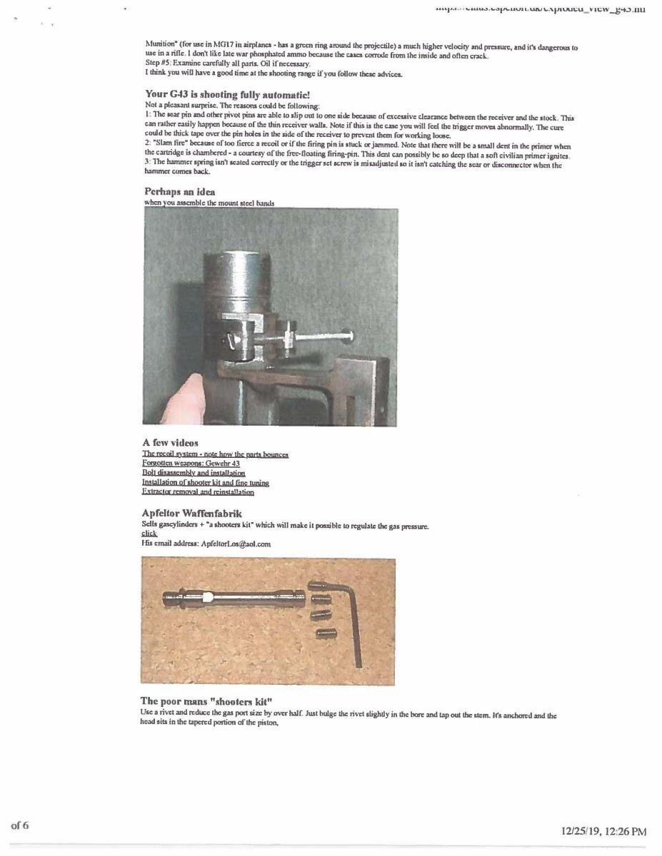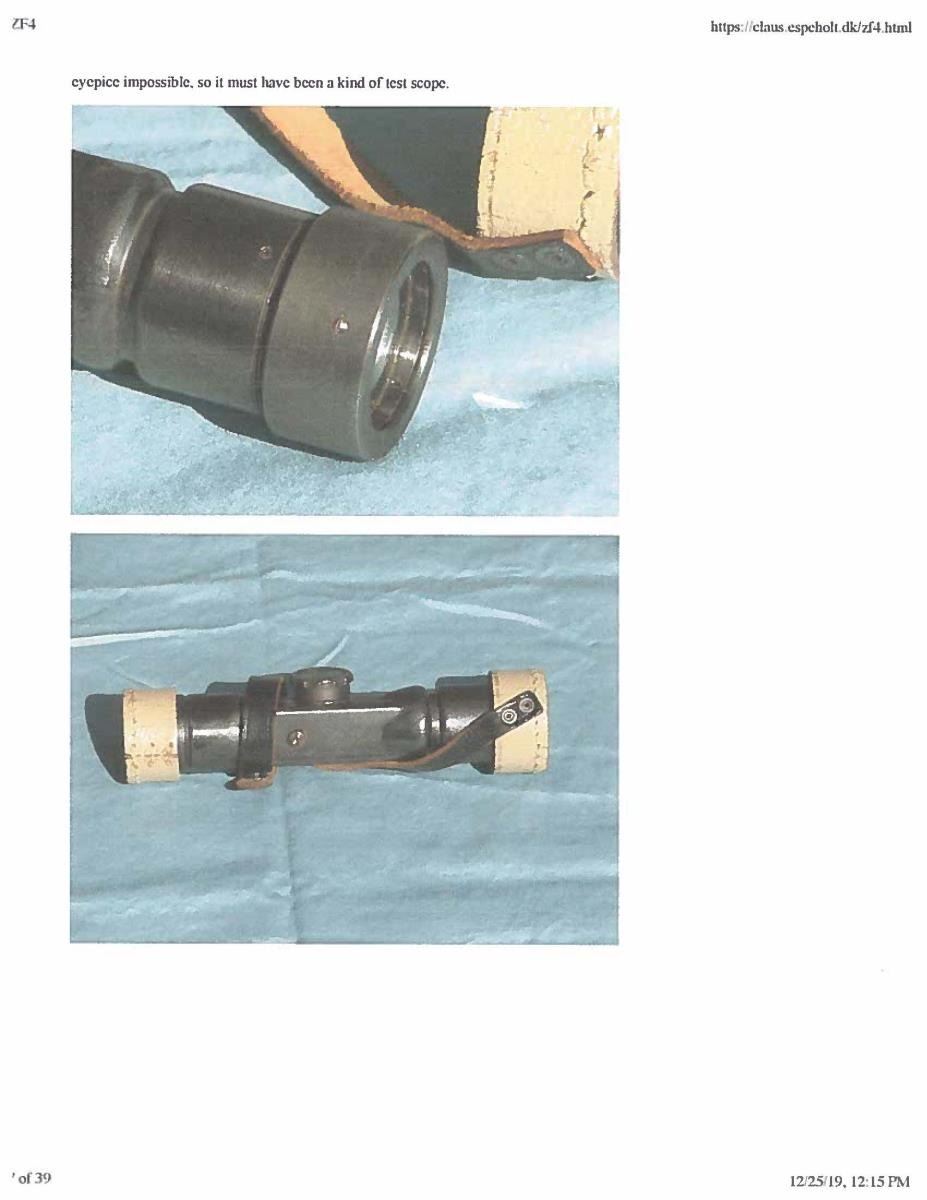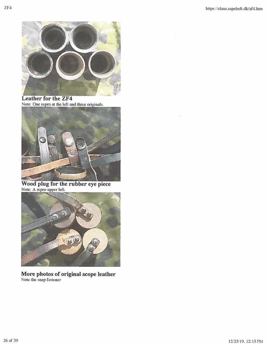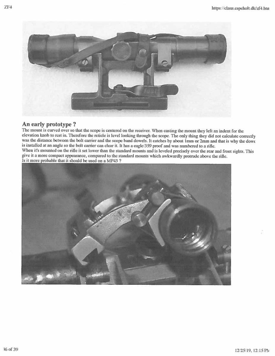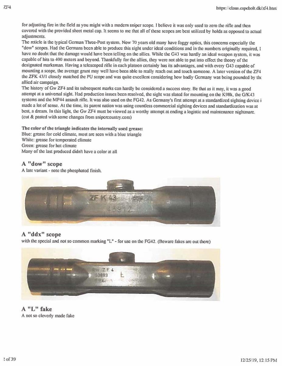 Cal. 8mm Mauser. S# 1340c. Bbl. 21 3/4" w/ threaded muzzle. Ac44 coded receiver w/ German eagle, serial number & "G.43" marking. Matching stamped numbers on bolt & charging handle. Electropencil matching firing pin housing & locking lugs. Rifle fitted with Apfeltor gas piston & shooters kit. No dust cover present. Tangent rear sight graduated to 1200m. Blade front sight w/ hood. Reproduction ZF4 scope & mount. ZF4 scope has post w/ very good plus optics. Unnumbered laminated stock & handguard w/ indiscernible Waffenamt on wrist. Nose of stock appears to be missing a bit of wood, as bandkeeper protrudes outward a couple inches. Left side sling provision w/ black leather sling. Cleaning rod present. MAGS; 2-10 rd. one reproduction & one original marked "aye" & "G43". UNATTACHED ACCESSORIES: reproduction leather lens caps, original gas piston w/ 2 spring, Allen wrench & Apfeltor instruction sheet. CONDITION: stock set has a 1 1/2" crack on right side of recoil bolt, a chip near right sling cut, scattered dings & handling marks. There is a patch of moderate tool marks on bbl. near gas piston. Metal otherwise retains 65% black enamel & phosphate finishes w/ scattered flaking. Good bore w/ some frosting & light pitting but strong rifling. (22-3349/MJC). CURIO. $3500-4500.