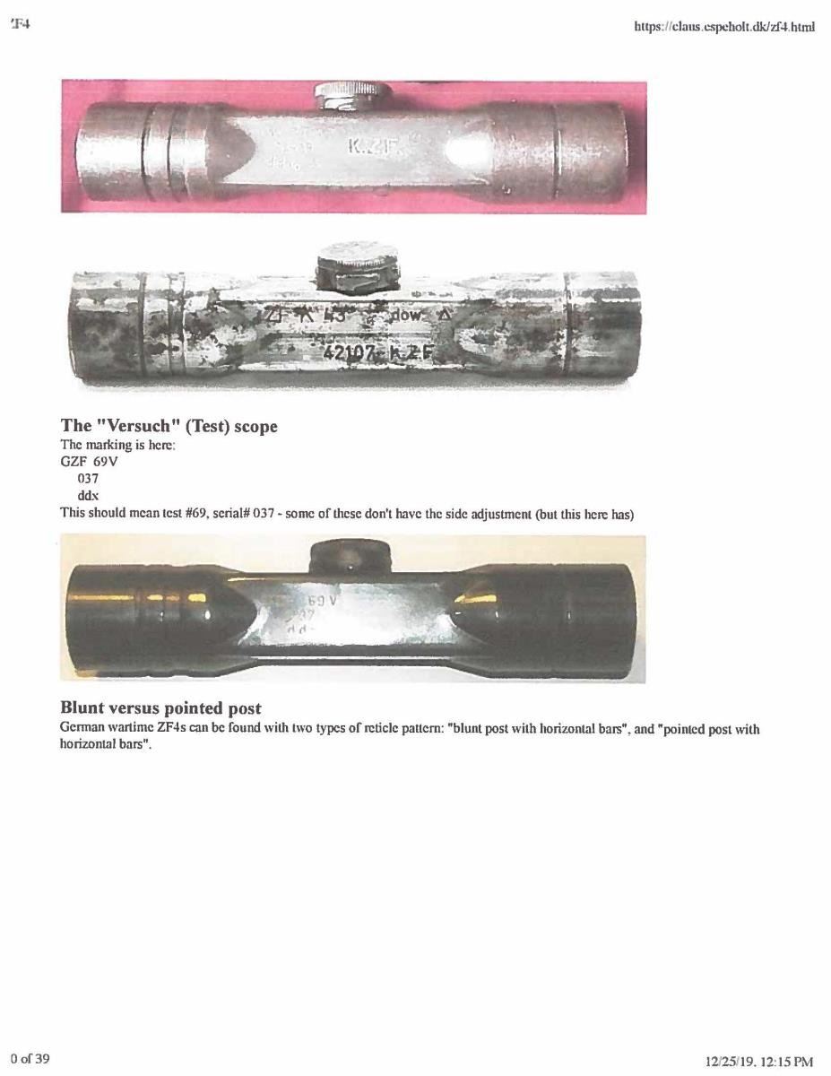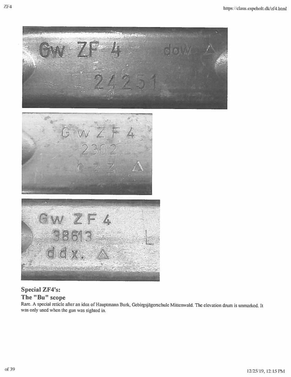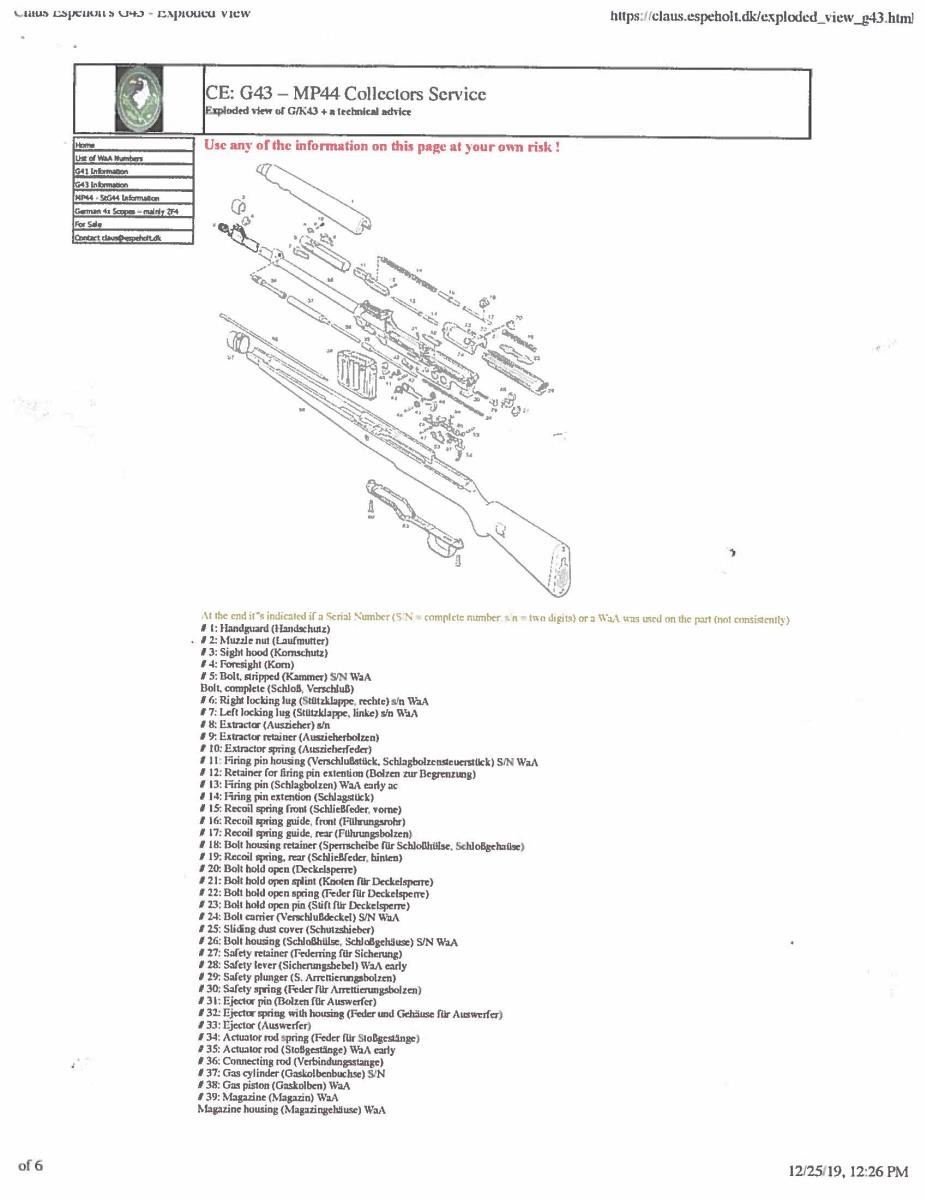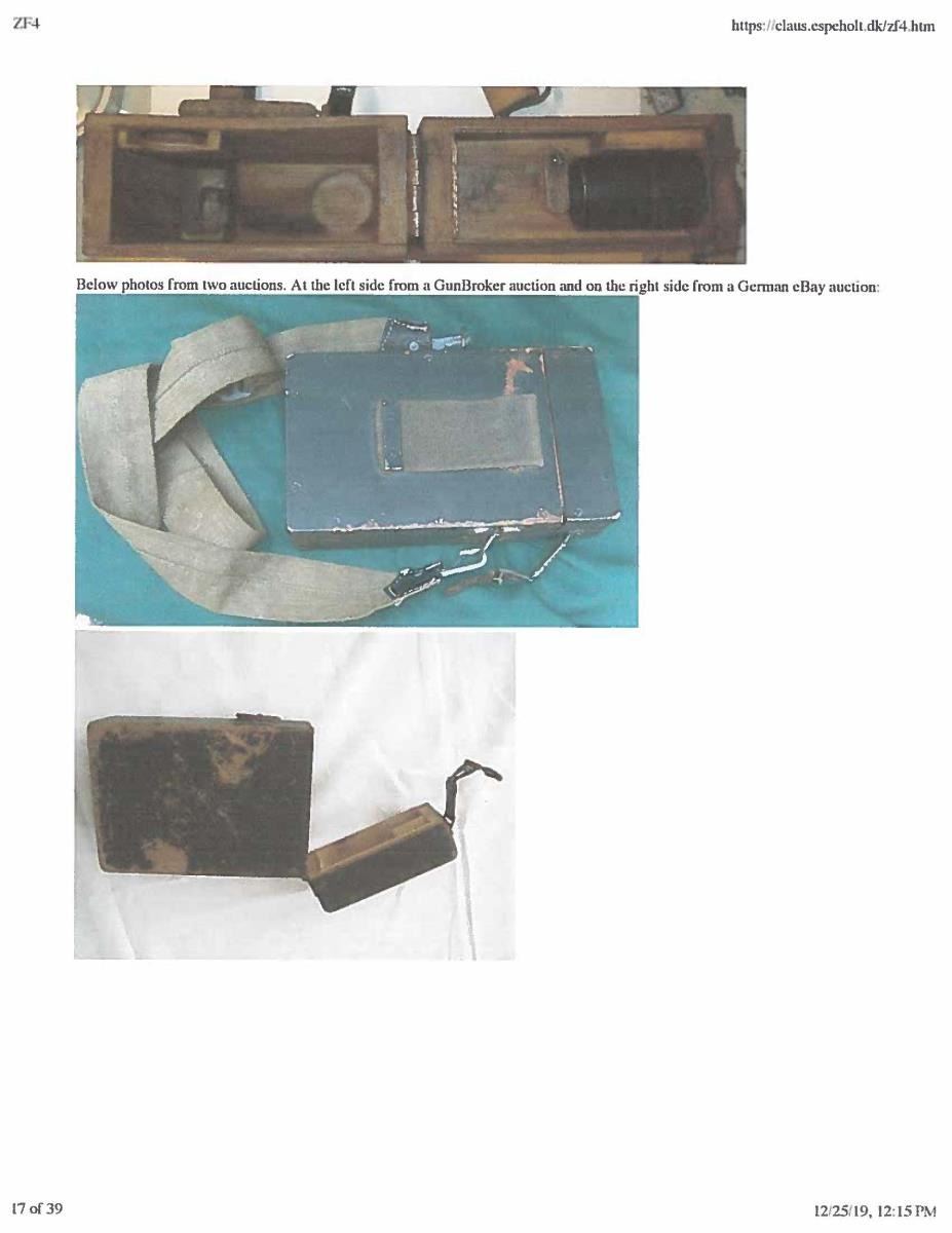 Cal. 8mm Mauser. S# 1340c. Bbl. 21 3/4" w/ threaded muzzle. Ac44 coded receiver w/ German eagle, serial number & "G.43" marking. Matching stamped numbers on bolt & charging handle. Electropencil matching firing pin housing & locking lugs. Rifle fitted with Apfeltor gas piston & shooters kit. No dust cover present. Tangent rear sight graduated to 1200m. Blade front sight w/ hood. Reproduction ZF4 scope & mount. ZF4 scope has post w/ very good plus optics. Unnumbered laminated stock & handguard w/ indiscernible Waffenamt on wrist. Nose of stock appears to be missing a bit of wood, as bandkeeper protrudes outward a couple inches. Left side sling provision w/ black leather sling. Cleaning rod present. MAGS; 2-10 rd. one reproduction & one original marked "aye" & "G43". UNATTACHED ACCESSORIES: reproduction leather lens caps, original gas piston w/ 2 spring, Allen wrench & Apfeltor instruction sheet. CONDITION: stock set has a 1 1/2" crack on right side of recoil bolt, a chip near right sling cut, scattered dings & handling marks. There is a patch of moderate tool marks on bbl. near gas piston. Metal otherwise retains 65% black enamel & phosphate finishes w/ scattered flaking. Good bore w/ some frosting & light pitting but strong rifling. (22-3349/MJC). CURIO. $3500-4500.