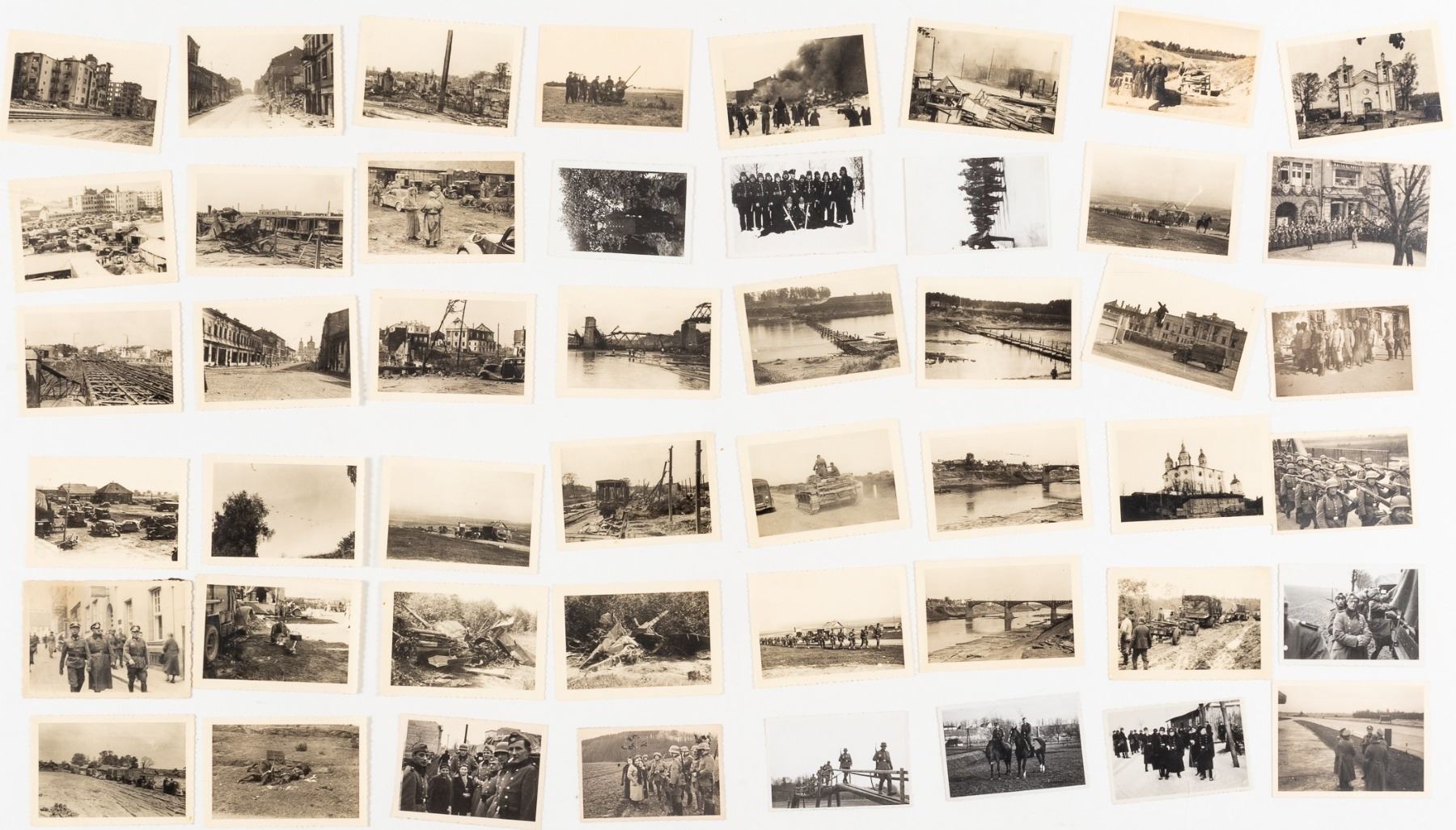 Lot of 60 photos of the German military during WWII. Photos show soldiers socializing, at the Eastern Front, in Kiev, in training, on the battlefield, Ukranian monuments, and scenic landscapes. Approx. 2.75 x 4 inches. Most photos have inscriptions, mounting remnants on verso.